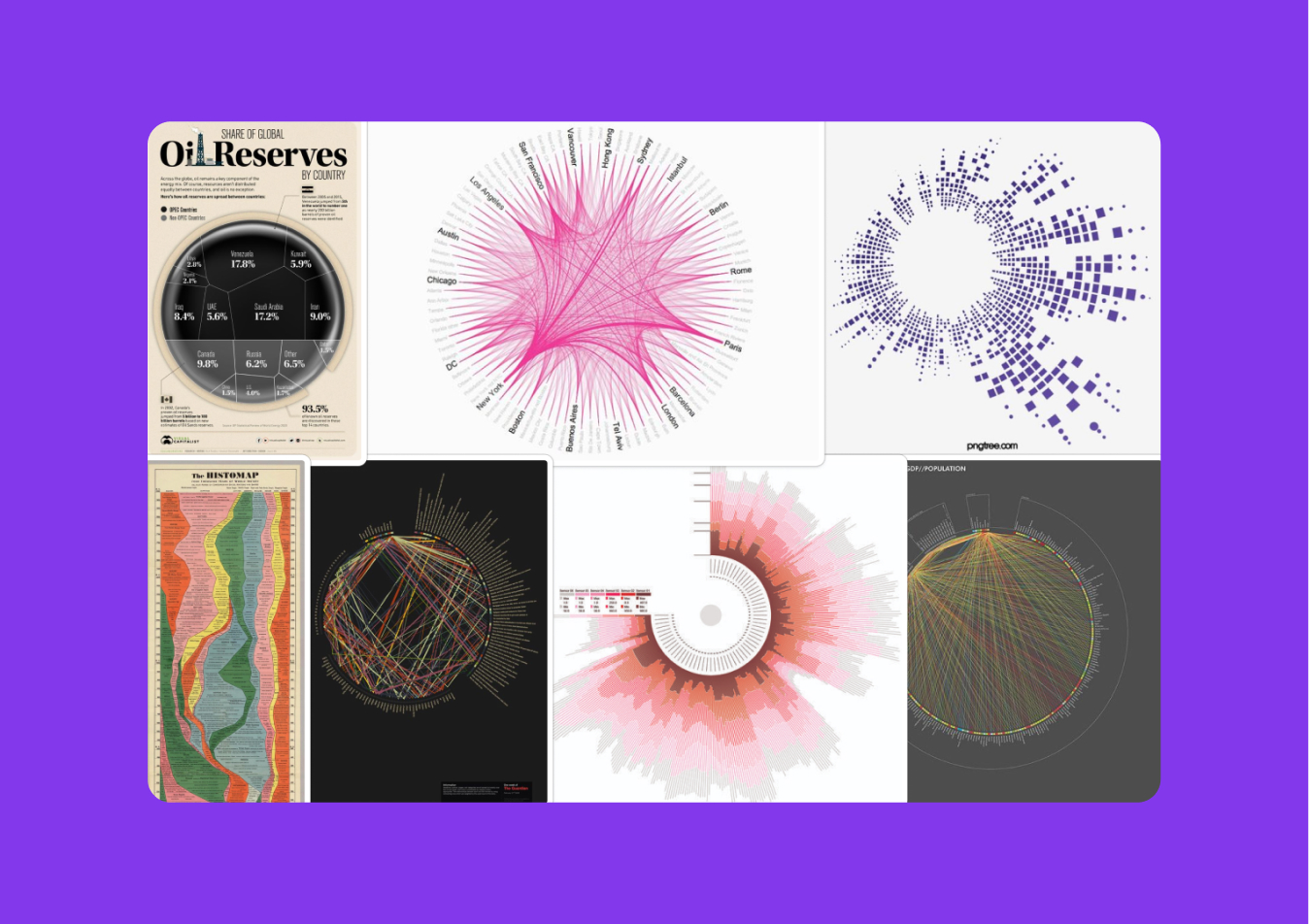 Um weitere Ideen zu finden, suchte ich Inspirationen in Datensätzen, die ich interessant fand. Deshalb erstellte ich ein Moodboard mit Beispielen, die mir gefallen haben und mich inspirierten.