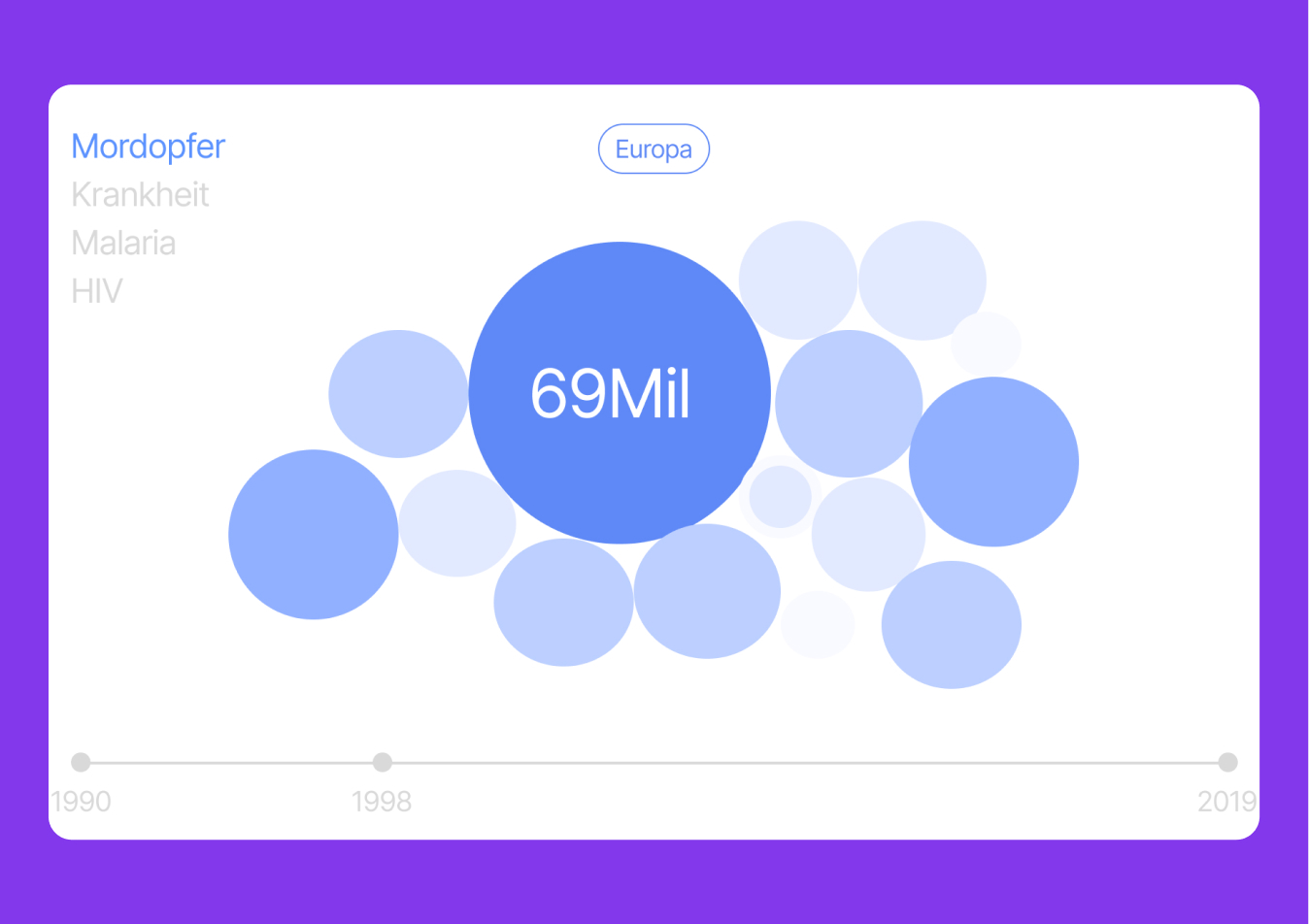 Daraufhin begann ich, in Figma einen Wireframe zu erstellen, der meiner Vorstellung entsprach. In diesem Wireframe platzierte ich unten einen Year Slider, mit dem man die Entwicklung der Todesursachenverhältnisse in den verschiedenen Ländern über die Jahre verfolgen kann. Oben links befindet sich eine Auswahlmöglichkeit für die Todesursachen, während oben in der Mitte die Auswahl des Kontinents möglich ist.