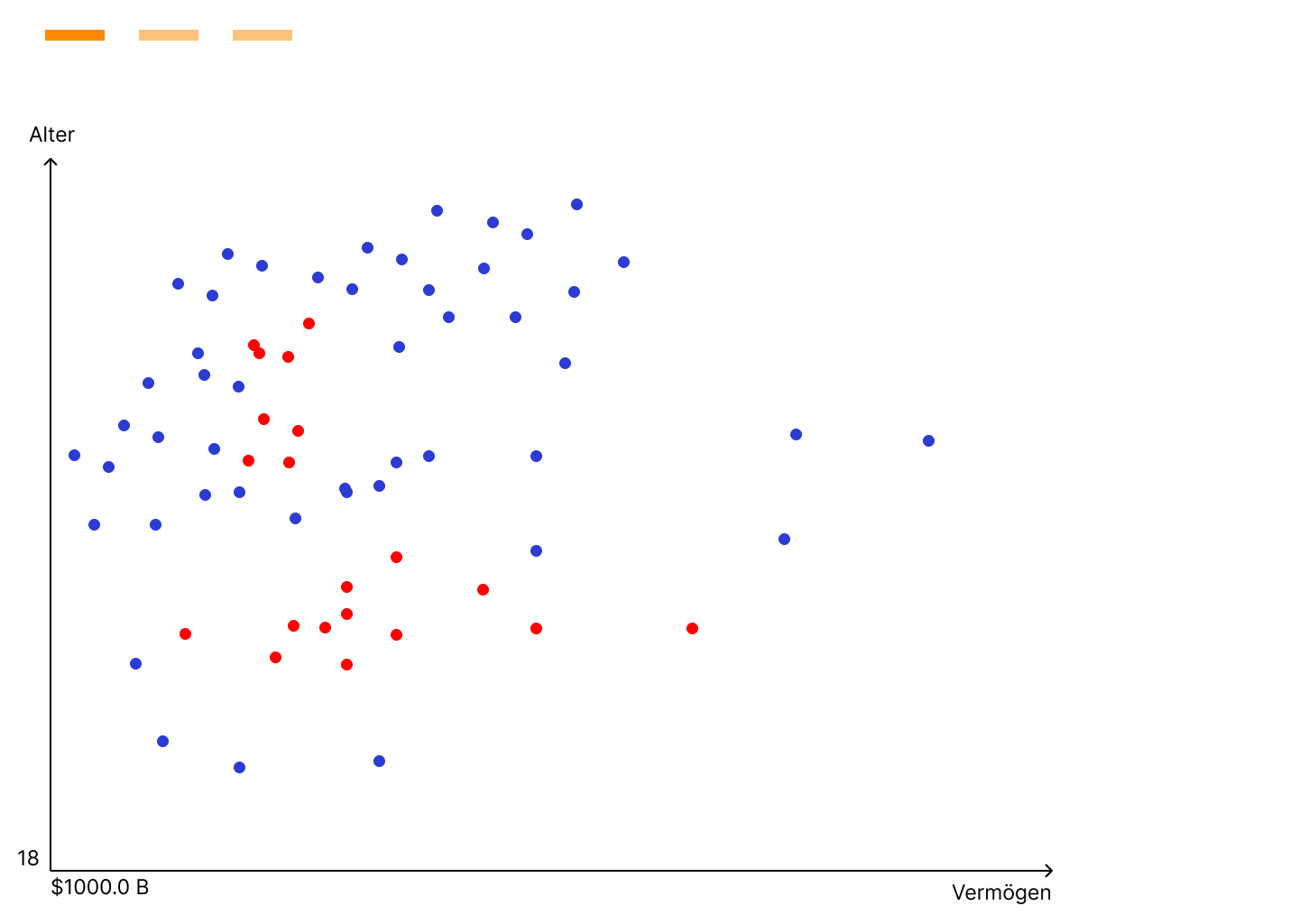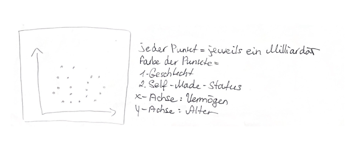 Beim ersten Screen wollte ich alle Milliardäre als Punkte auf einem Koordinatensystem darstellen. Die x-Achse soll dabei für das Vermögen stehen und die y-Achse für das Alter der Personen.