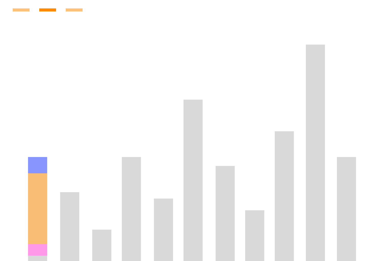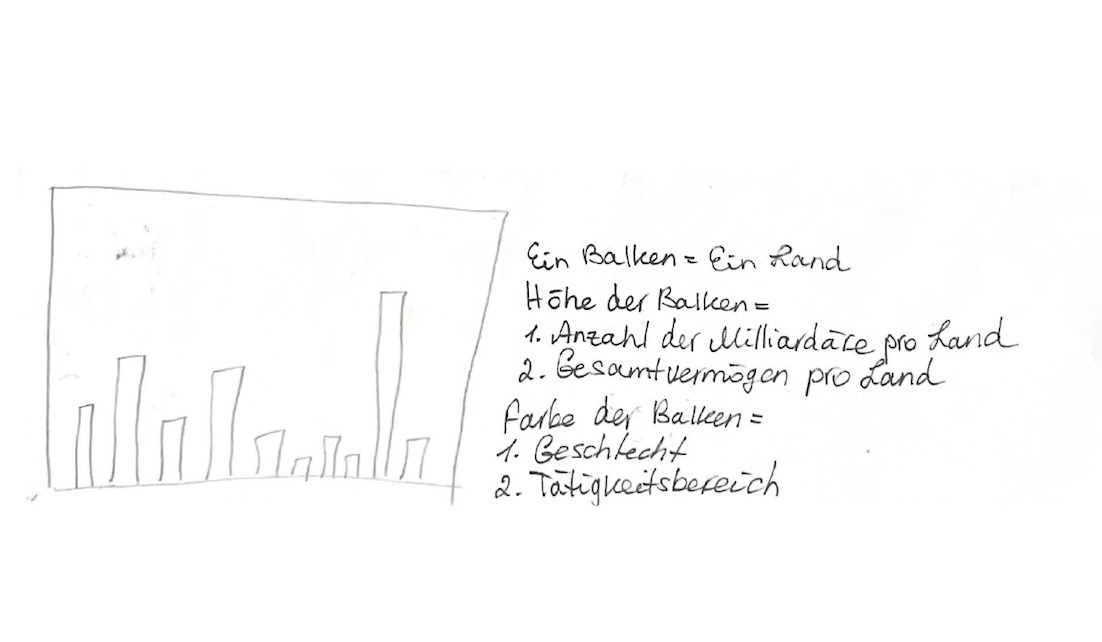 Für den zweiten Screen habe ich mir ein Balkendiagramm überlegt, welches alle Länder aus dem Datensatz darstellt. Dabei sollte die Höhe der Balken entweder die Anzahl oder das Gesamtvermögen aller Milliardäre im jeweiligen Land widerspiegeln. Außerdem wollte ich die Balken farblich in Tätigkeitsfelder der Personen aufteilen.