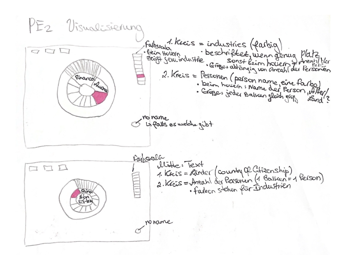 Auf dem dritten Screen wollte ich ein Donut-Diagramm haben, welcher die Herkunft der Milliardäre darstellt. Allerdings war es nicht möglich, diese Idee mithilfe der erlaubten Libraries umzusetzen weswegen ich mich am Ende für ein Sun-Burst-Diagramm entschieden habe. Außerdem gab es auch eine Idee mit den Kreisen, welche die Tätigkeitsfelder der Milliardäre darstellen, was ich aber aufgrund der ähnlichen Datenvermittlung beim Screen 2 verworfen habe.