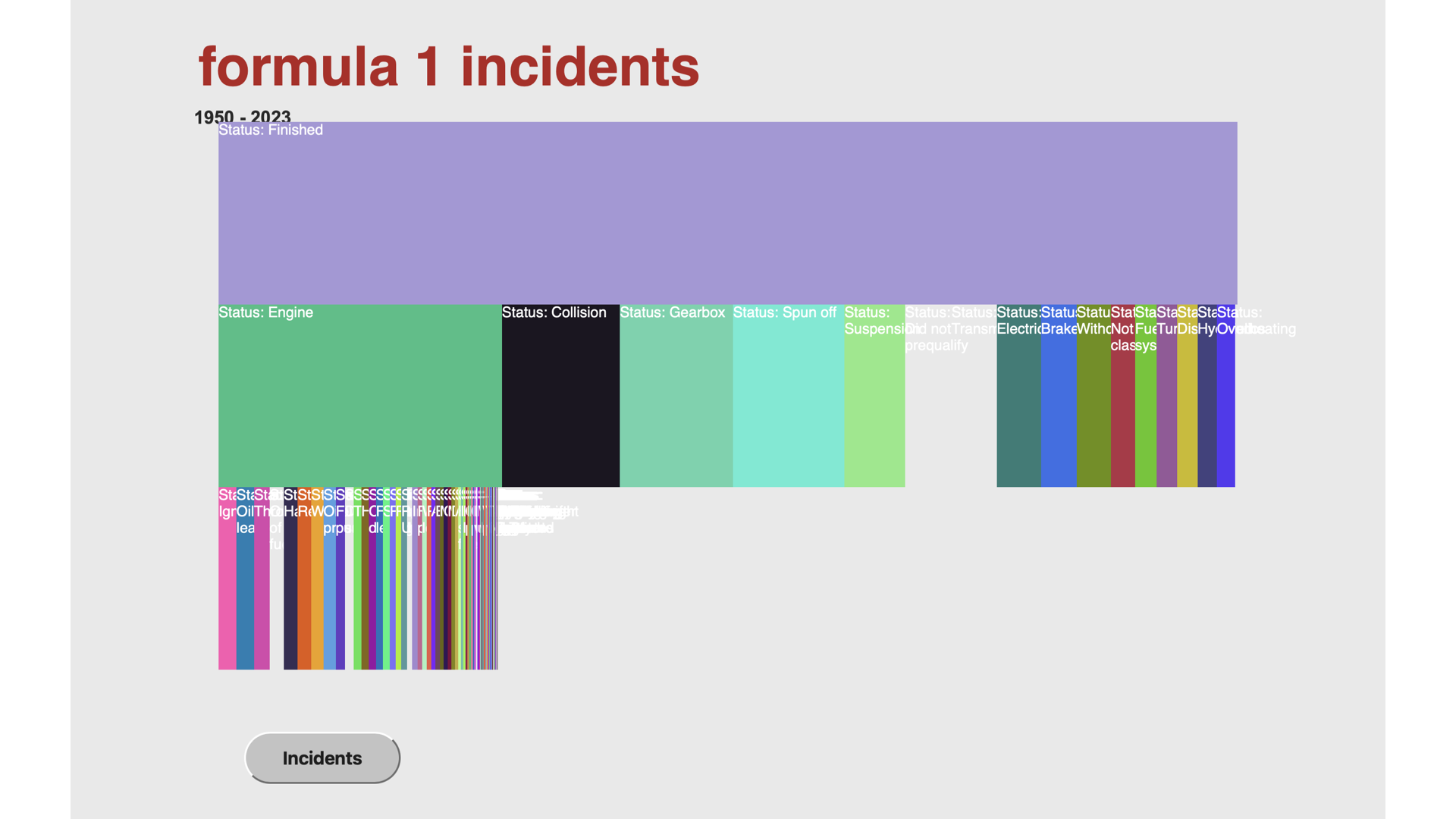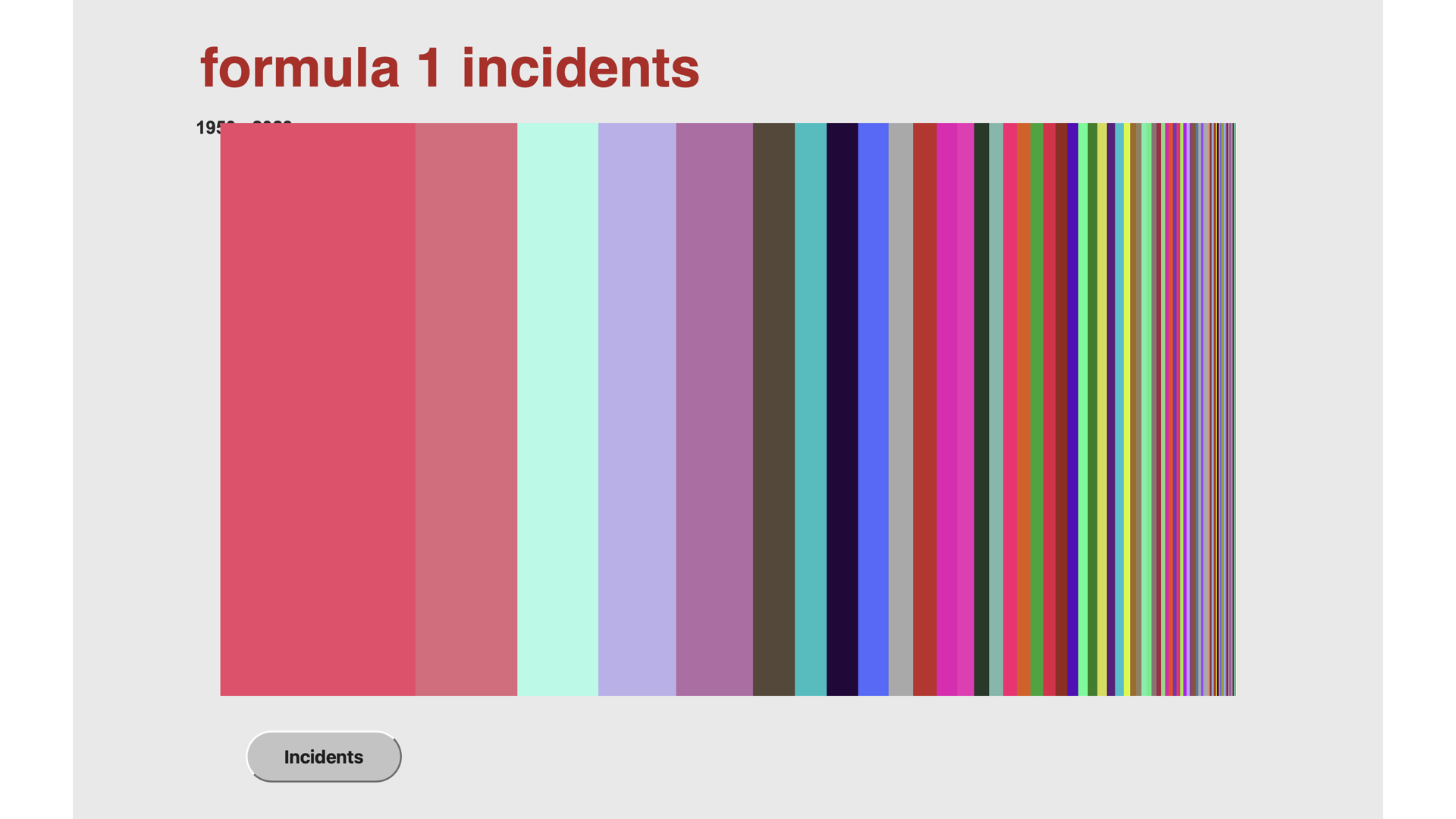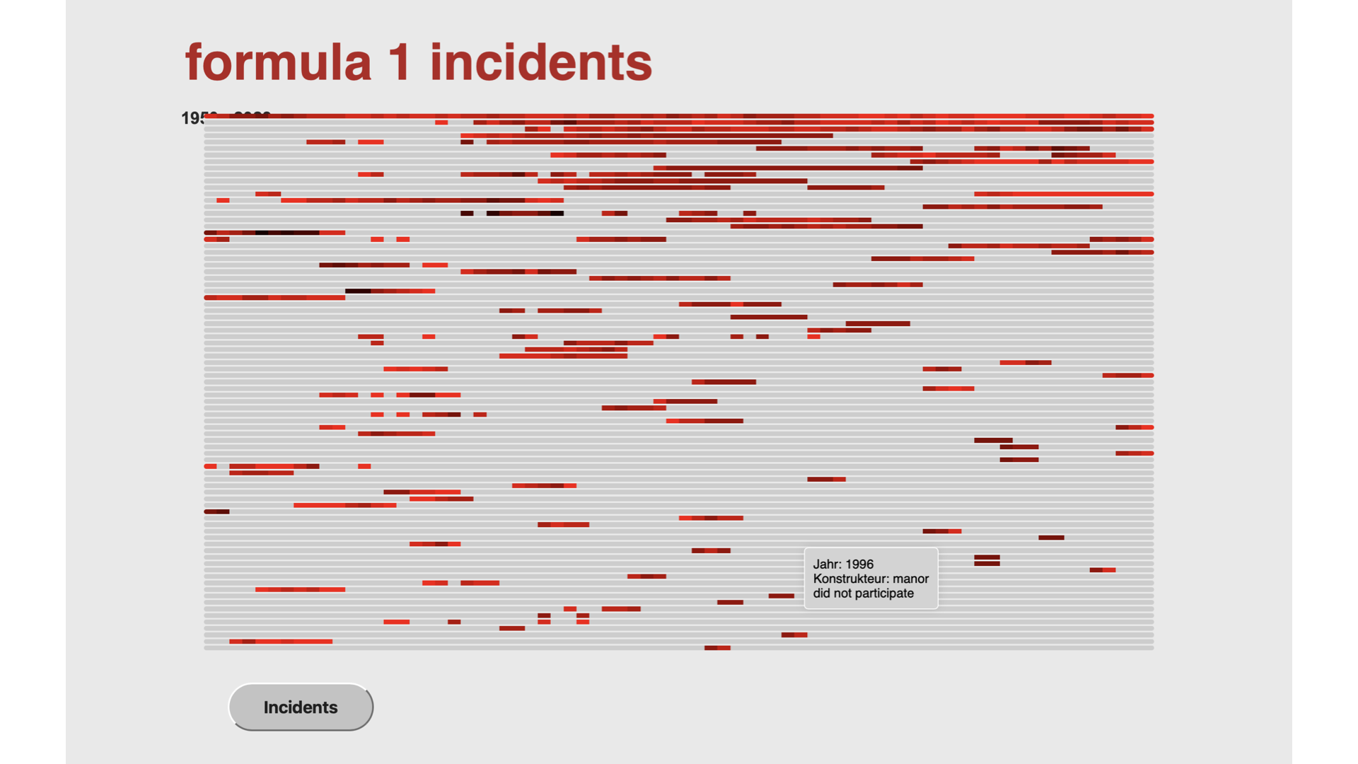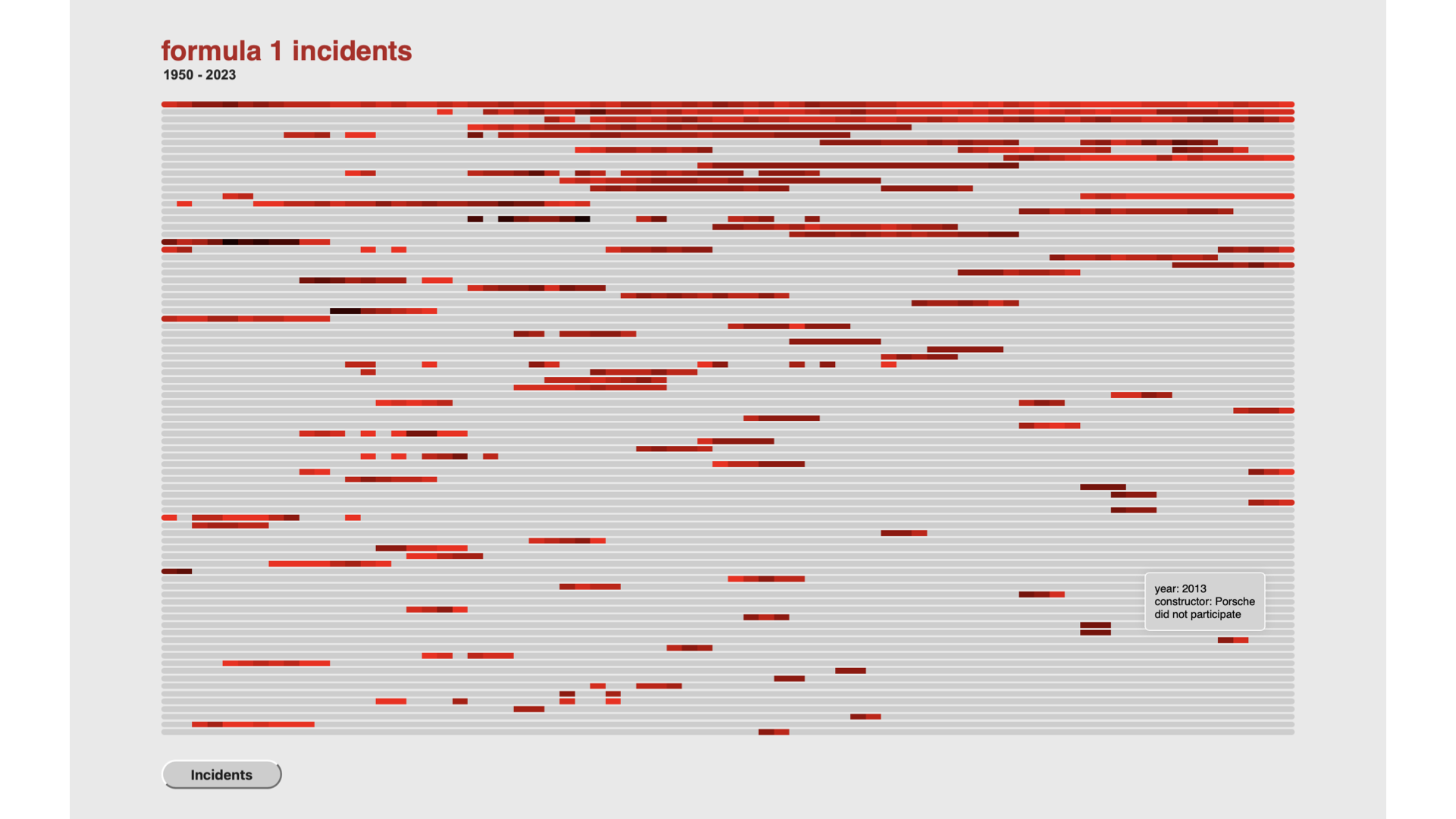 The first screen should show how many problems each constructor has had over the years. In addition, it would be helpful to give a general overview of how many problems have occurred in total and what types of problems there are.