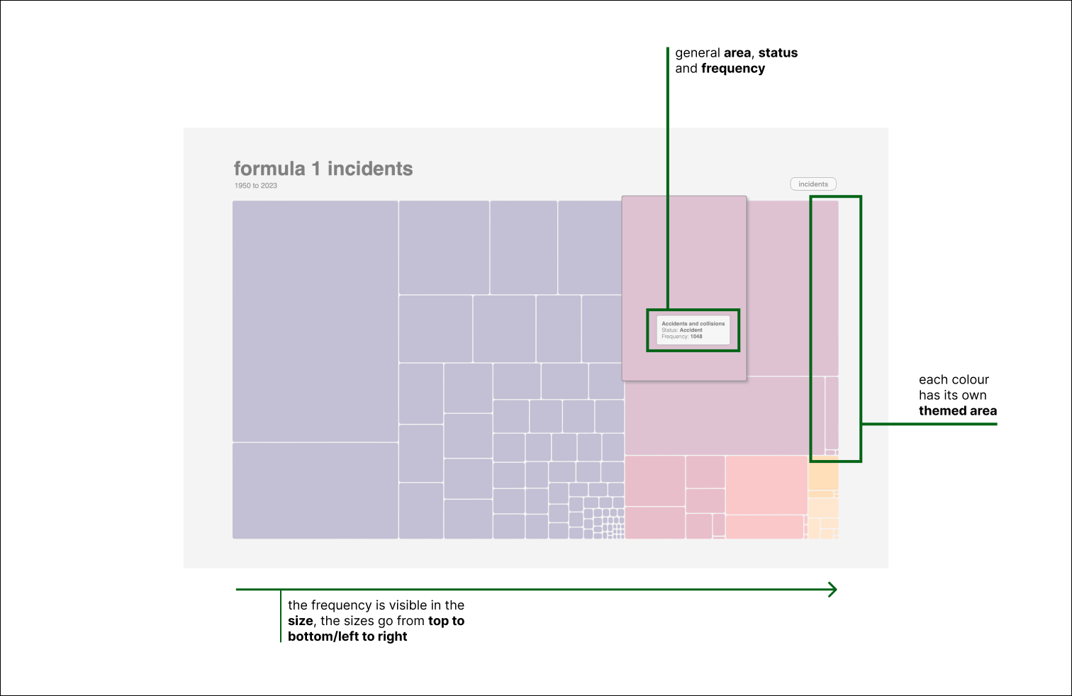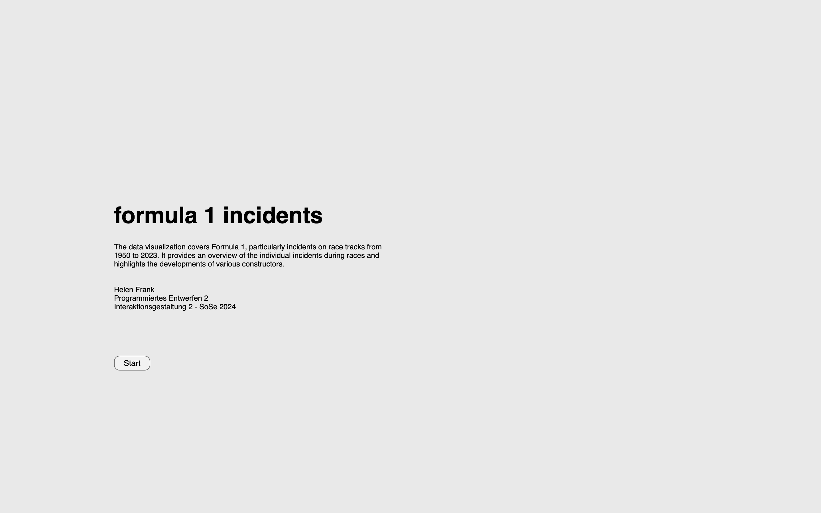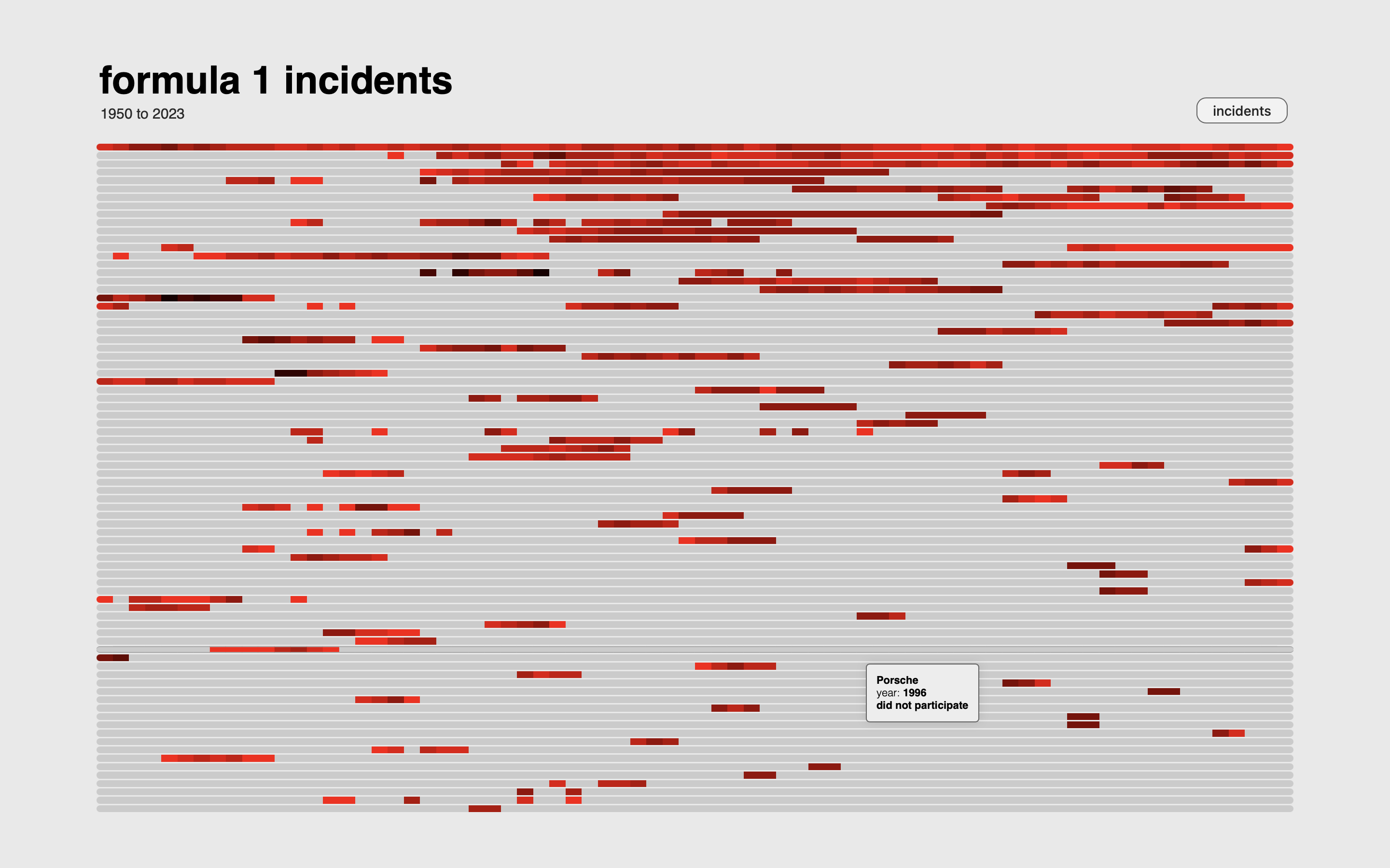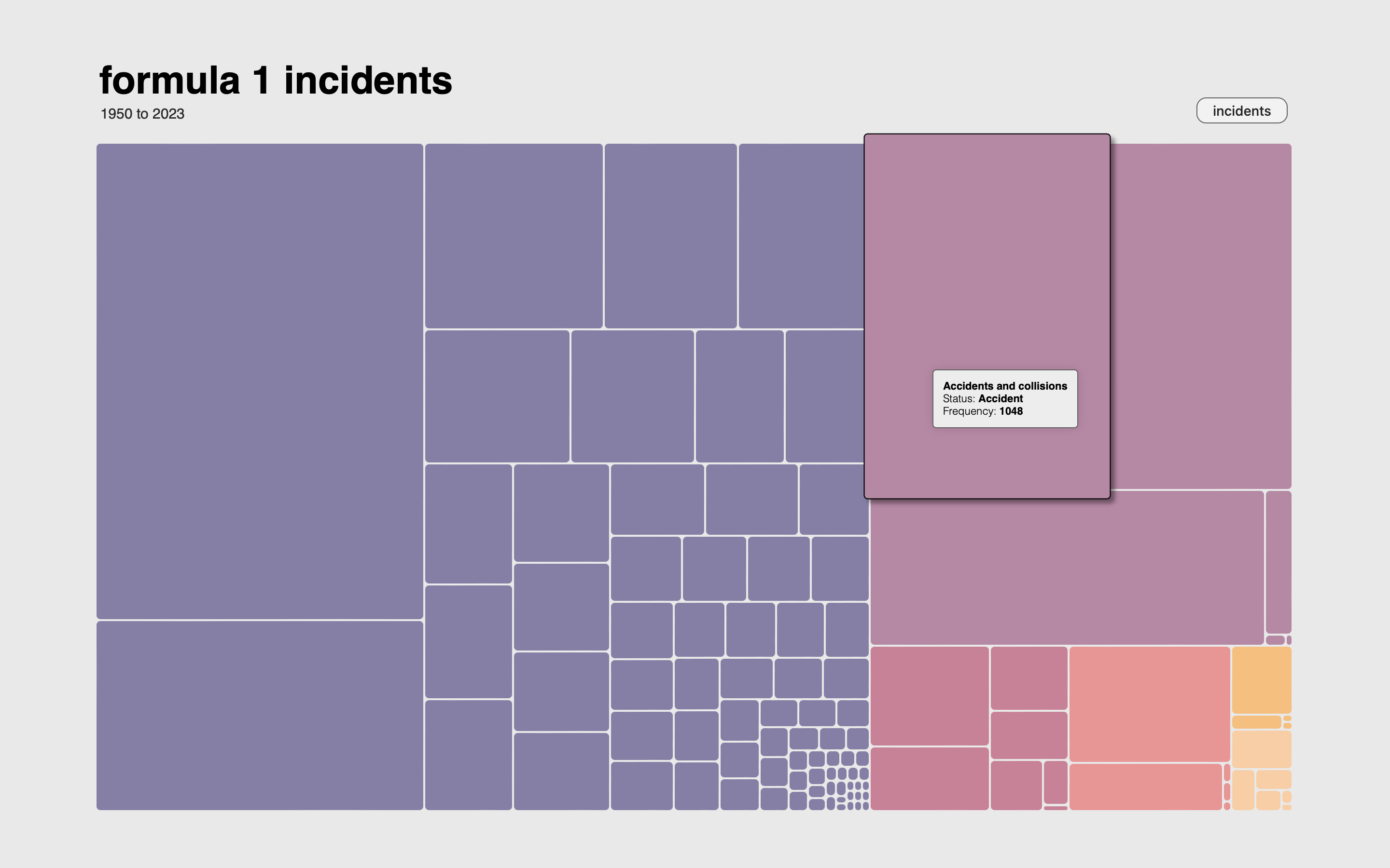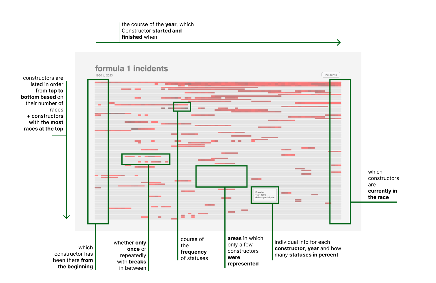 The data visualization covers Formula 1, particularly incidents on race tracks from 1950 to 2023. It provides an overview of the individual incidents during races and highlights the developments of various constructors.