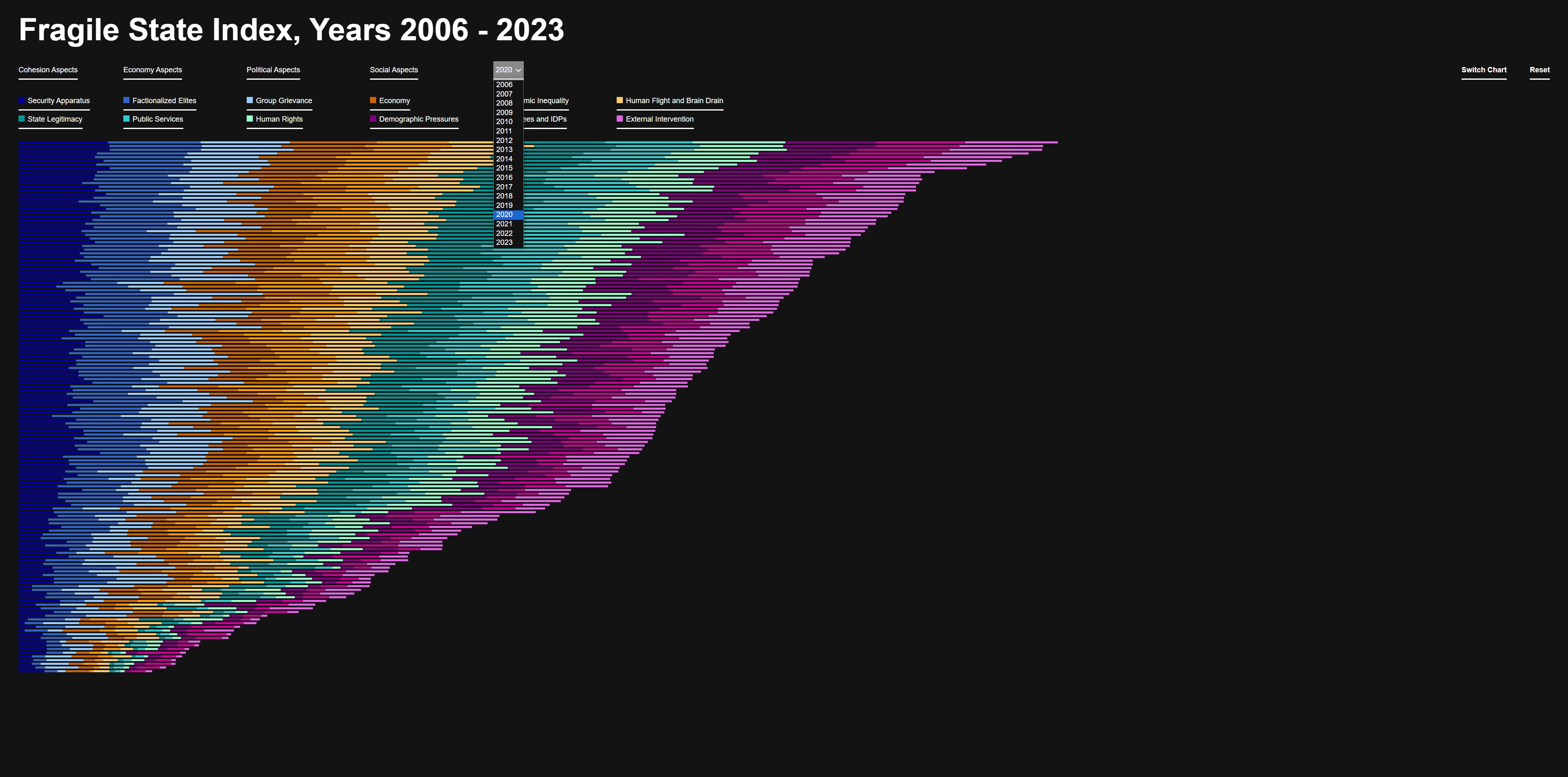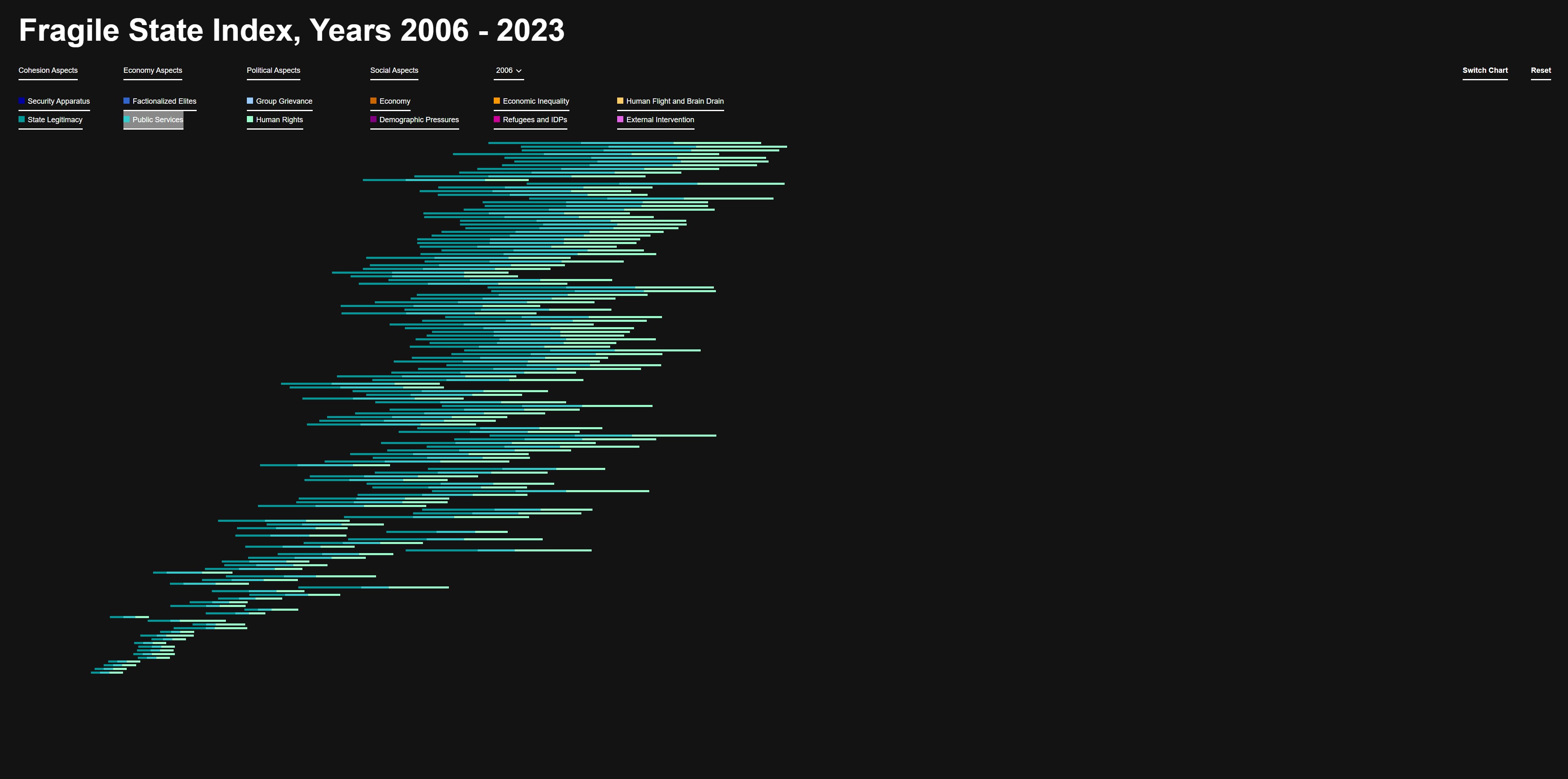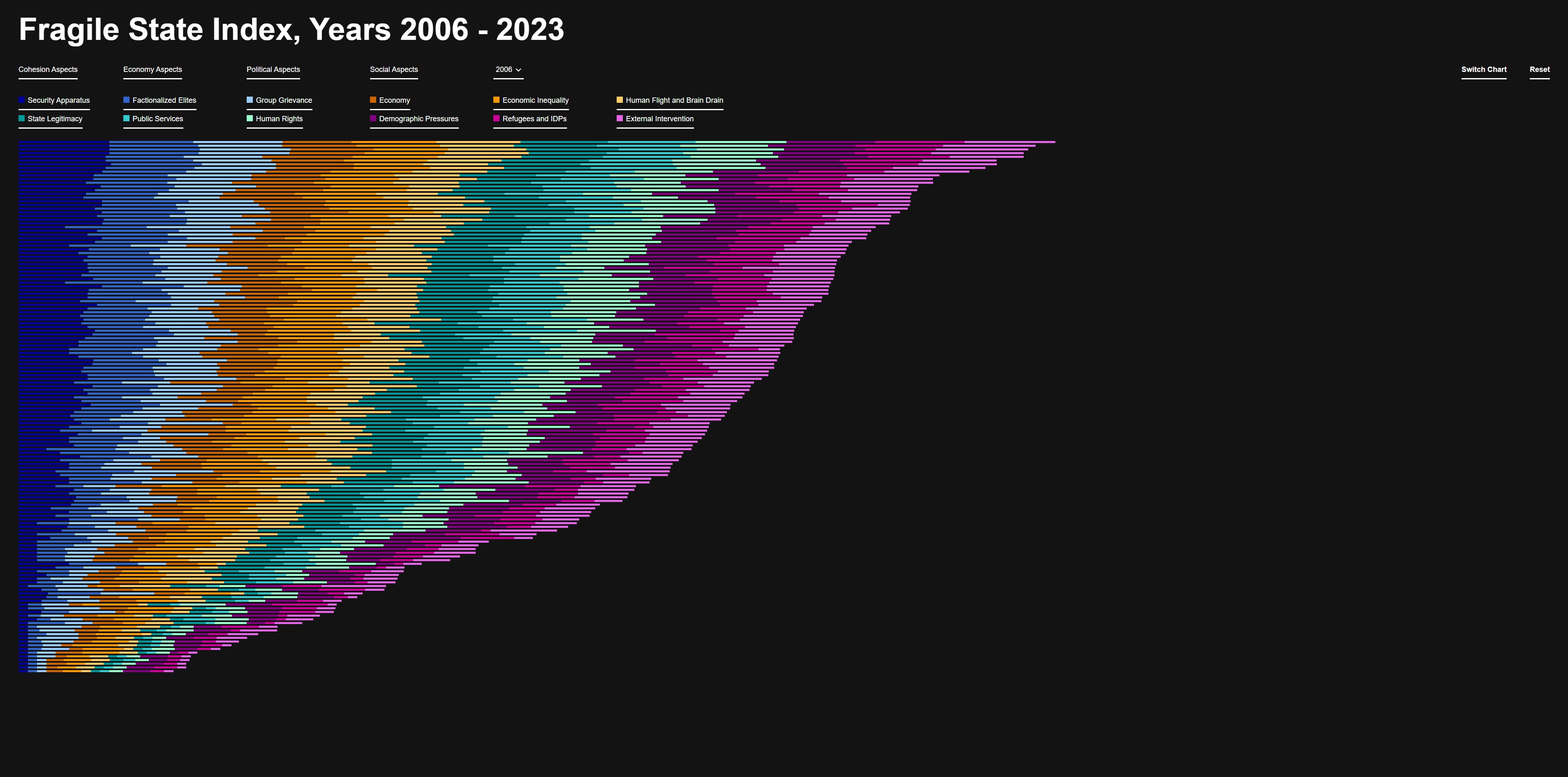 Diese Farben bieten eine klare visuelle Unterscheidung und erleichtern die Zuordnung der Kriterien im Fragile State Index