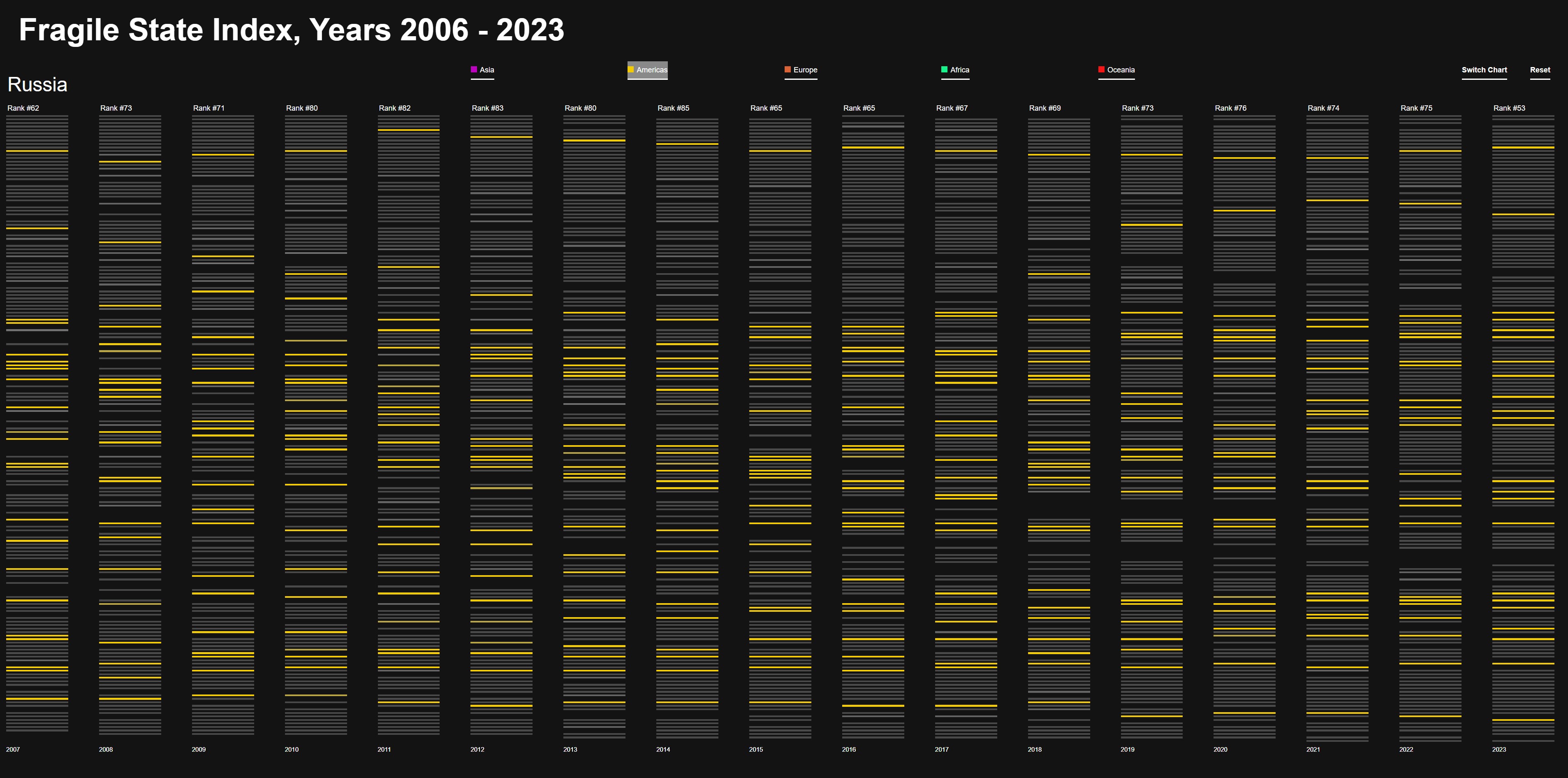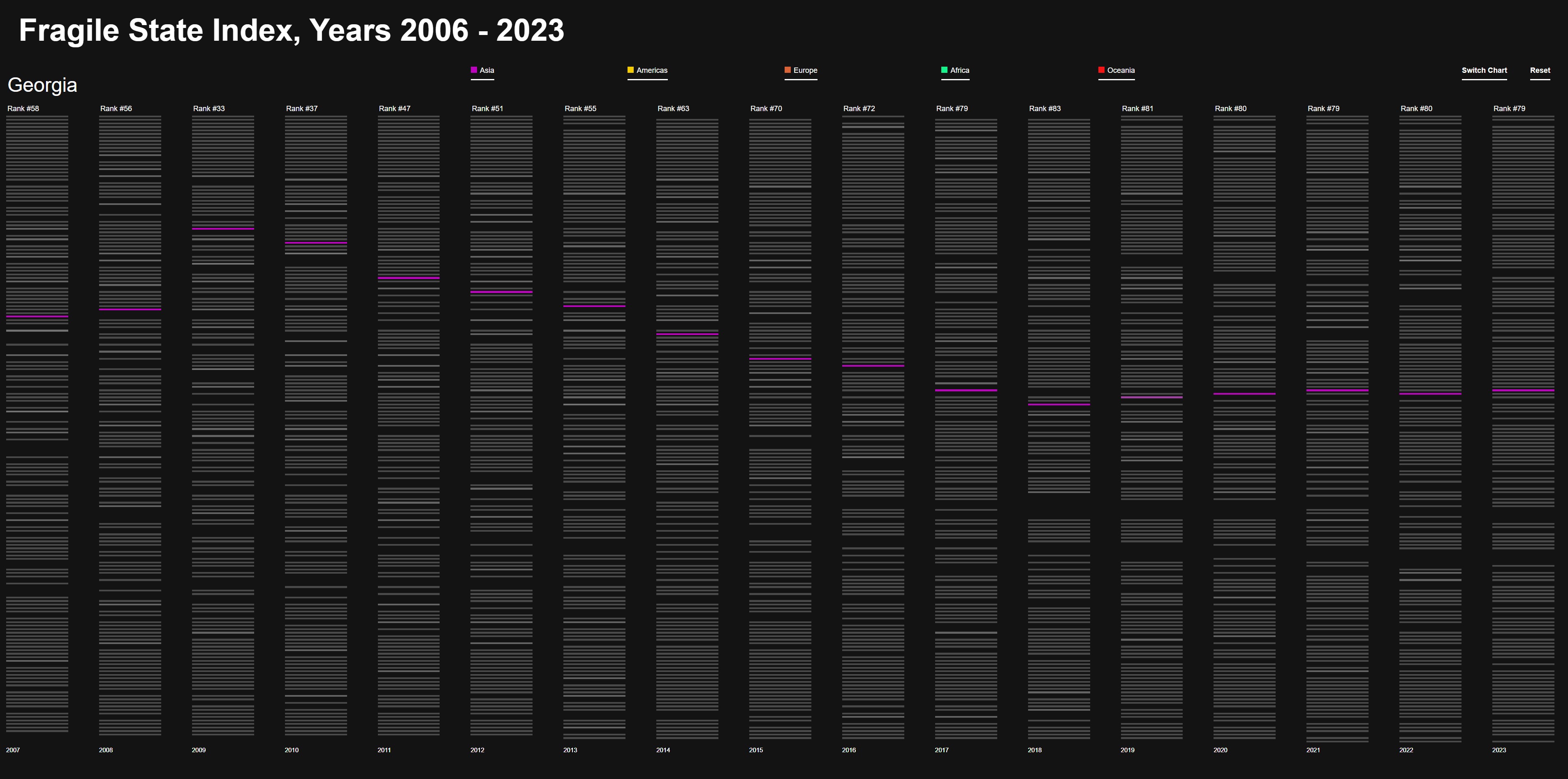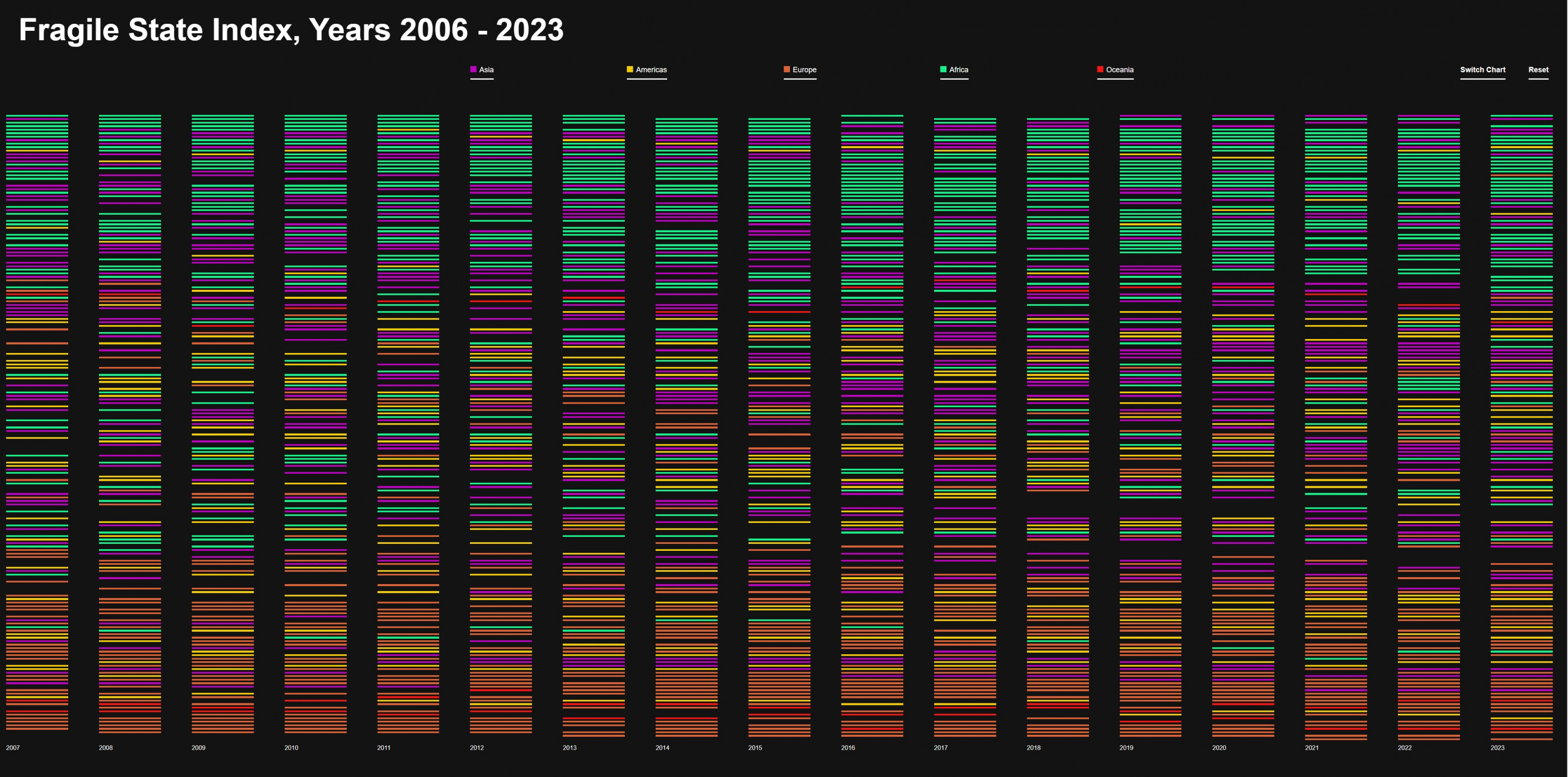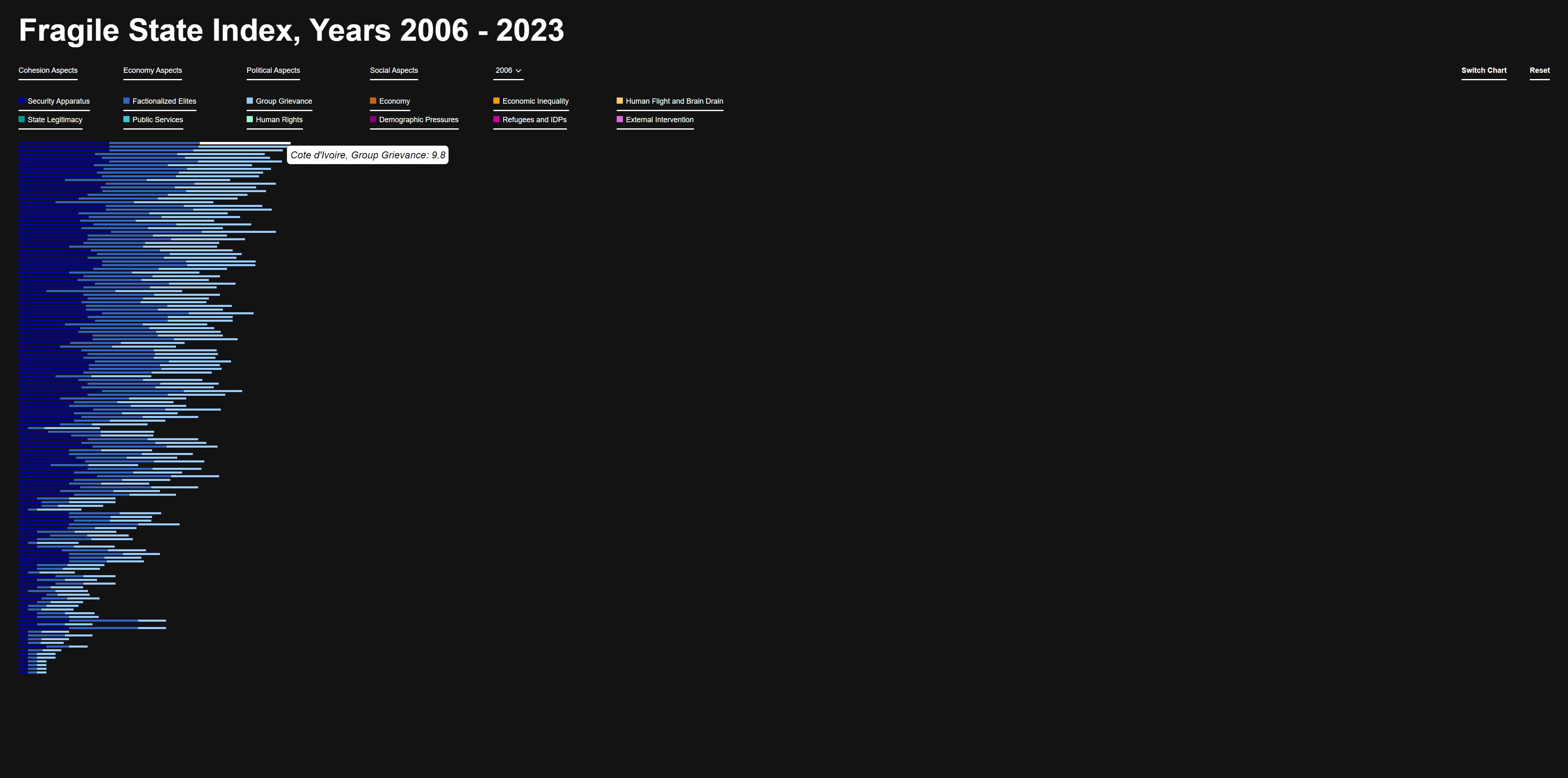Diese Farben bieten eine klare visuelle Unterscheidung und erleichtern die Zuordnung der Kriterien im Fragile State Index