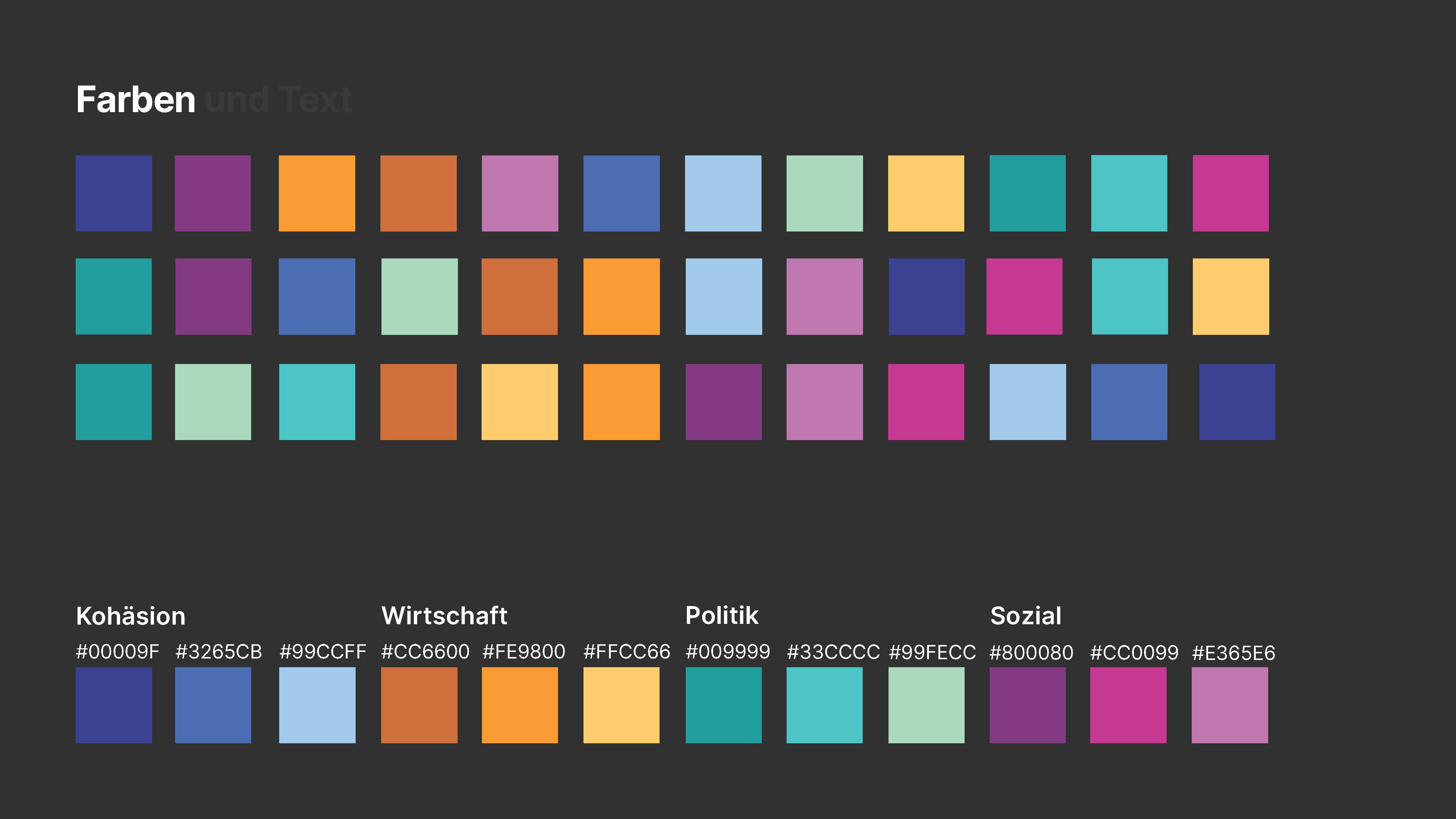 - Politik: #009999, #33CCCC, #99FECC. Grüntöne stehen für Erneuerung und Ausgleich, was politische Aspekte gut widerspiegelt.