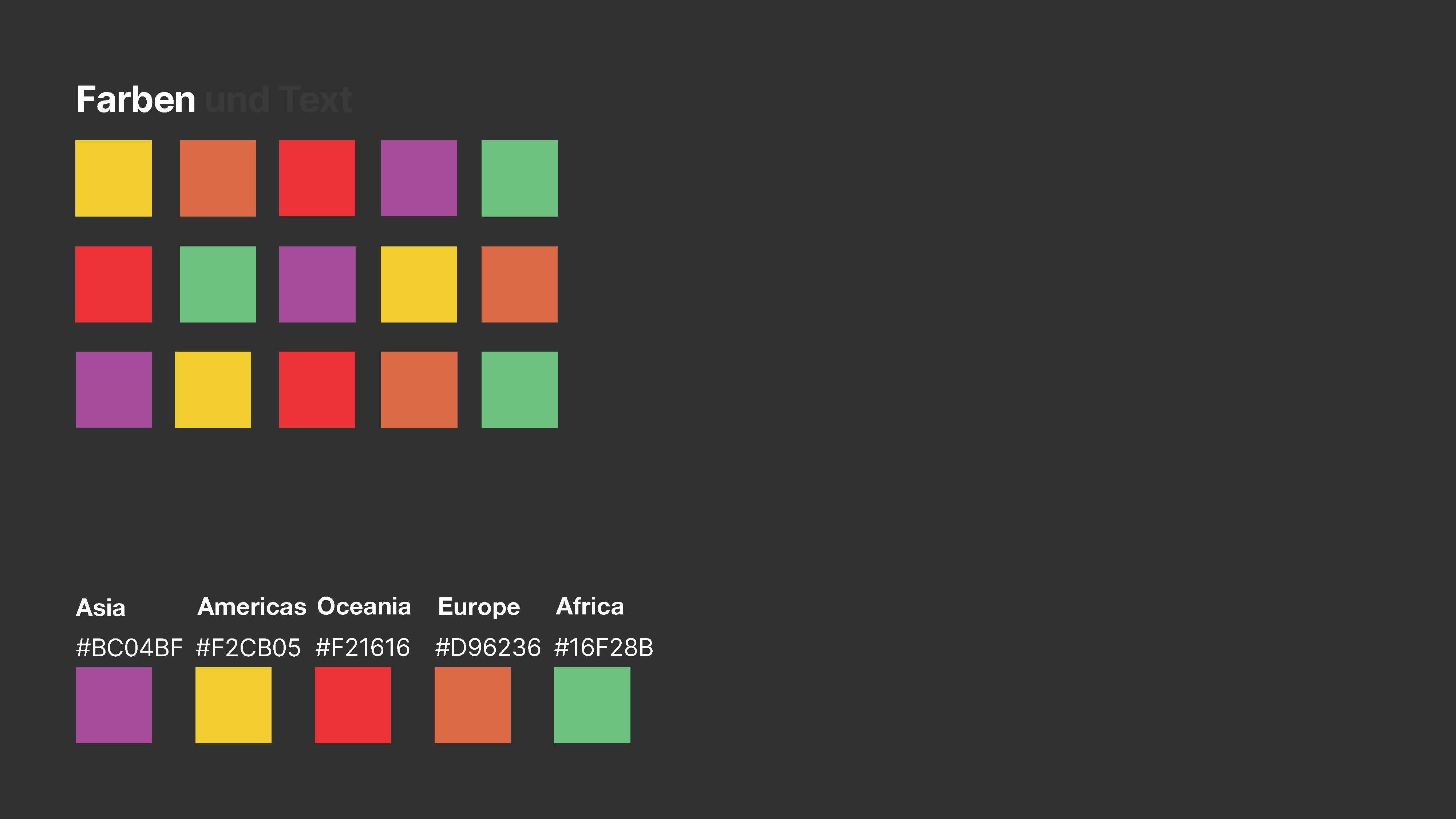 Bei der Farbwahl war es wichtig, dass die Kontinente nicht anhand einer spezifischen Farbfamilie identifizierbar sind, um eine unvoreingenommene Darstellung zu gewährleisten