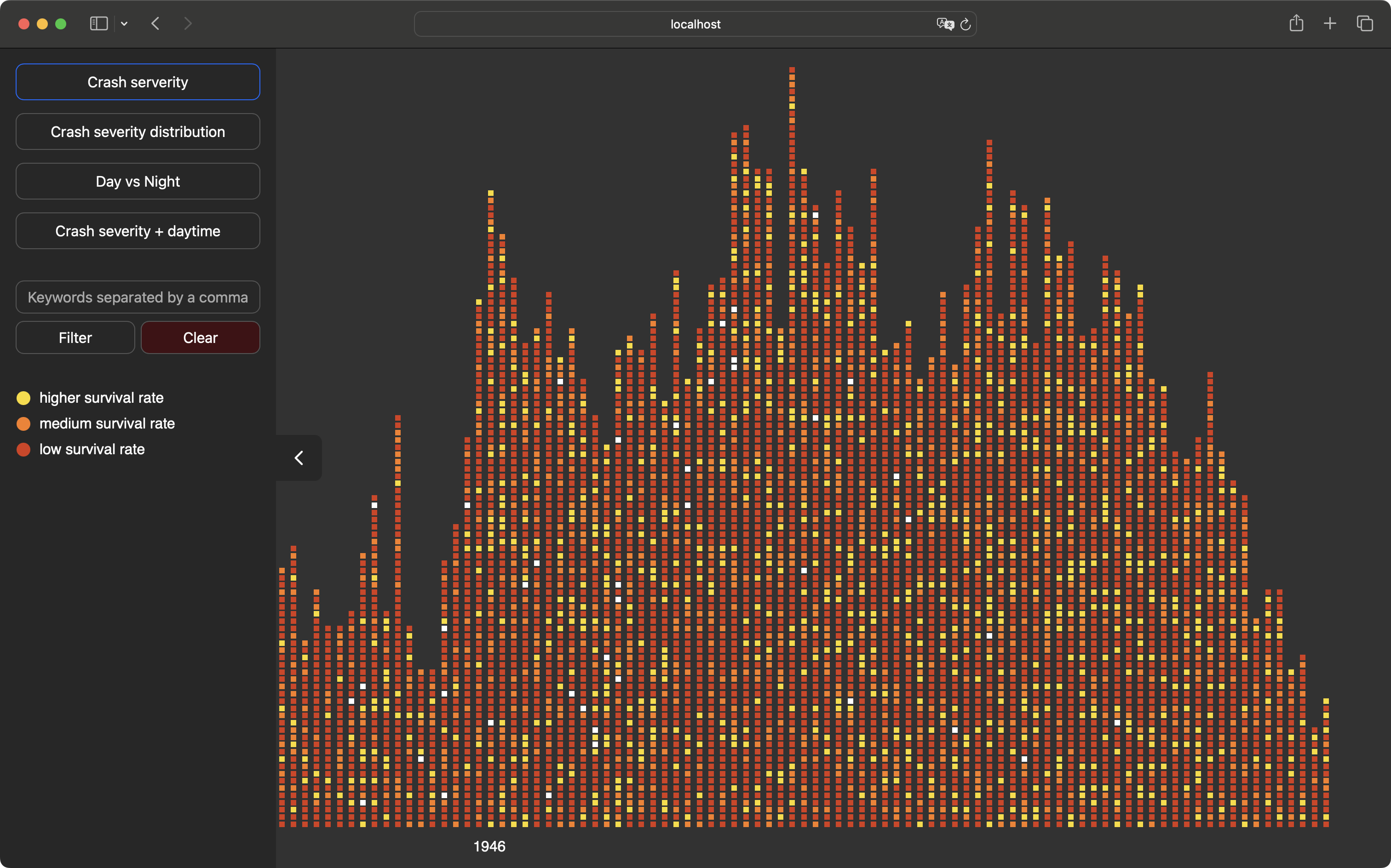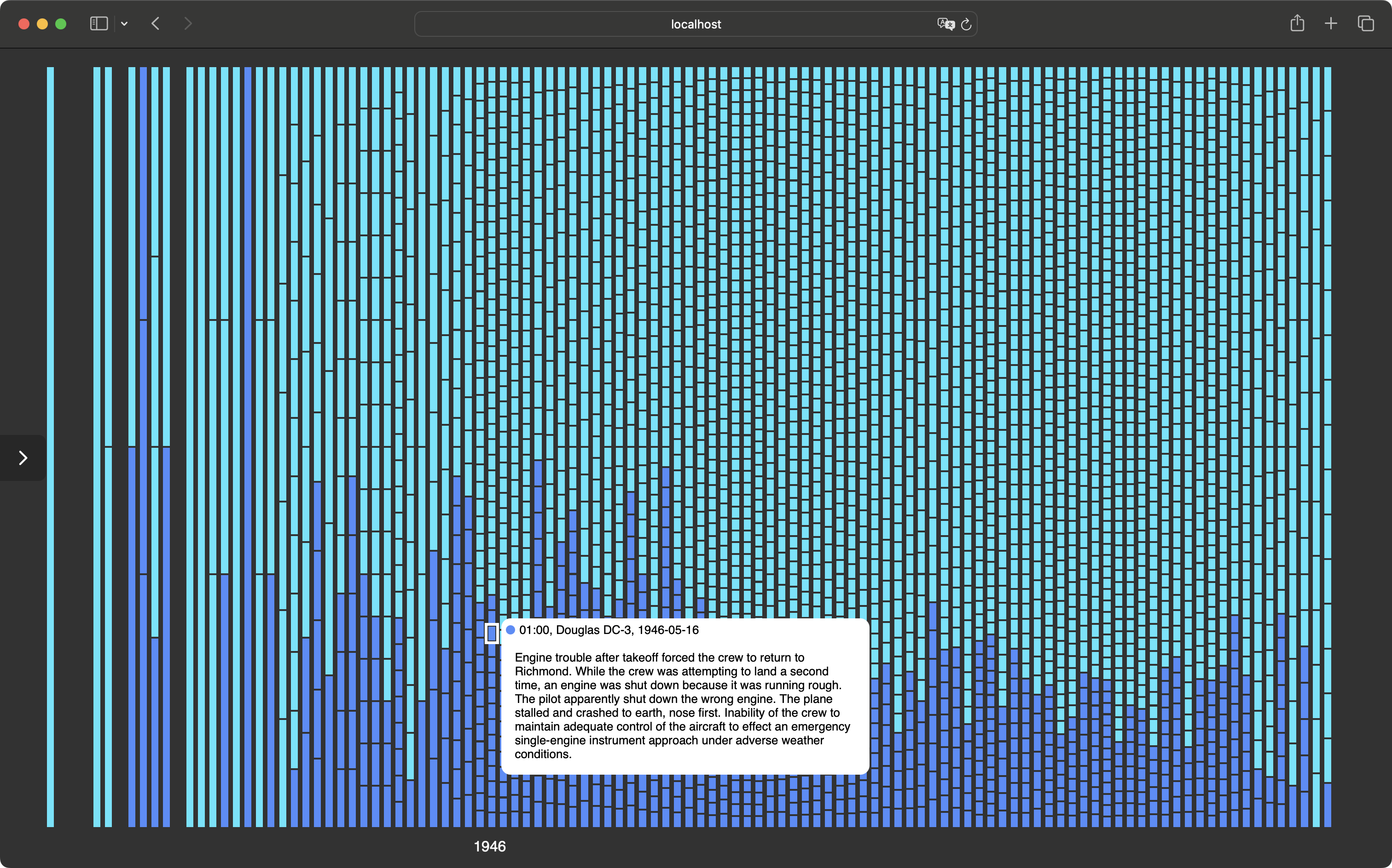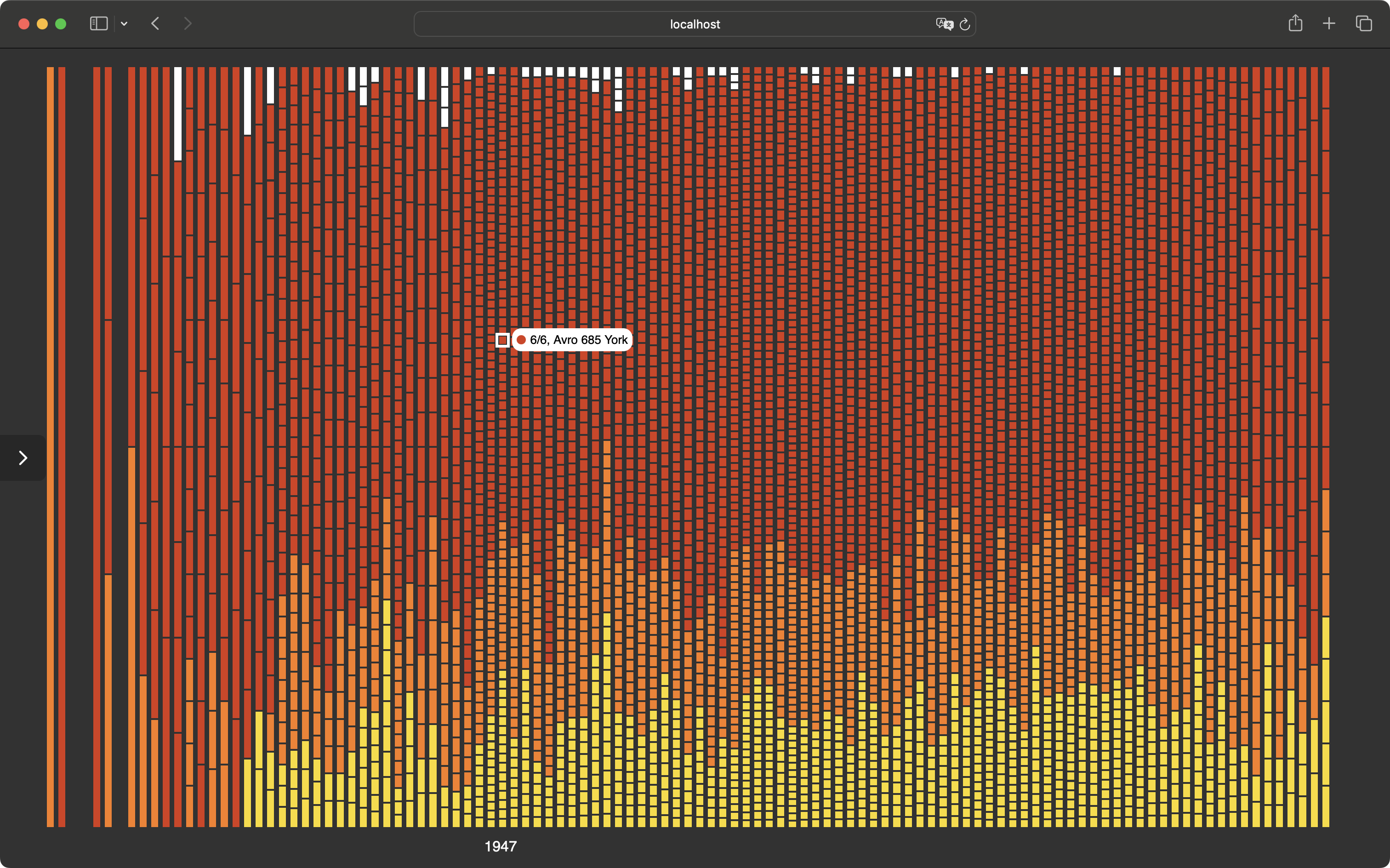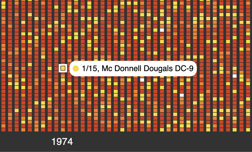 - Erste Visualisierung der Abstürze über die Jahre, eingefärbt nach der berechneten Absturzhärte (Todesfälle / Passagieranzahl). Je größer der Wert, desto mehr Todesfälle gab es. Die Abstürze wurden je nach Härtegrad farblich kategorisiert: Rot = keine Überlebenden, Orange = weniger als die Hälfte der Menschen überlebte, Gelb = mehr als die Hälfte der Menschen überlebte.