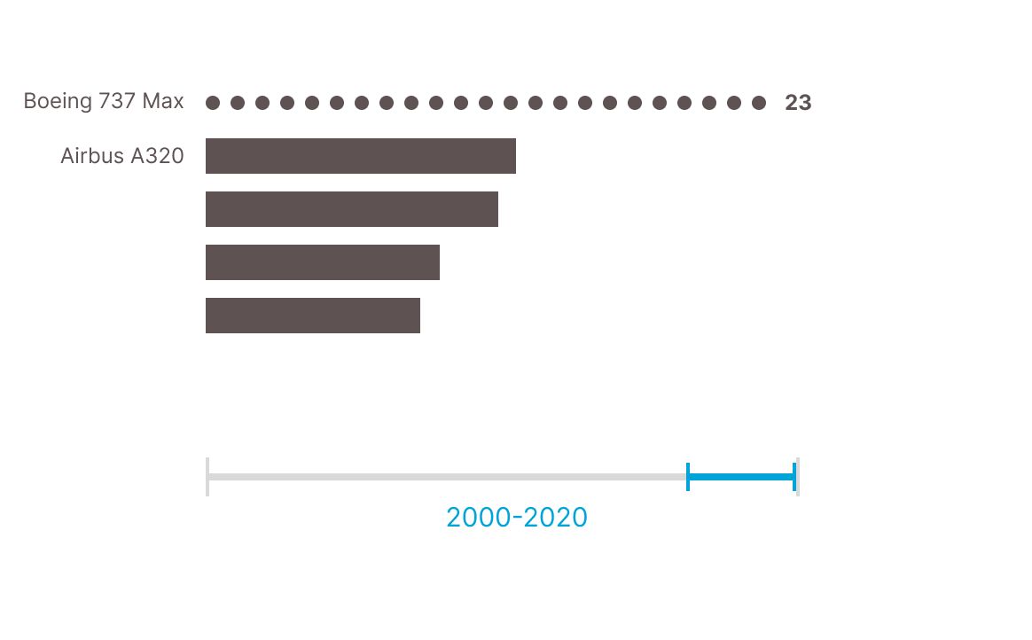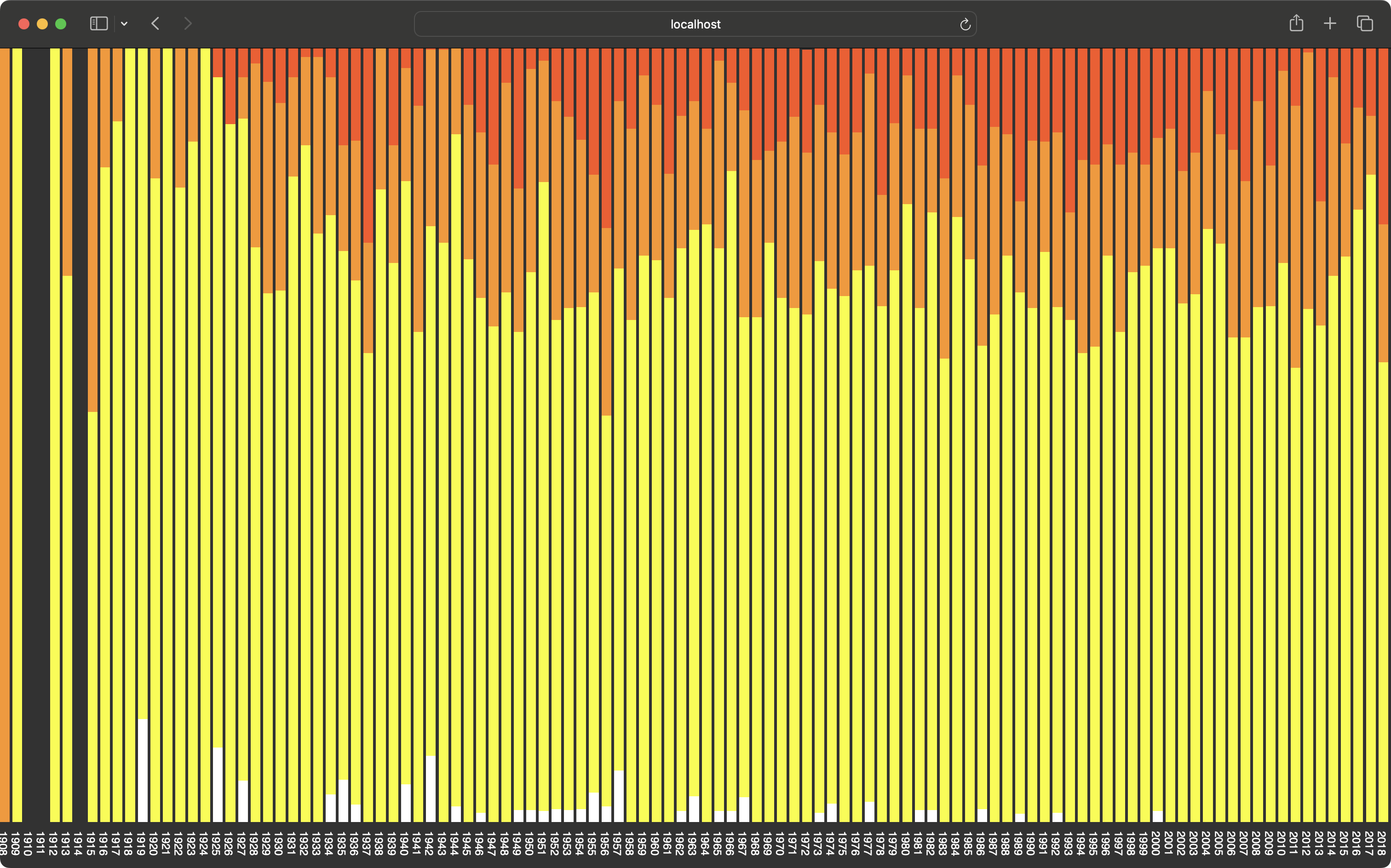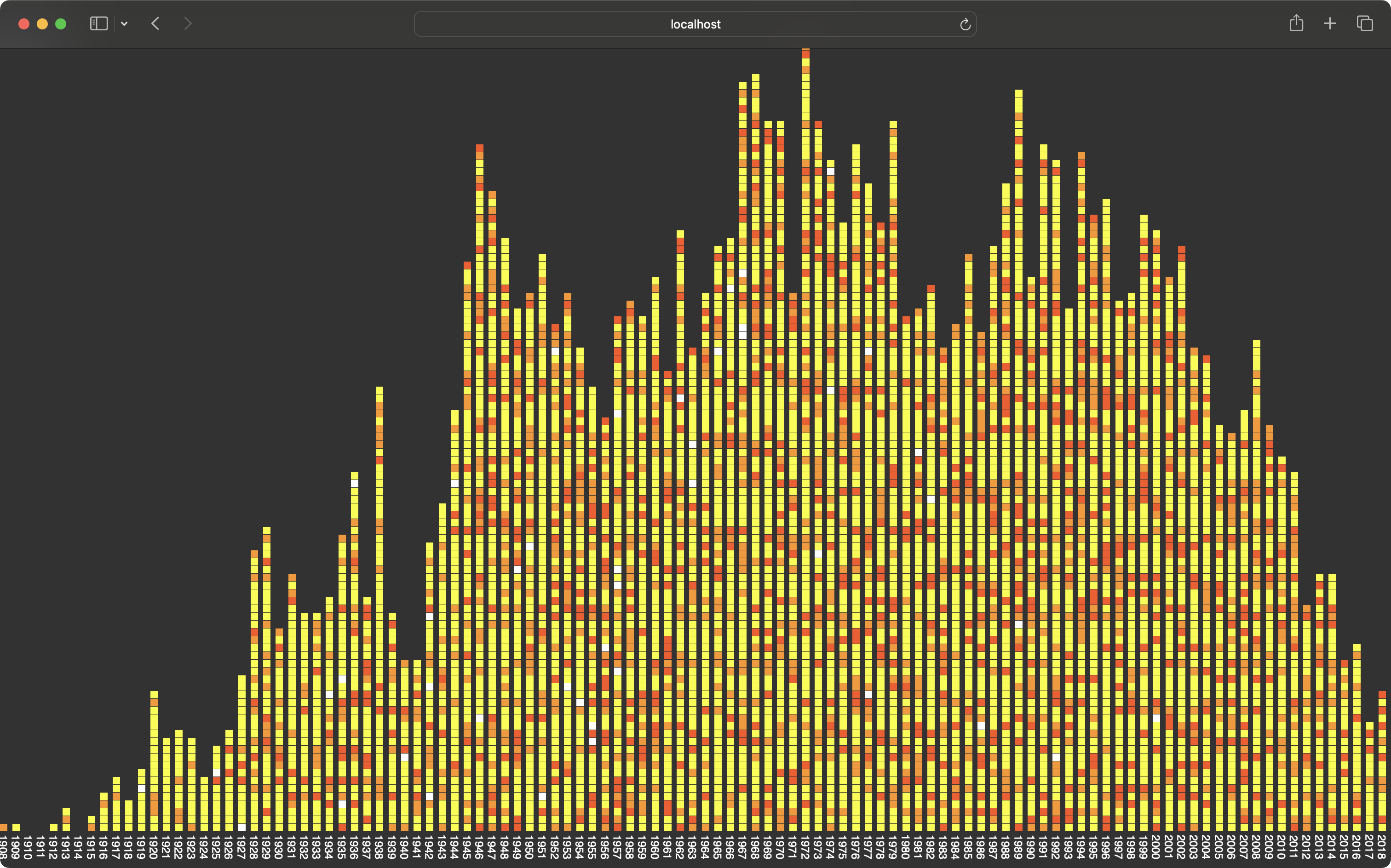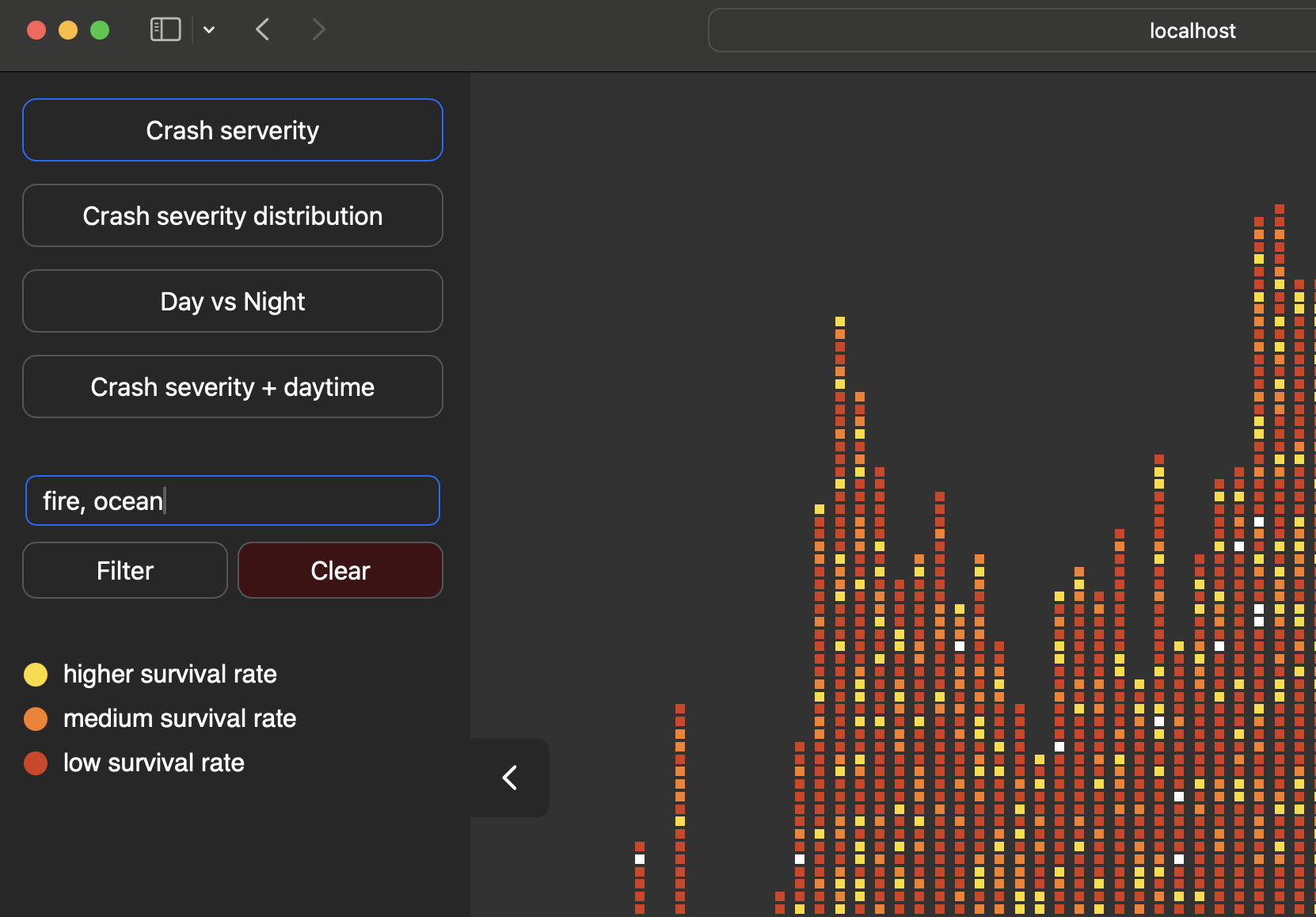 - Erste Visualisierung der Abstürze über die Jahre, eingefärbt nach der berechneten Absturzhärte (Todesfälle / Passagieranzahl). Je größer der Wert, desto mehr Todesfälle gab es. Die Abstürze wurden je nach Härtegrad farblich kategorisiert: Rot = keine Überlebenden, Orange = weniger als die Hälfte der Menschen überlebte, Gelb = mehr als die Hälfte der Menschen überlebte.