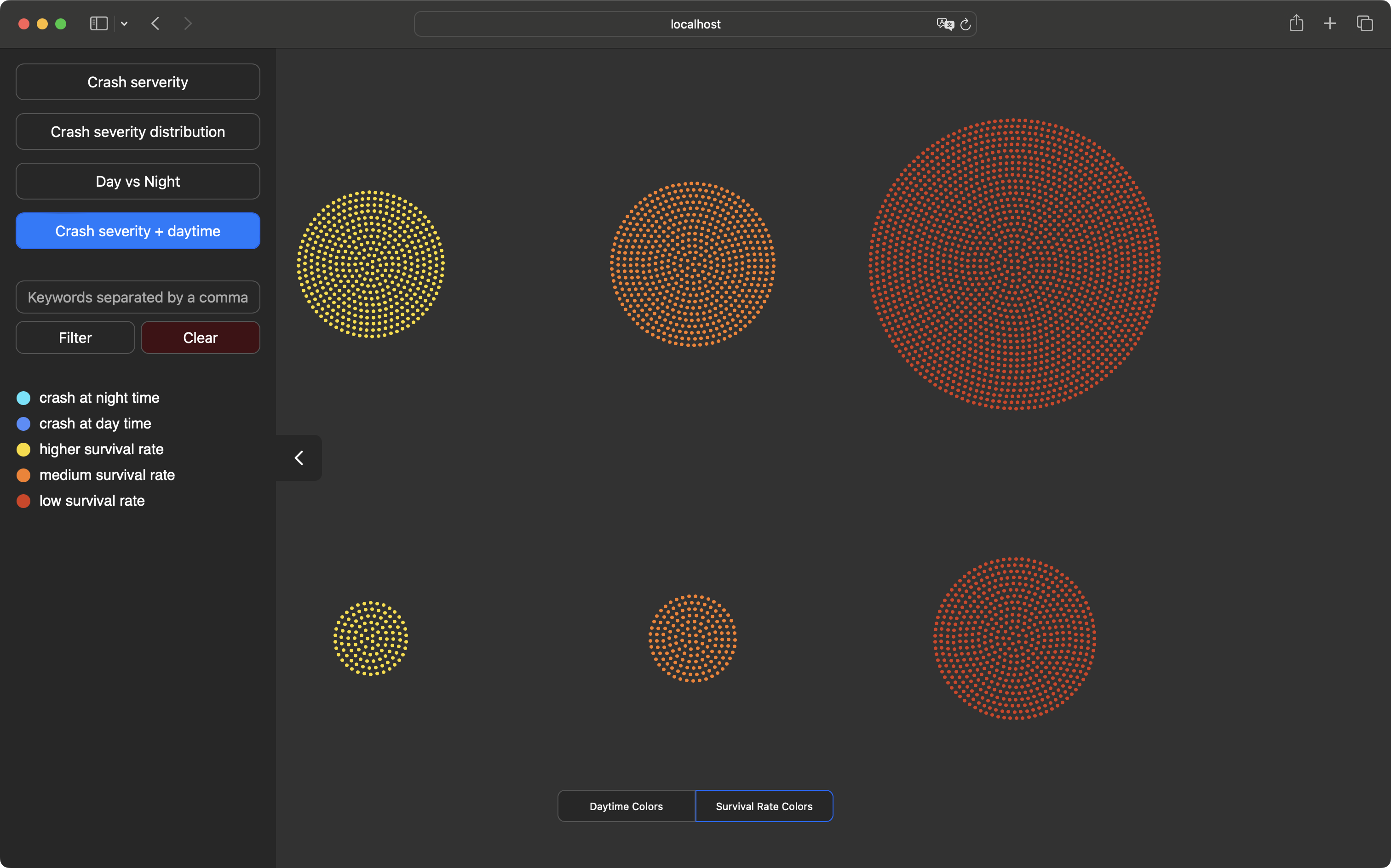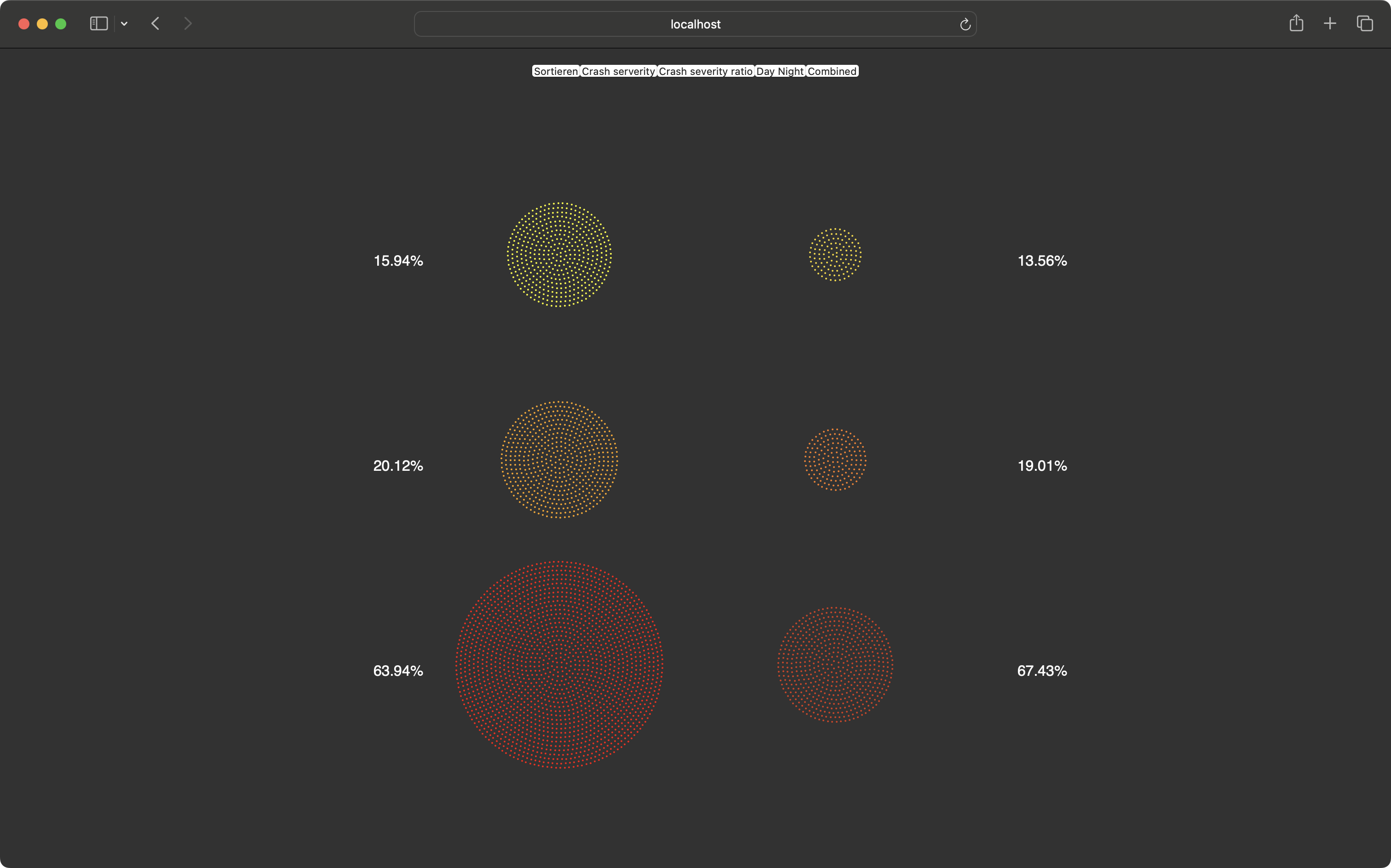 - Um eine Ansicht ohne Zeitskala zu erhalten, wurden die Kategorien der Tag- / Nacht-Ansicht und der Überlebensquoten-Ansicht kombiniert. Kreise aus vielen einzelnen Abstürzen bilden wiederum einen großen Kreis, um einen schnellen Vergleich der Flächen und somit der Anzahl der Abstürze der jeweiligen Kategoriekombination zu ermöglichen.