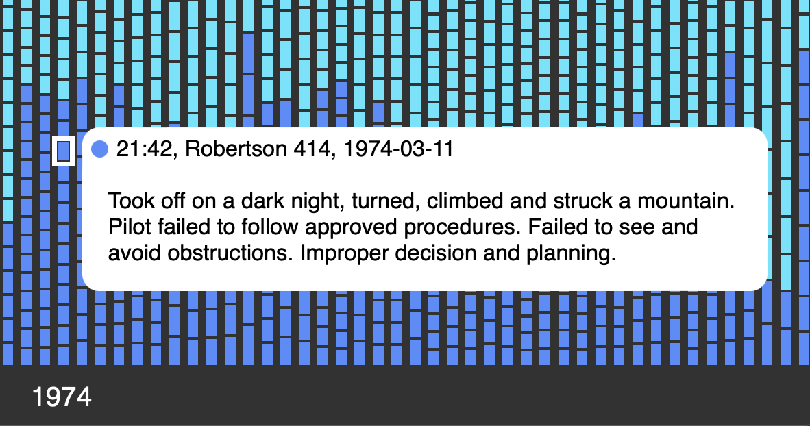 - Der Beschreibungstext der Abstürze kann mittels eines Menüs auf Begriffe untersucht werden. Es werden nur noch die Einträge angezeigt, in denen der Begriff vorhanden ist. So kann zum Beispiel nach Stichpunkten wie “fire”, “alcohol” oder “ocean” gefiltert werden.