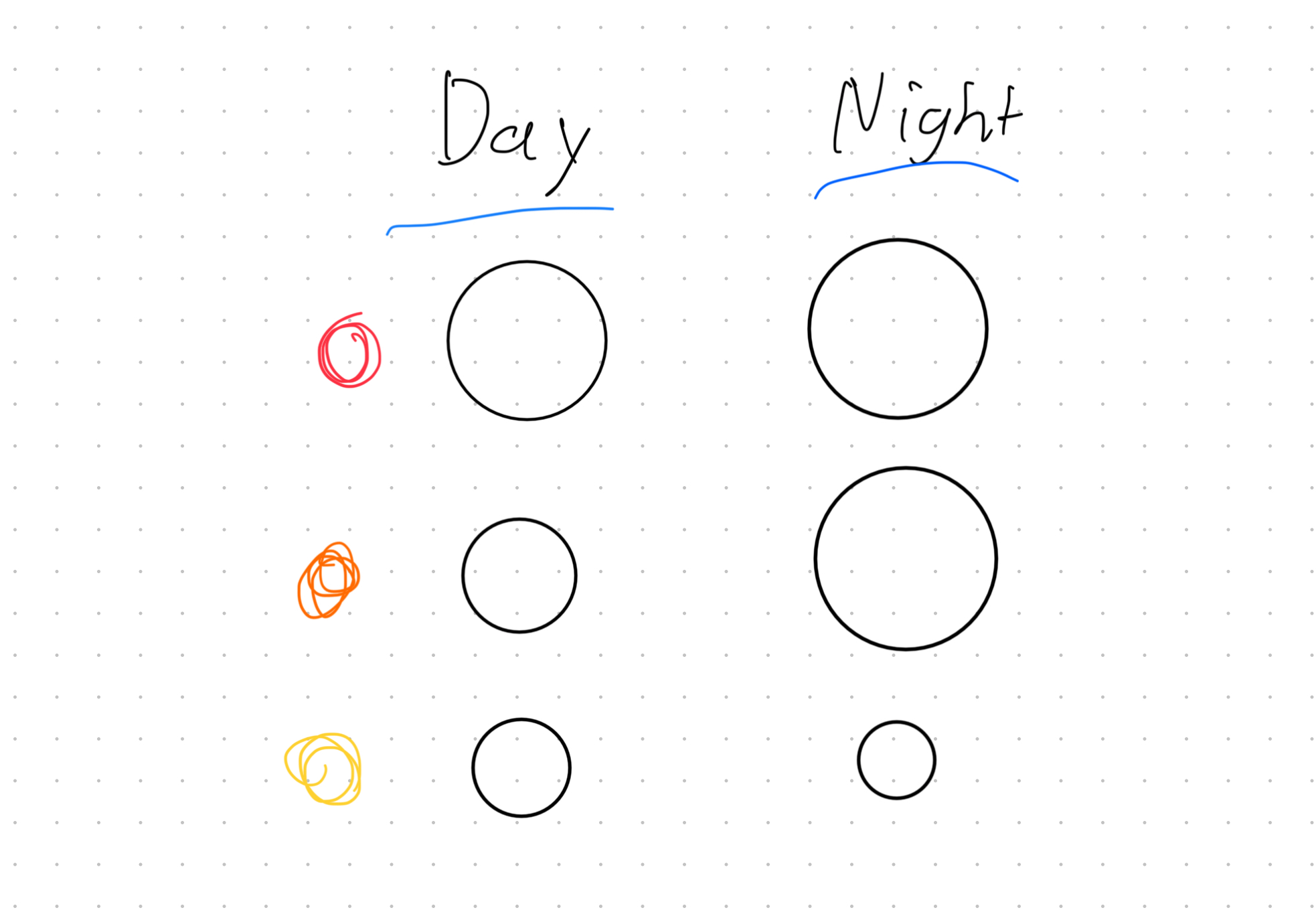 - Eine Beschriftung mit oben “Tag” und unten “Nacht” oder ein hellblauer Balken oben und ein dunkelblauer Balken unten könnten die Aufteilung und den Zweck der Ansicht besser verkörpern.