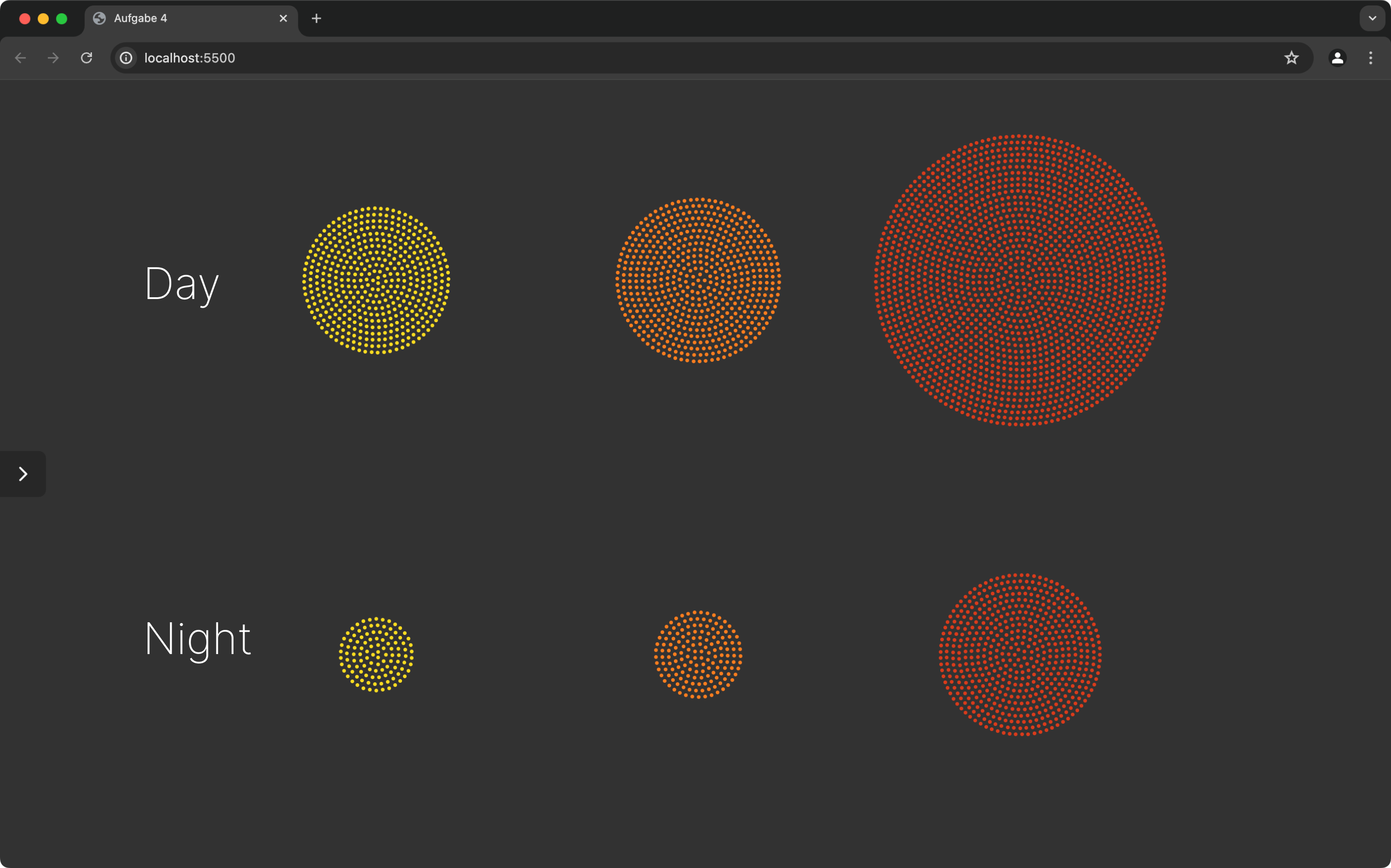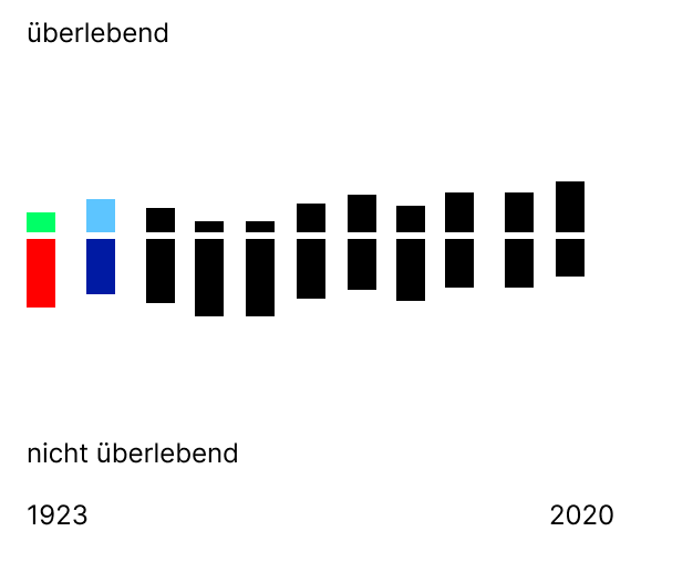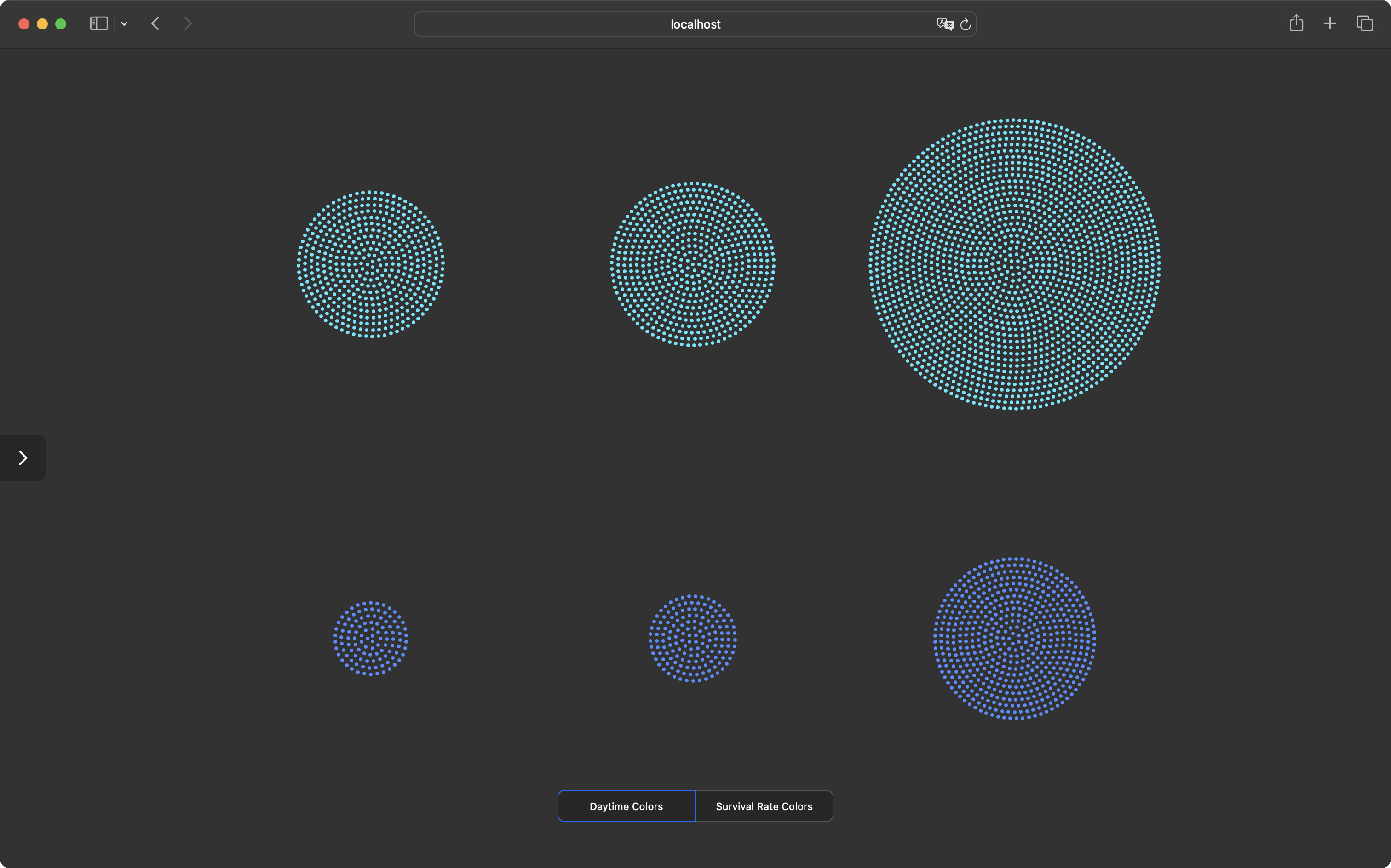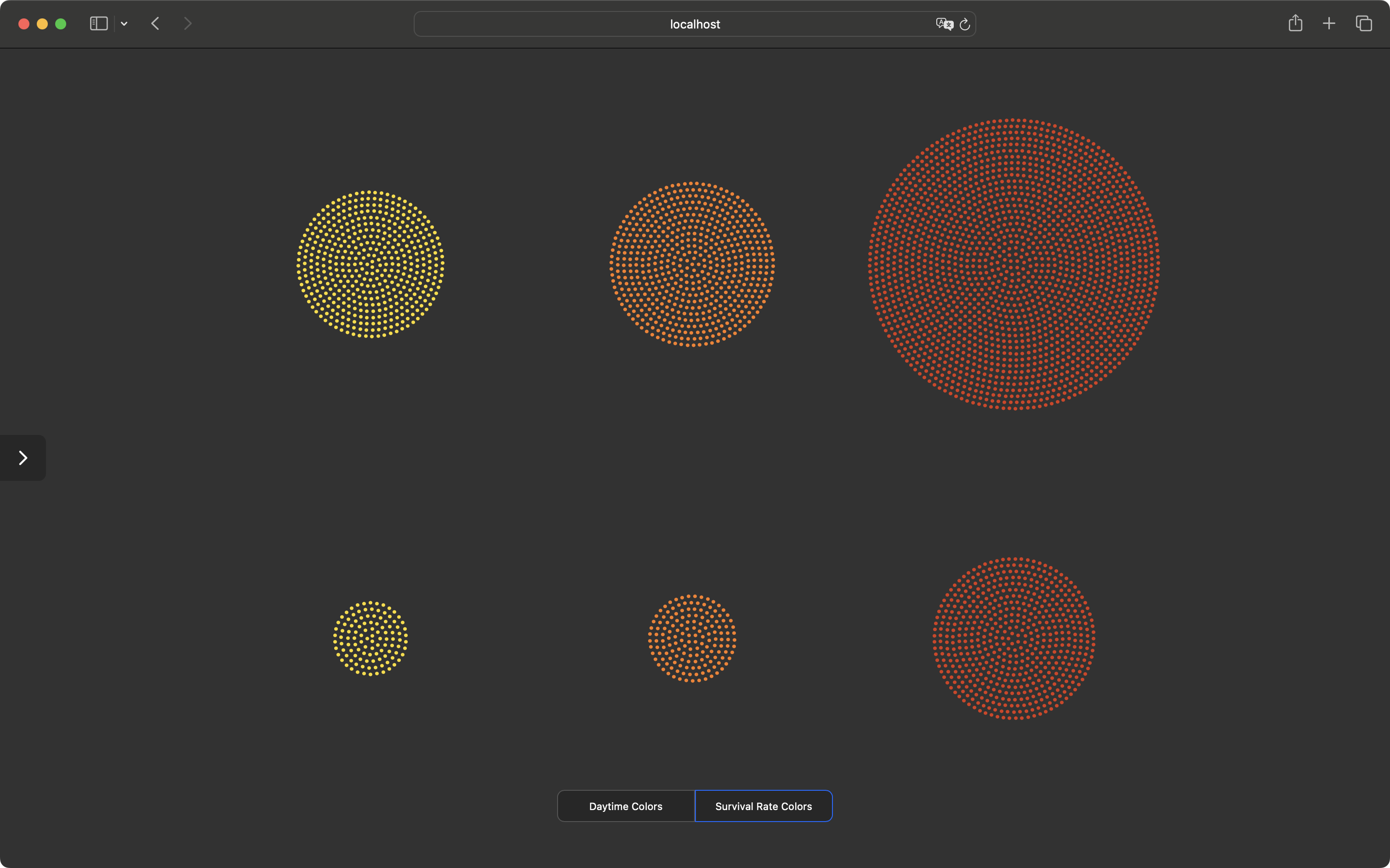 - Mittels eines Buttons lässt sich die Farbwahl von der Standard-Tag- / Nachtfarbwahl zur Überlebensquotenfarbwahl wechseln. Alternativ könnte die Farbwahl beim Hovern über der Gesamtfläche einer der großen Kreise automatisch wechseln.