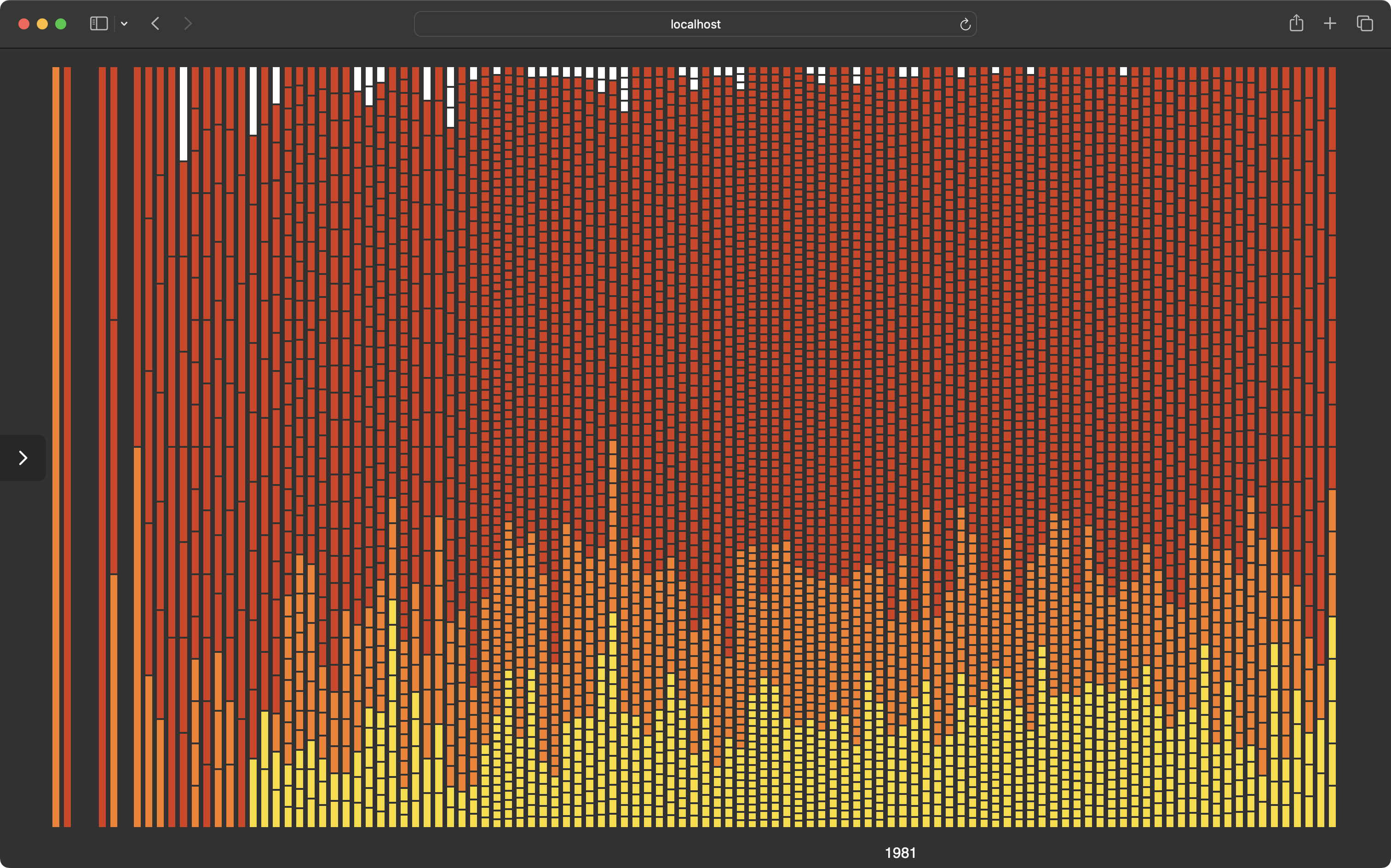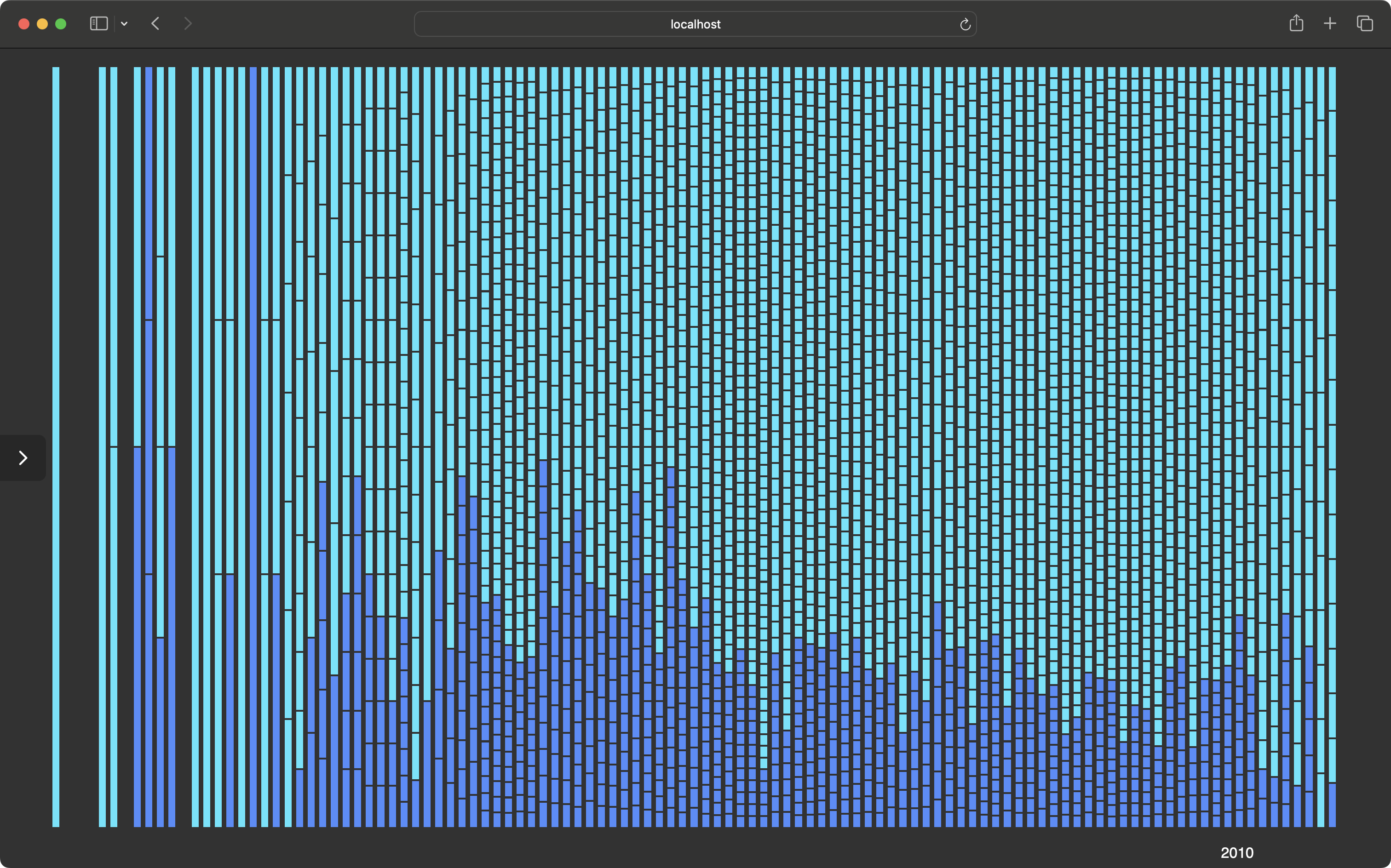 - Eine Zeitleiste wurde hinzugefügt, die zunächst aus um 90 Grad gedrehten Zahlen bestand. Da diese schwer lesbar waren, wurden nur noch alle 5 Jahre angezeigt.