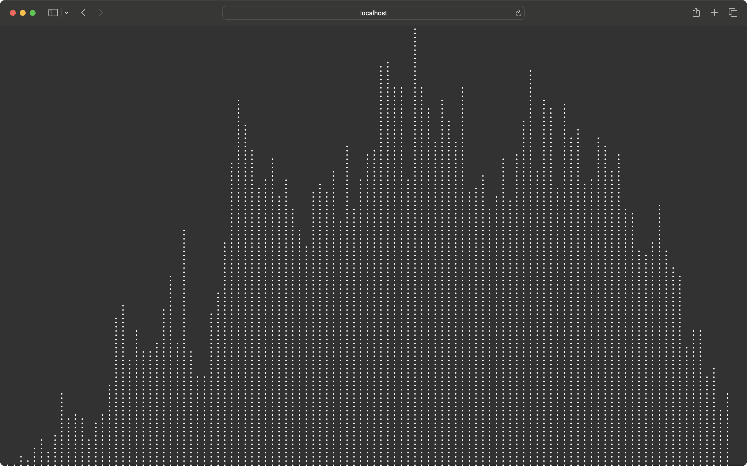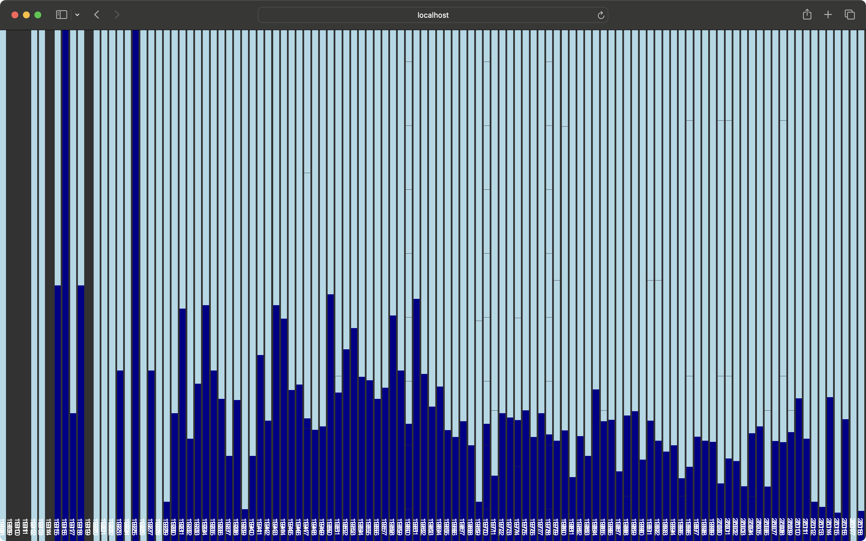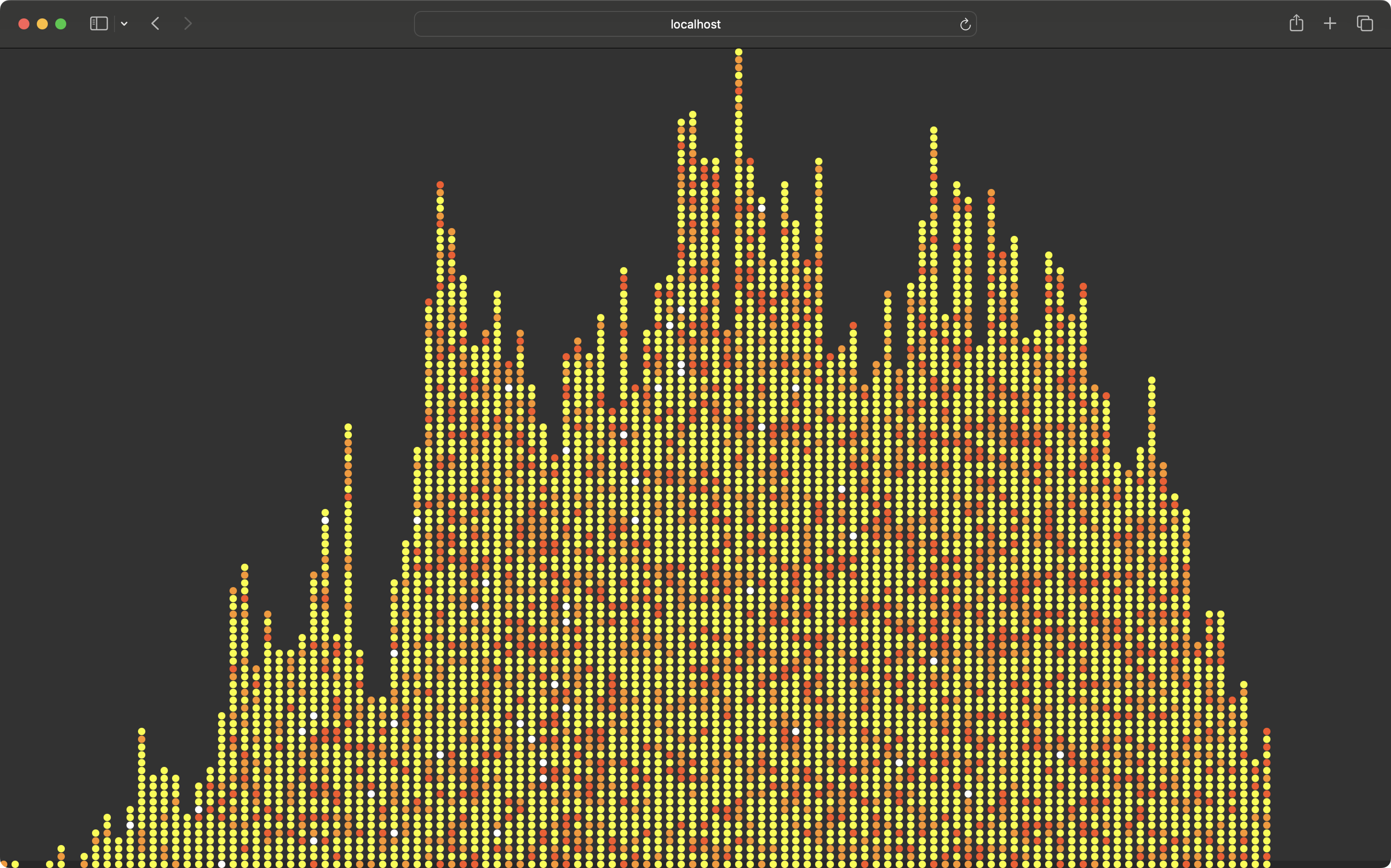 Um ein erstes Gefühl für die Daten zu bekommen, habe ich auf Empfehlung meines Professors eine Visualisierung erstellt, die alle Abstürze über die Jahre verteilt darstellt. Die X-Achse zeigt die Anzahl der Abstürze, die Y-Achse die Jahre. Diese Visualisierung wurde als Balkendiagramm umgesetzt, wobei jeder Absturz als Punkt dargestellt ist.