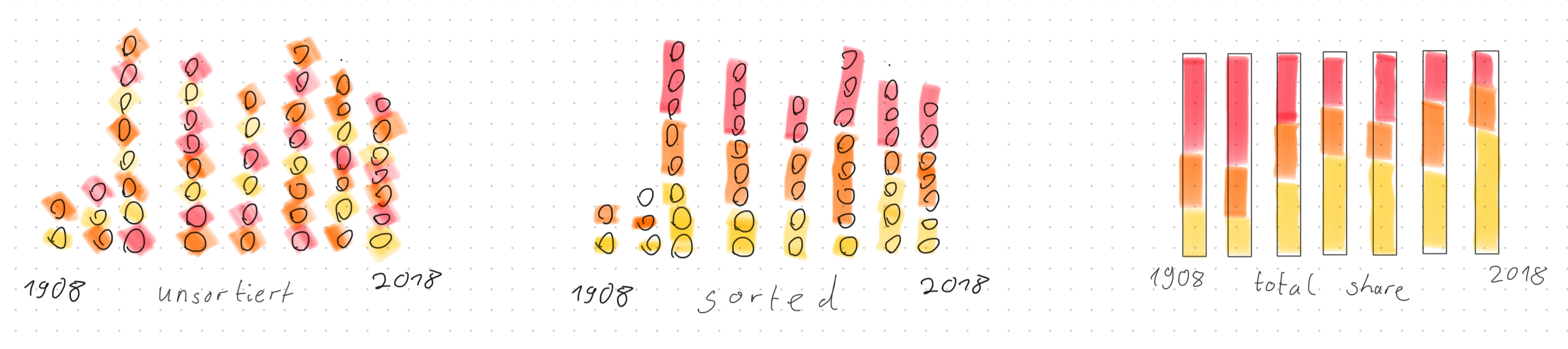 - Es gab zwei Ansätze: Erstens, die bestehende Datenvisualisierung über die Jahre hinweg nach dem Härtegrad einzufärben, und zweitens, die jährliche prozentuale Aufteilung des Härtegrades darzustellen, um die Verteilung der Härtegrade im Zeitverlauf zu analysieren.