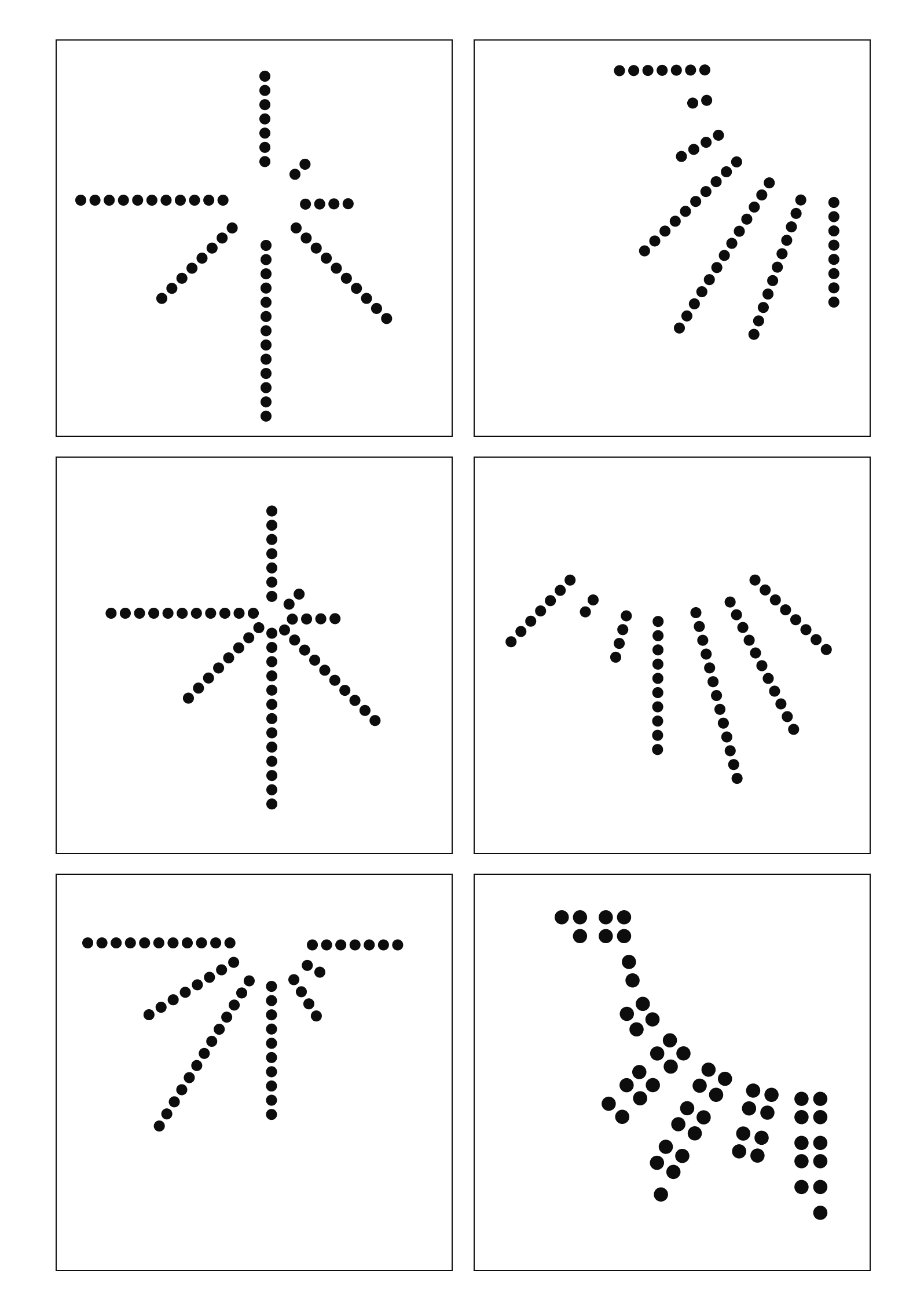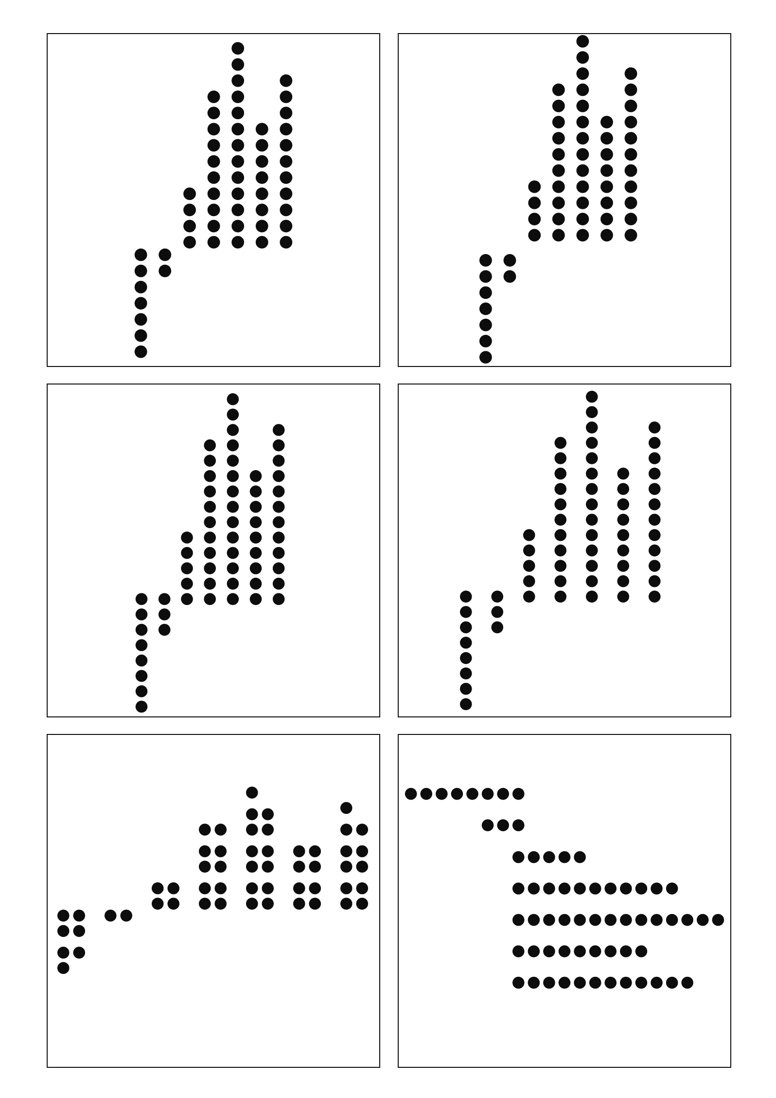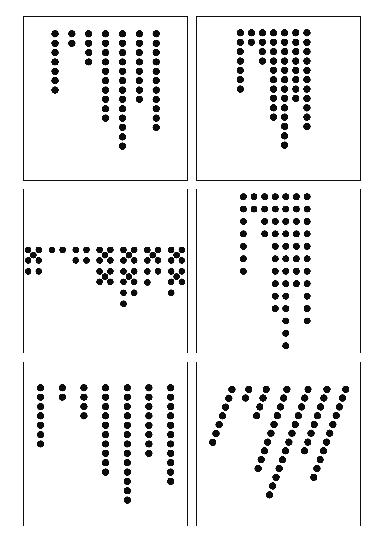 Gegeben war eine Datenreihe (7, 2, 4, 10, 13, 8, 11), die unterschiedliche Wetterinformationen von sieben aufeinanderfolgenden Tagen repräsentierte: Sonnenstunden, Niederschlagsmenge und Temperatur. Die Aufgabe bestand darin, für jede dieser Wetterinformationen einfache, aber prägnante und semantisch aufgeladene Datenvisualisierungen ausschließlich mit kleinen Punkten in einem quadratischen Format zu skizzieren. Alle Punkte sollten die gleiche Größe haben und nur zur Darstellung der Daten verwendet werden, nicht zur Strukturierung (z.B. Skalen oder Trennungen). Es wurden verschiedene Möglichkeiten der Darstellung ausgelotet, wobei die Positionierung und Anordnung der Punkte die entsprechende Information bedeutungsvoll wiedergeben sollte. Dabei wurde auch berücksichtigt, dass Temperaturwerte negativ sein können.
