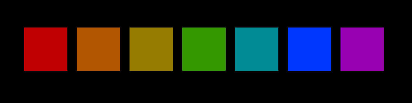 “Erstelle auf einem schwarzen Hintergrund eine Sammlung von sieben Farben. Die Farben sollten gut unterscheidbar sein, aber auch ein harmonisches Ganzes bilden. Alle sollen gleich wichtig sein.”