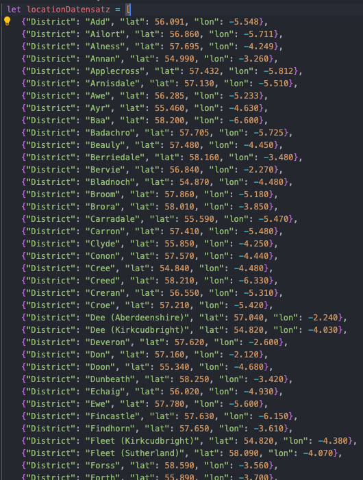 Anschließend konvertierte ich die CSV-Datei mithilfe von ChatGPT in eine JSON-Datei, was reibungslos funktionierte. Um die Distrikte auf einer Karte darzustellen, ermittelte ich die Breitengrade (Latitude) und Längengrade (Longitude) jedes einzelnen Distrikts mithilfe von Google Maps und integrierte diese in die Visualisierung.