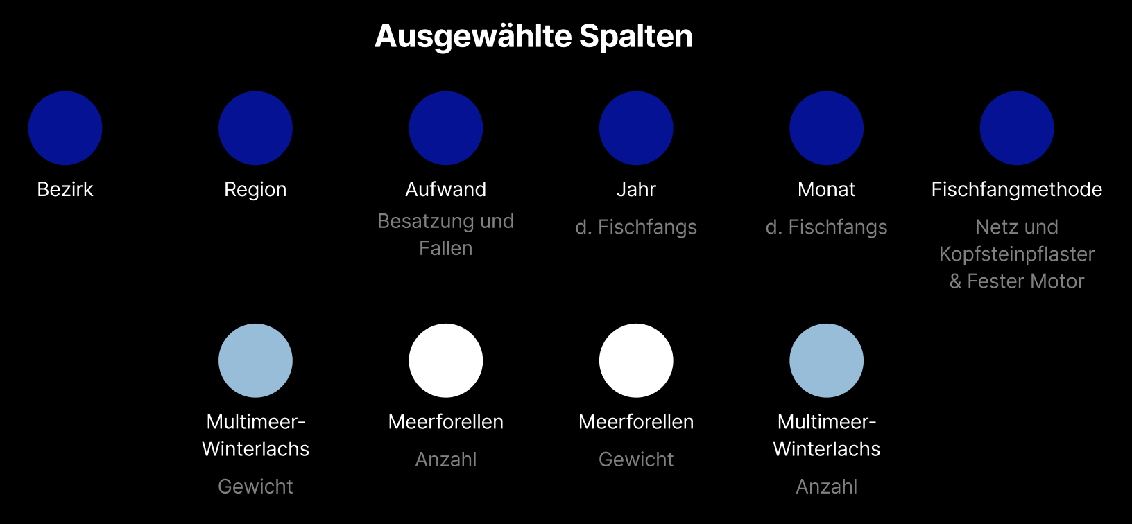 Mein Datensatz stammt von Kaggle.com und umfasst insgesamt 21 Spalten bei einer Größe von 2,46 MB. Er enthält Daten zu vier Fischarten: wildem Mehrmeerjahres-Lachs (MSW), Einmeerjahres-Lachs (1SW), Meerforellen und Finnock. Der Datensatz ist in Regionen und Bezirke unterteilt, jedoch ohne GEO-Daten. Ziel meiner Analyse war es, zeitliche und räumliche Muster in den Fangdaten zu erkennen und zu visualisieren.