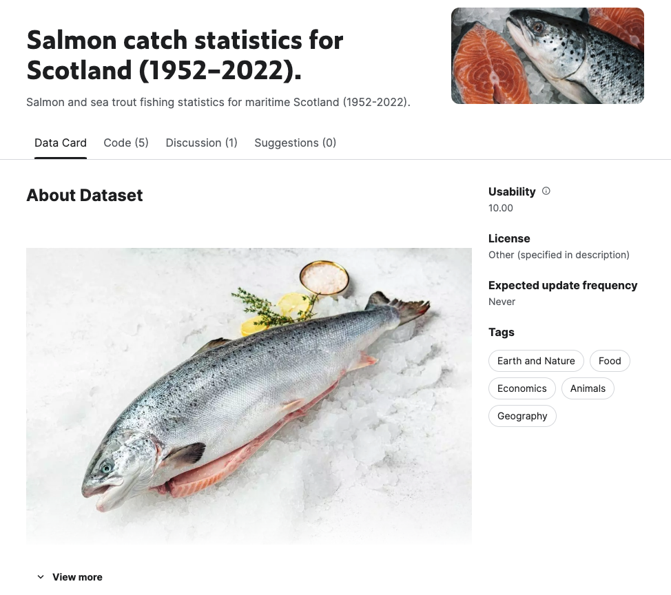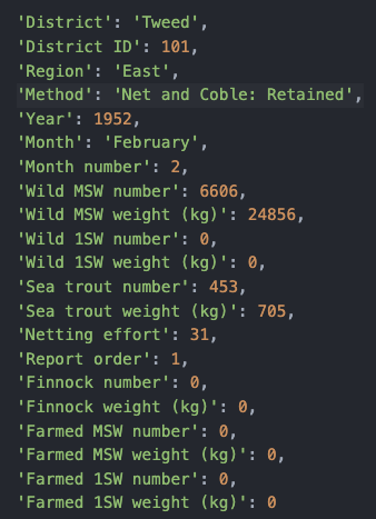 →Maurice CadauMarine Scotland teilt die Daten geografisch in 109 Bezirke ein, die weiter in 11 Regionen aggregiert werden. Der Datensatz enthält Informationen zu verschiedenen Fangmethoden und umfasst jährliche und monatliche Berichte von gefangenen Fischen. Erfasst werden sowohl die Anzahl als auch das Gewicht von verschiedenen Fischarten. Zusätzlich werden Daten zu gefangenen Zuchtfischen und dem Aufwand aufgezeichnet.