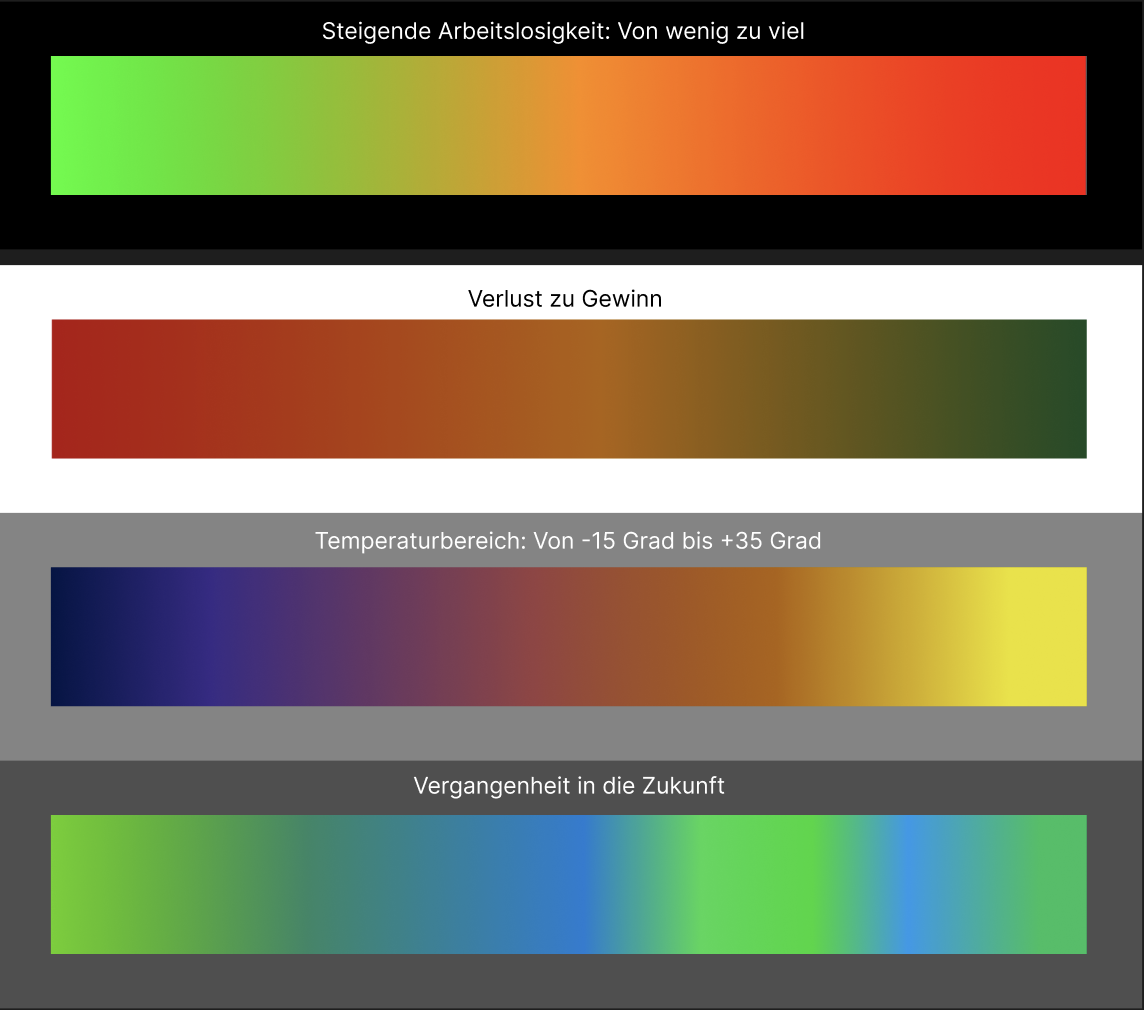 Im zweiten Teil der Aufgabe sollten wir Farbskalen für verschiedene Themen erstellen. Die Hintergrundfarbe wurde dabei vorgegeben. Für die letzte Skala durften wir selbst ein Thema wählen.