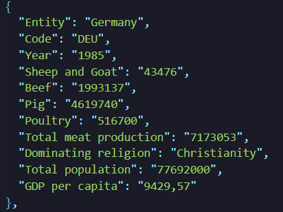 Um meine Fragen beantworten zu können, habe ich drei verschiedene Datensätze kombiniert. Der Datensatz World Meat Production Datasets 1961 - 2018 diente als Grundlage, und die Informationen zur Hauptreligion stammen aus dem Datensatz Religious Populations Worldwide, beide von Kaggle. Zusätzlich habe ich das GDP pro Kopf aus dem Datensatz GDP per capita (current US$) von World Bank Group hinzugefügt.