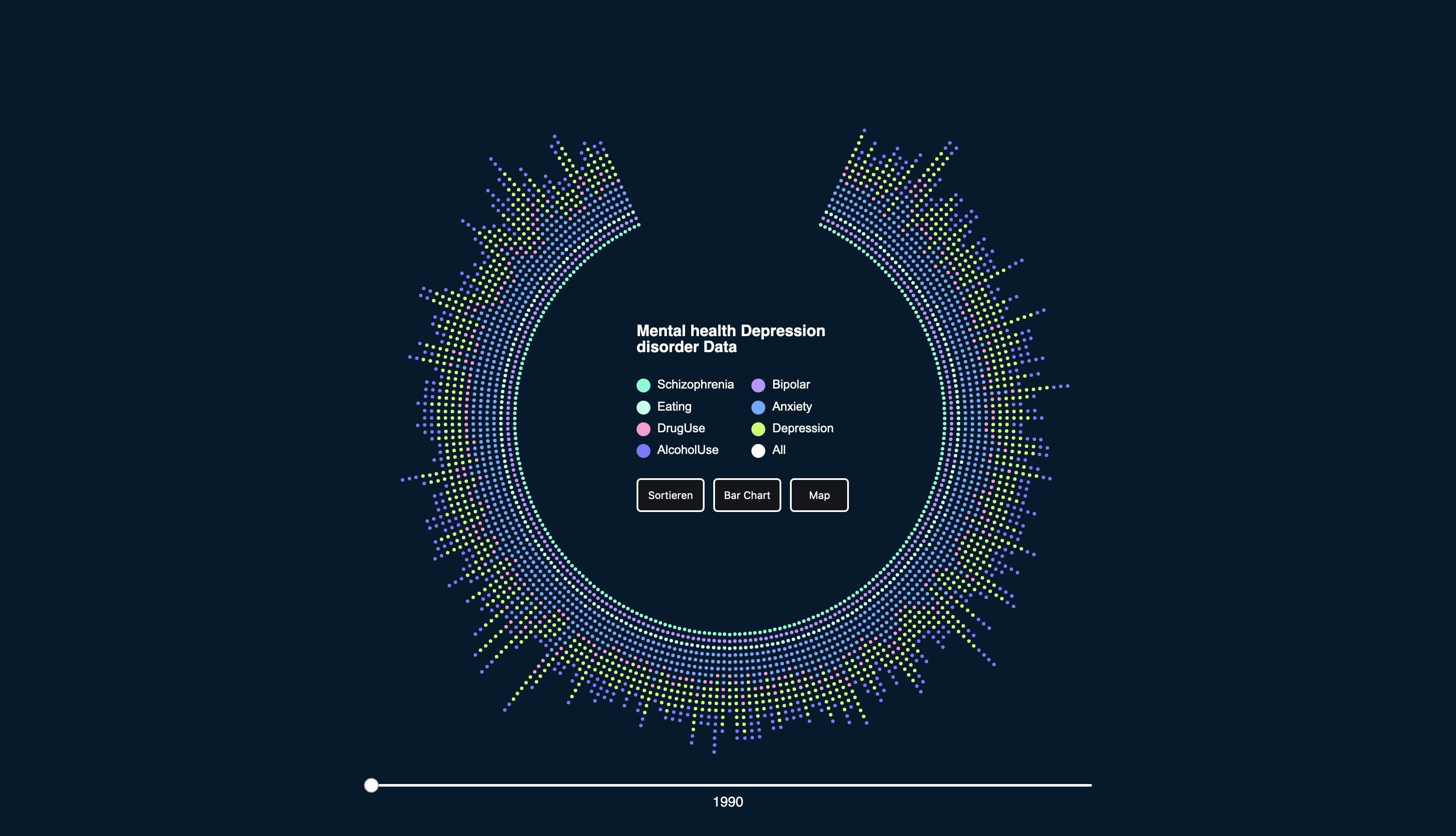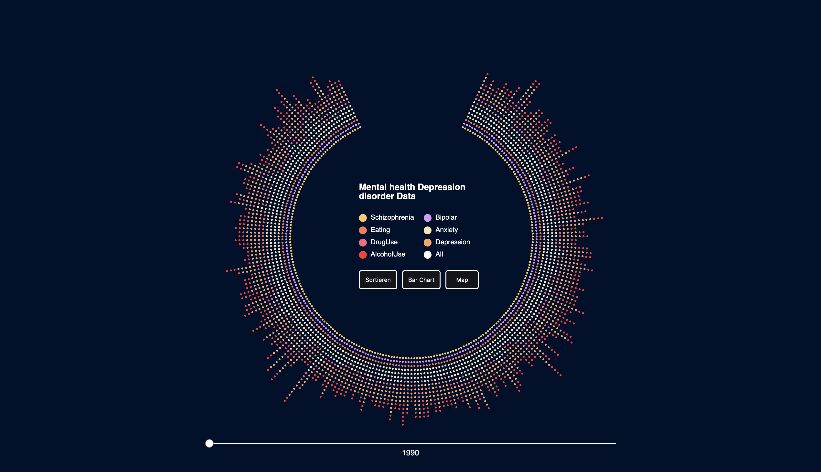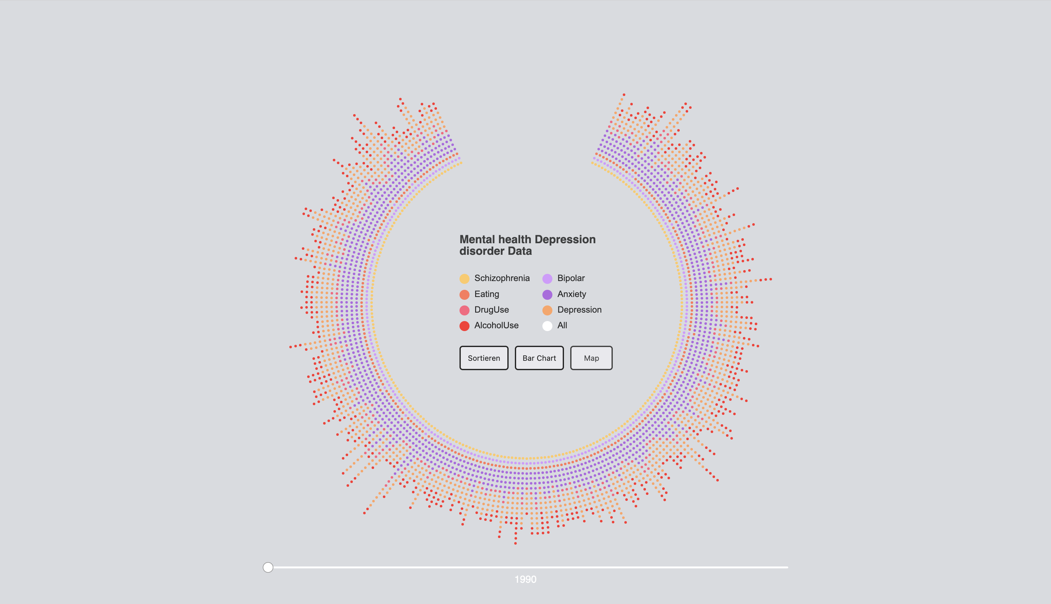 Nachdem ich mich relativ schnell auf Farben für meine Visualisierung festgelegt hatte, wollte ich doch noch einmal etwas ausprobieren und habe daher verschiedene Kombinationen getestet. Allerdings haben mir meine Farbvarianten, die ich zu Beginn festgelegt hatte, am besten gefallen. Die Farben harmonierten miteinander und waren deutlich voneinander zu unterscheiden. Trotzdem wollte ich meine Versuche nicht vorenthalten.