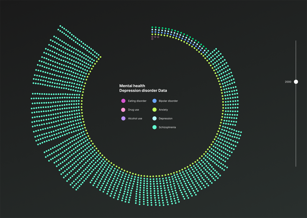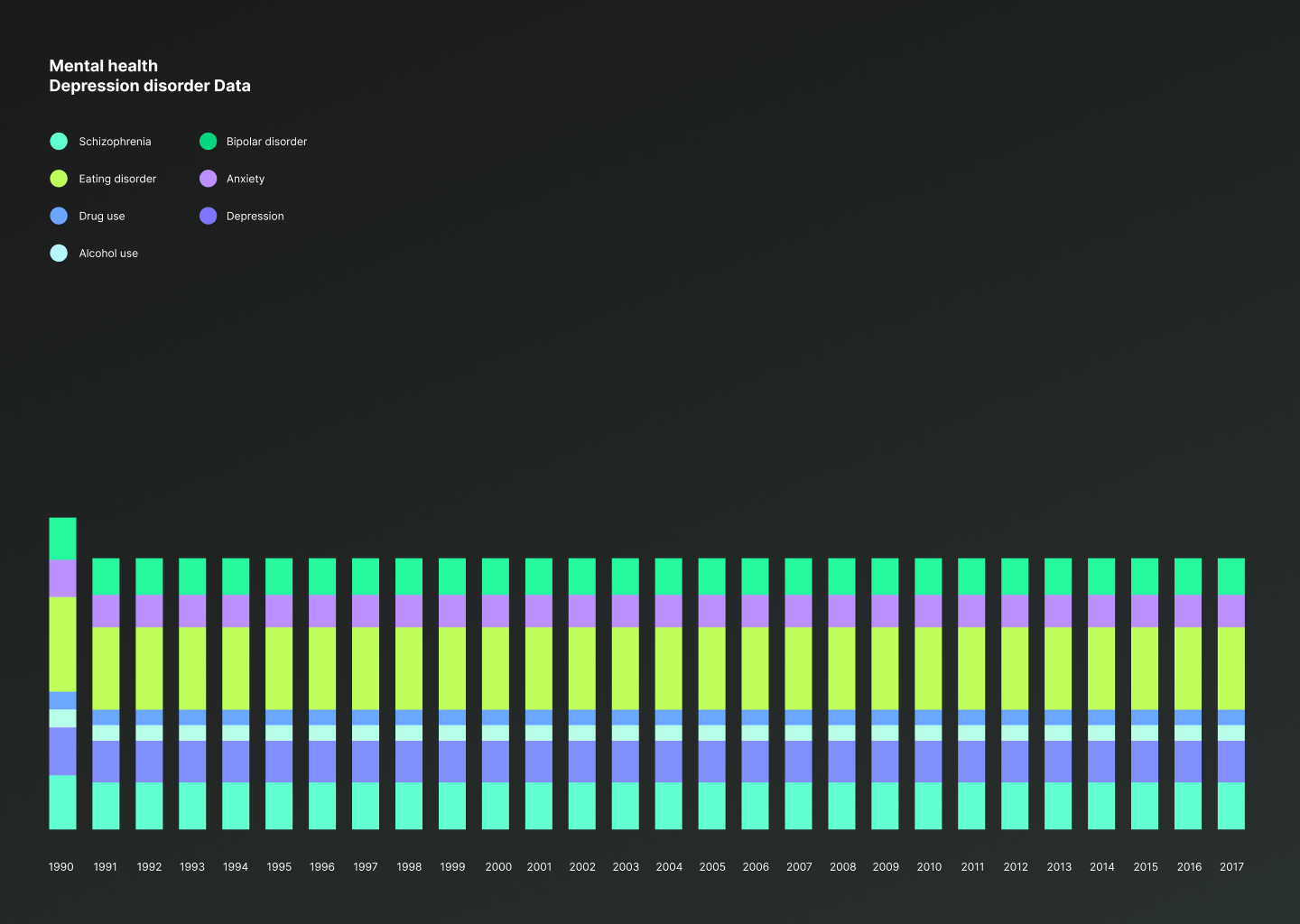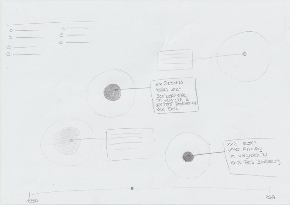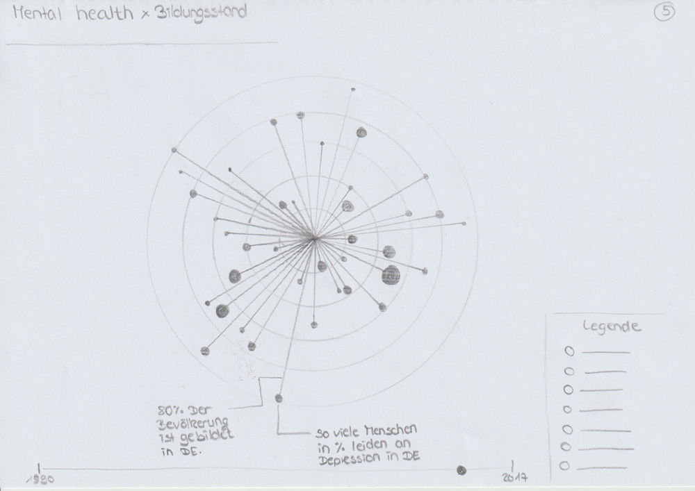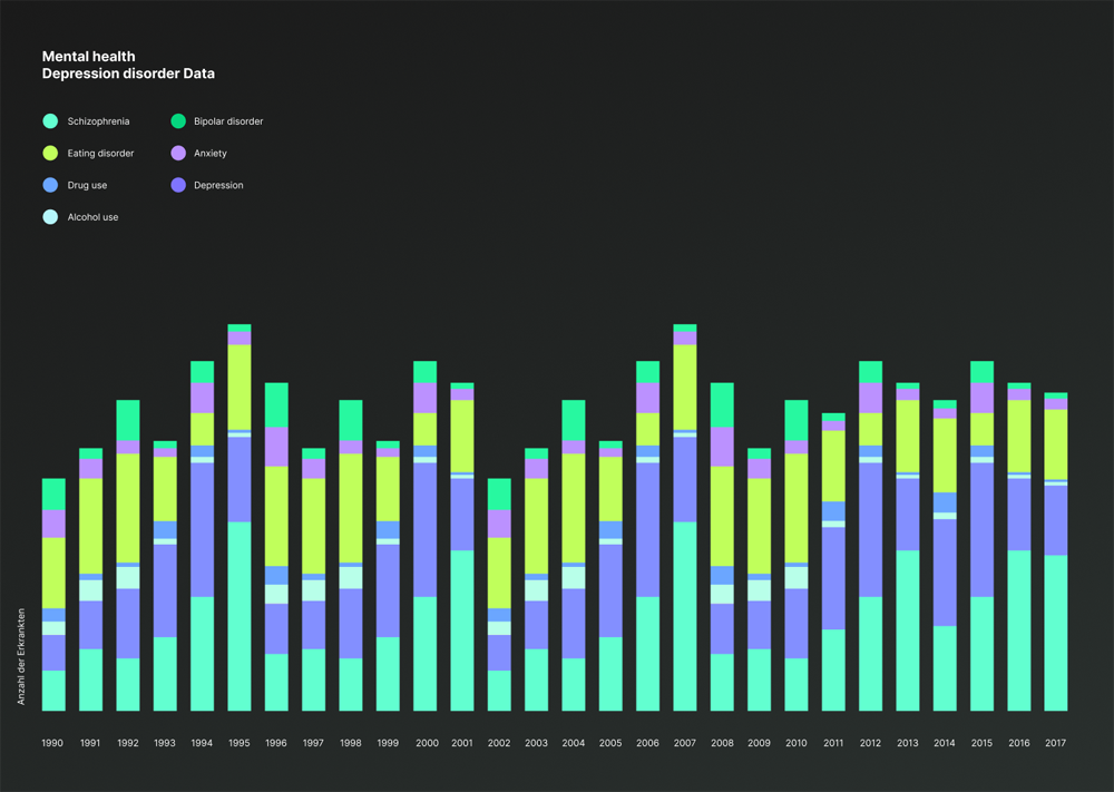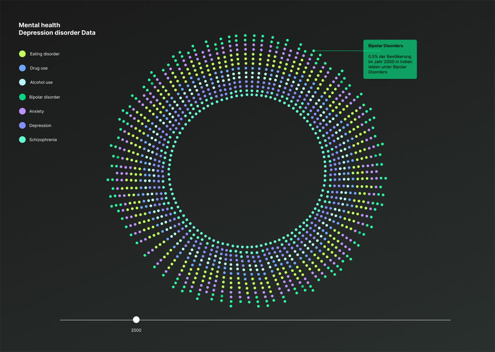 Was sich zuerst als gute Idee herausstellte, erwies sich später als Fehler, da ich mich hätte früher mit meinen Daten beschäftigen sollen. Obwohl ich viele visuelle Ideen hatte, hätte ich zuerst prüfen sollen, ob diese überhaupt mit den verfügbaren Daten umsetzbar wären. Daher habe ich mich schließlich rein auf meinen Datensatz mit den mentalen Krankheiten fokussiert.