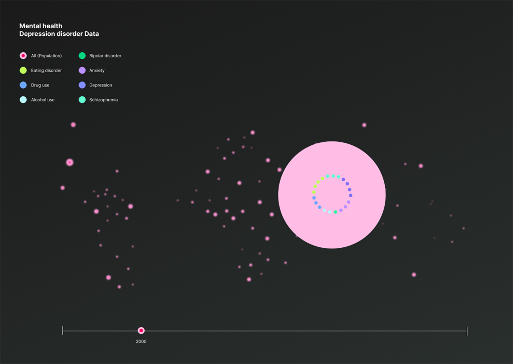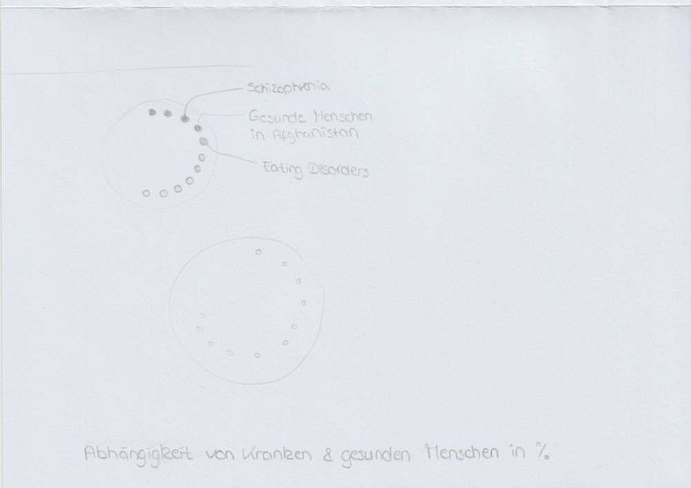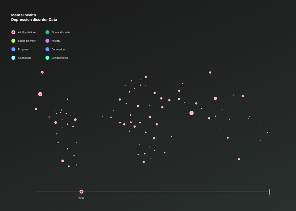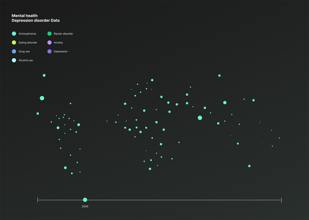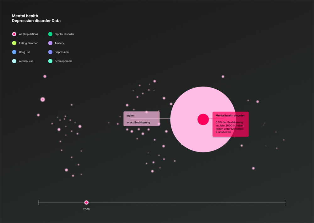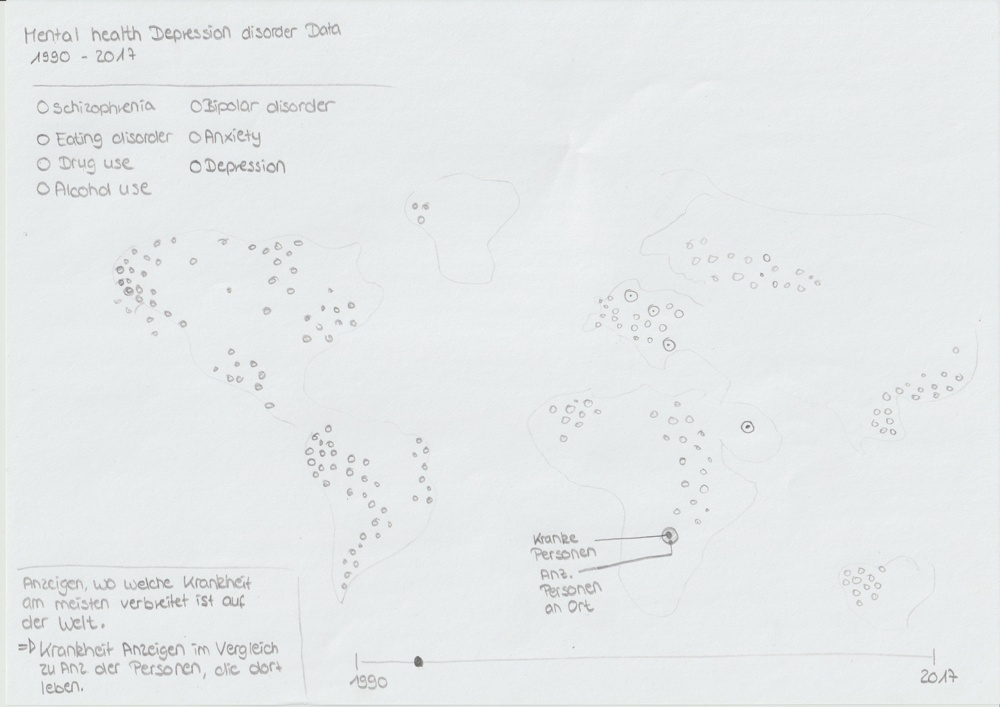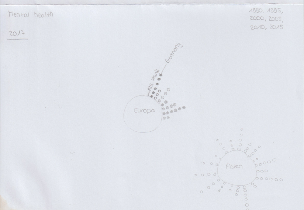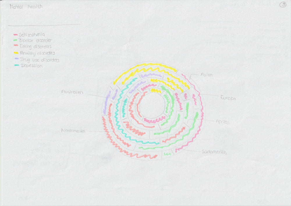 Meine erste Idee war es, auf einer Weltkarte darzustellen, in welcher Region beispielsweise Schizophrenie am stärksten verbreitet ist. Dann überlegte ich, die Bevölkerungszahl auf der Weltkarte darzustellen und im Zusammenhang damit als roten Punkt, wie viele Menschen der Bevölkerung an mentalen Krankheiten erkrankt sind, bzw. wie viele an Schizophrenie, Depressionen usw. erkrankt sind. Dann habe ich jedoch festgestellt, dass mein Datensatz dies nicht hergibt, da es ja sein kann, dass Menschen an mehreren mentalen Krankheiten erkrankt sind.