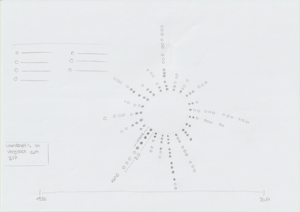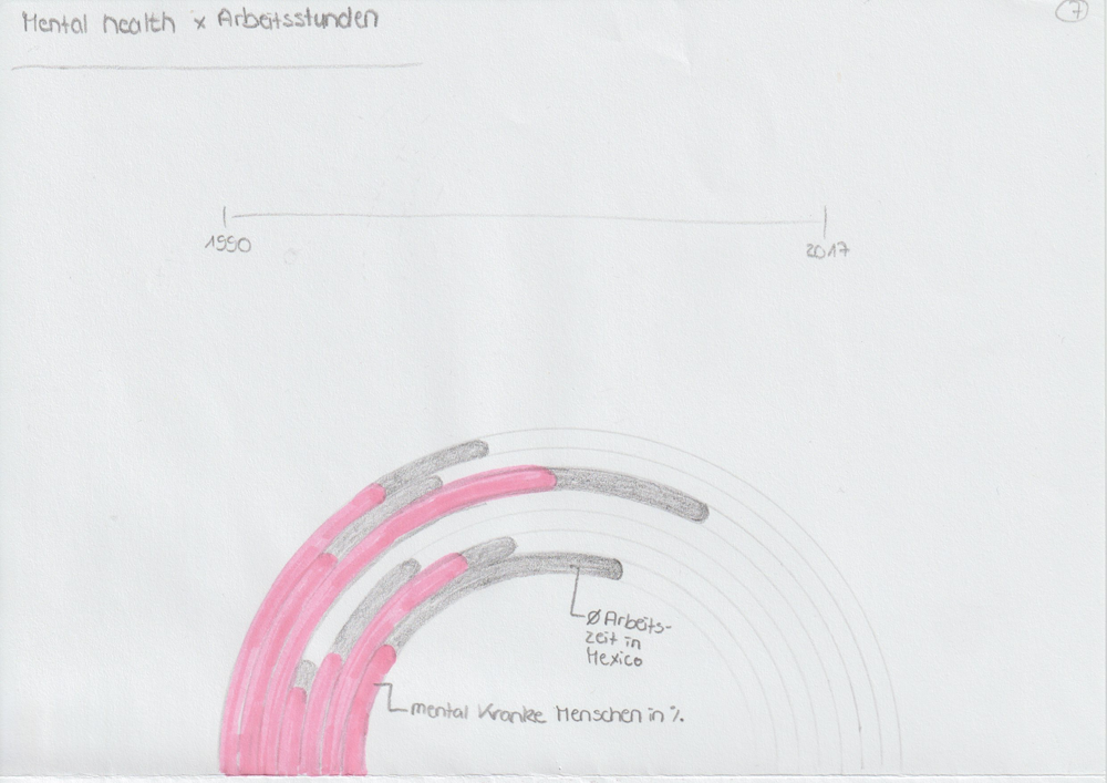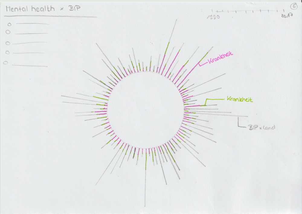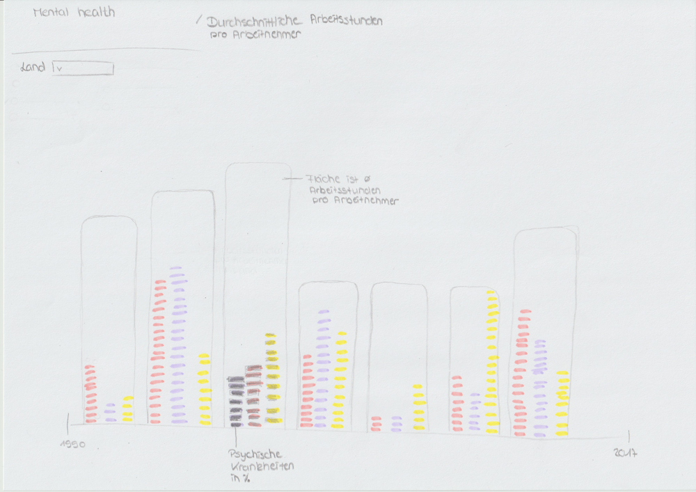 Meine Skizzen reichten von einer Karte, auf der die Anzahl der Krankheiten im Verhältnis zur Bevölkerungsanzahl dargestellt werden sollte, bis hin zu einem Strahlendiagramm. Ein Balkendiagramm, das die Arbeitsstunden pro Arbeitnehmer mit den mentalen Krankheiten vergleicht, sowie ein Vergleich mit dem BIP eines Landes. Ursprünglich hatte ich geplant, meinen Datensatz mit weiteren Datensätzen wie dem Bildungsstand, dem BIP, den Arbeitsstunden und der Bevölkerung zu vergleichen.