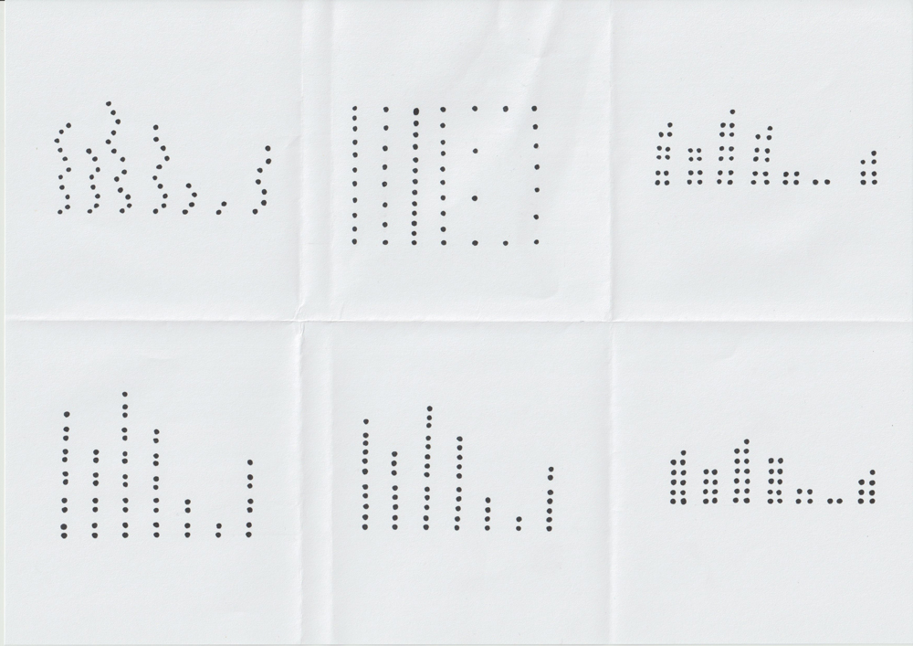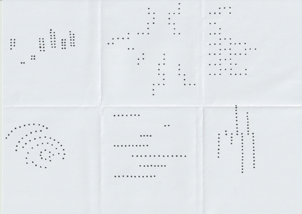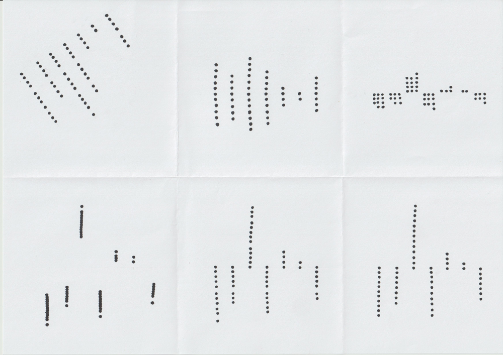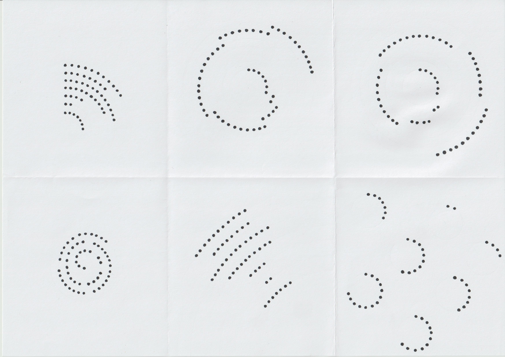 Ein weiterer Teil der Übungen bestand darin, aus sieben Datenwerten (7, 2, 4, 10, 13, 8, 11) Diagramme für folgende Thematiken zu visualisieren: Sonnenstunden, Niederschlagsmenge und Temperatur über sieben Tage. Dafür falteten wir Papier in sechs Felder, sodass wir Platz für 18 Visualisierungen hatten. Für jede Wetterinformation sollten einfache und prägnante Datenvisualisierungen mit kleinen, gleich großen Punkten skizziert werden, die nur zur Darstellung der Daten dienten.