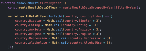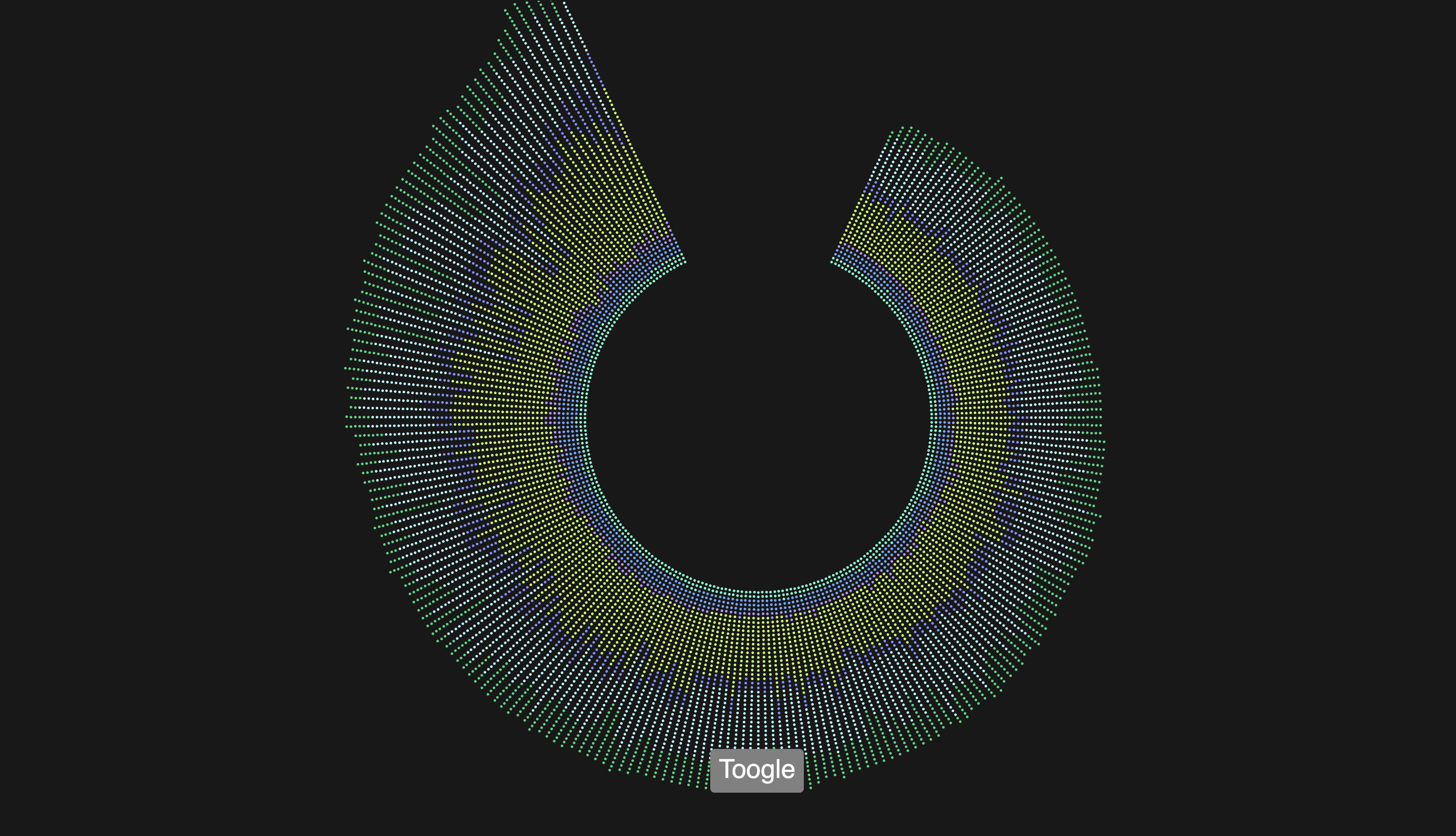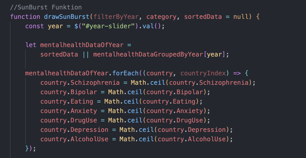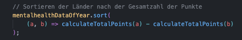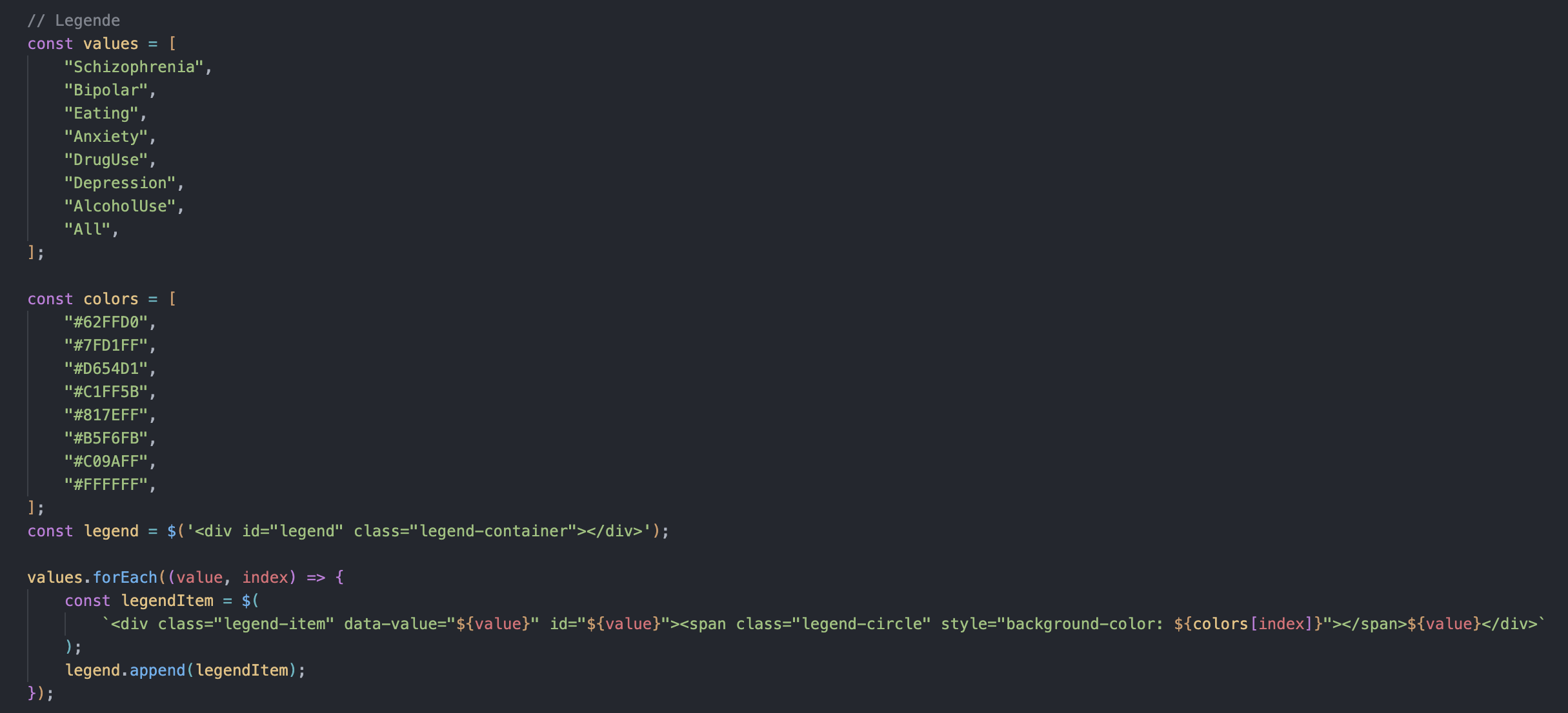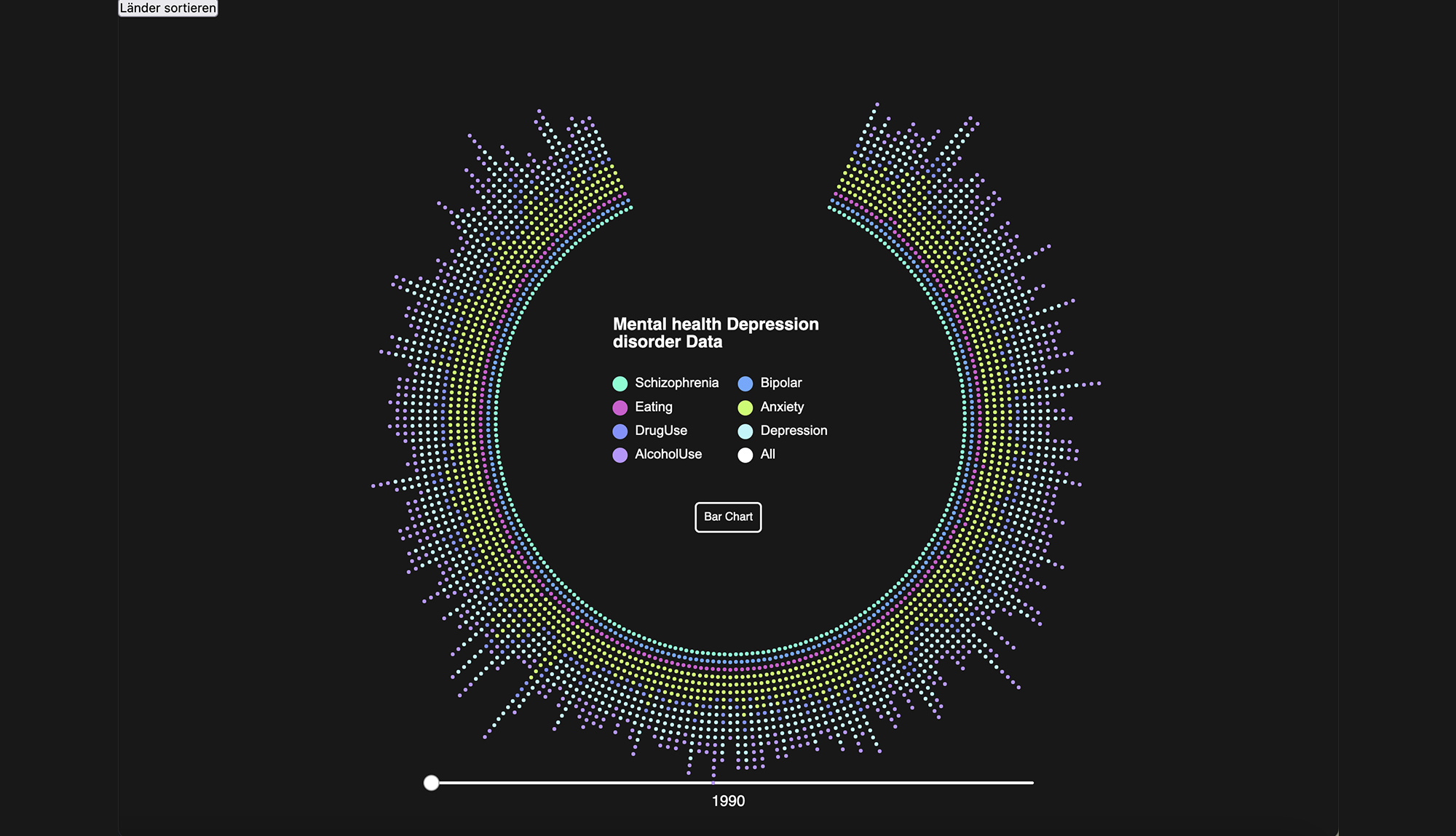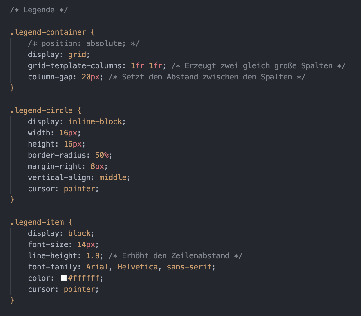 Anschließend habe ich die Legende und Schrift mit Hilfe von CSS mittig angeordnet und einen Toggle für den zweiten Bildschirm integriert. Außerdem entschied ich mich dafür, dass mein Strahlendiagramm zunächst nach dem Alphabet der Länder erscheinen soll und diese Sortierfunktion durch einen Button aktiviert werden kann. Generell habe ich versucht, das Styling in die CSS-Datei auszulagern.