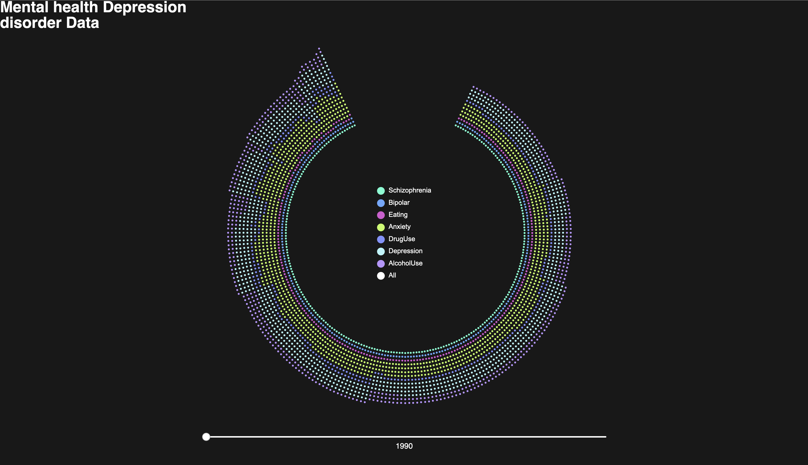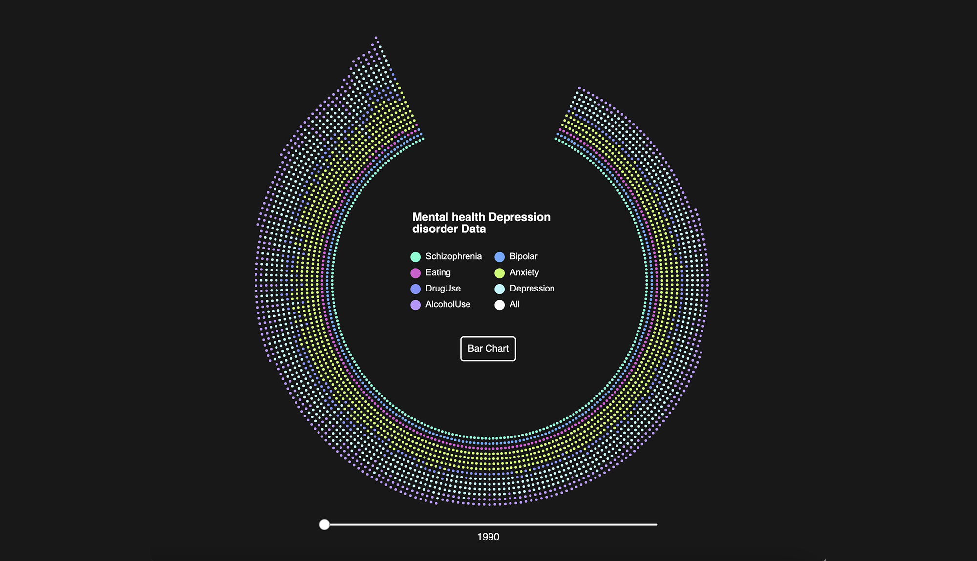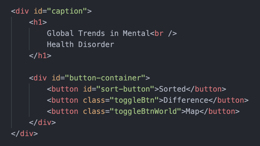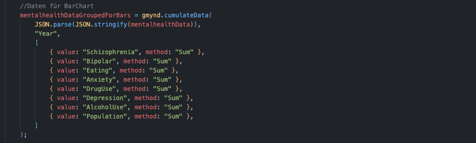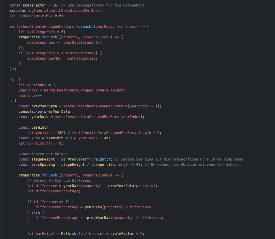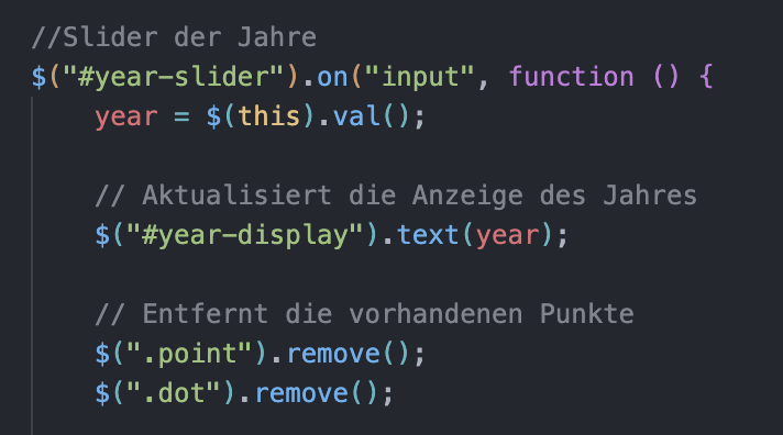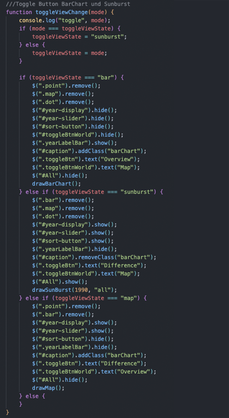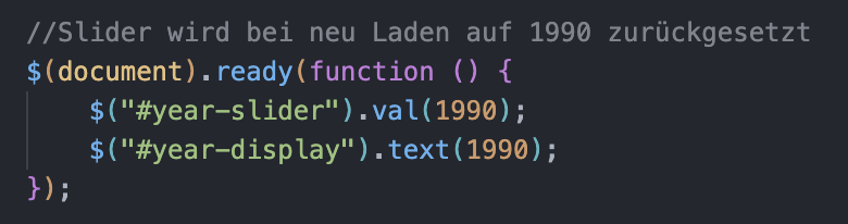 Der Toggle-Button stammte noch aus einer früheren Hausaufgabe aus dem Kurs Programmiersprachen 2. Daher begann ich nun mit weiteren gestalterischen Elementen, wie der Überschrift, der Legende und meinem Slider, der durch die Jahre iterieren sollte. Hierbei lässt sich auch erkennen, dass sich die Farben im Vergleich zu meiner ersten Ansicht noch etwas geändert haben, da die Unterscheidbarkeit in manchen Fällen noch nicht ganz gegeben war. Außerdem wurde die Rundung der Werte nochmals im Code angepasst. Es ist ebenfalls zu erkennen, dass hier die Ansicht der Länder bereits nicht mehr nach dem Alphabet, sondern nach der Größe sortiert wird.