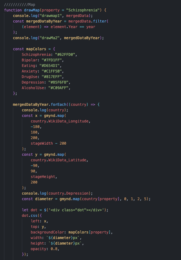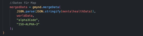 Für die Weltkartenansicht habe ich meinen Datensatz mit Daten der Längen- und Breitengrade der Welt gemercht. Dies funktionierte besonders gut, da mein Datensatz bereits den „alpha3Code“ enthielt. Somit konnte ich die Daten mergen und meine Weltkarte zeichnen lassen.