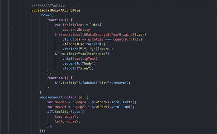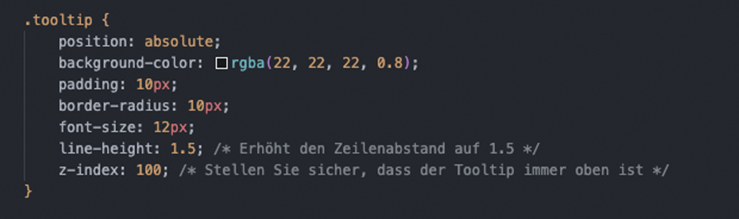 Die Tooltips erscheinen, wenn über die einzelnen Punkte oder Balken gehovert wird. Das Styling wurde dabei in CSS angelegt, der Tooltip an sich aber in JavaScript eingebunden.