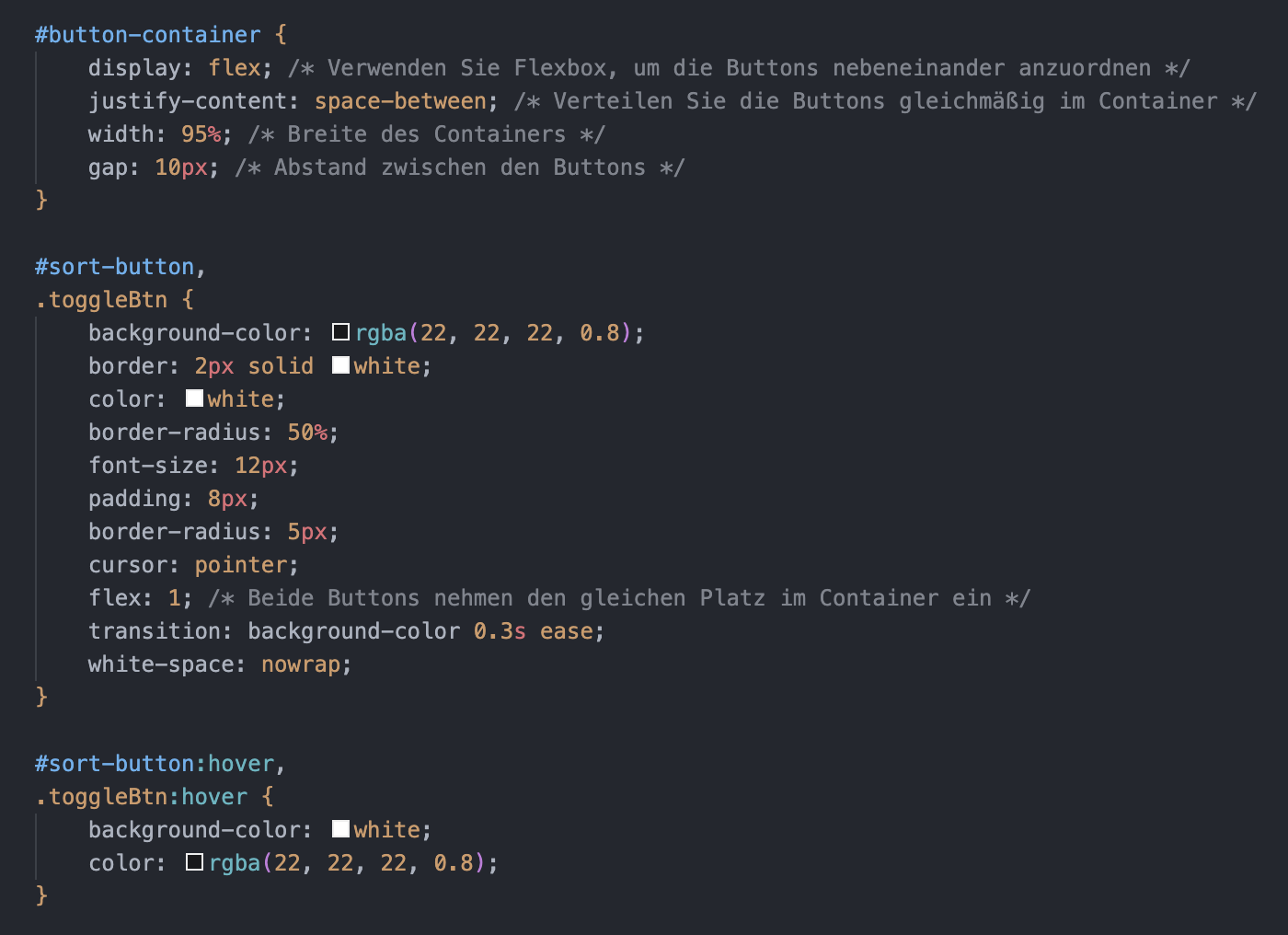 Durch meine ausführlichen Visualisierungen in Figma hatte ich bereits eine genaue Vorstellung davon, wie es am Ende aussehen sollte. Auch die Farben standen für mich schon relativ früh fest. Das erleichterte mir zu Beginn das Programmieren sehr, und meine ersten Versuche sahen schnell relativ „fertig“ aus, da die Farben und die Anordnung stimmten.