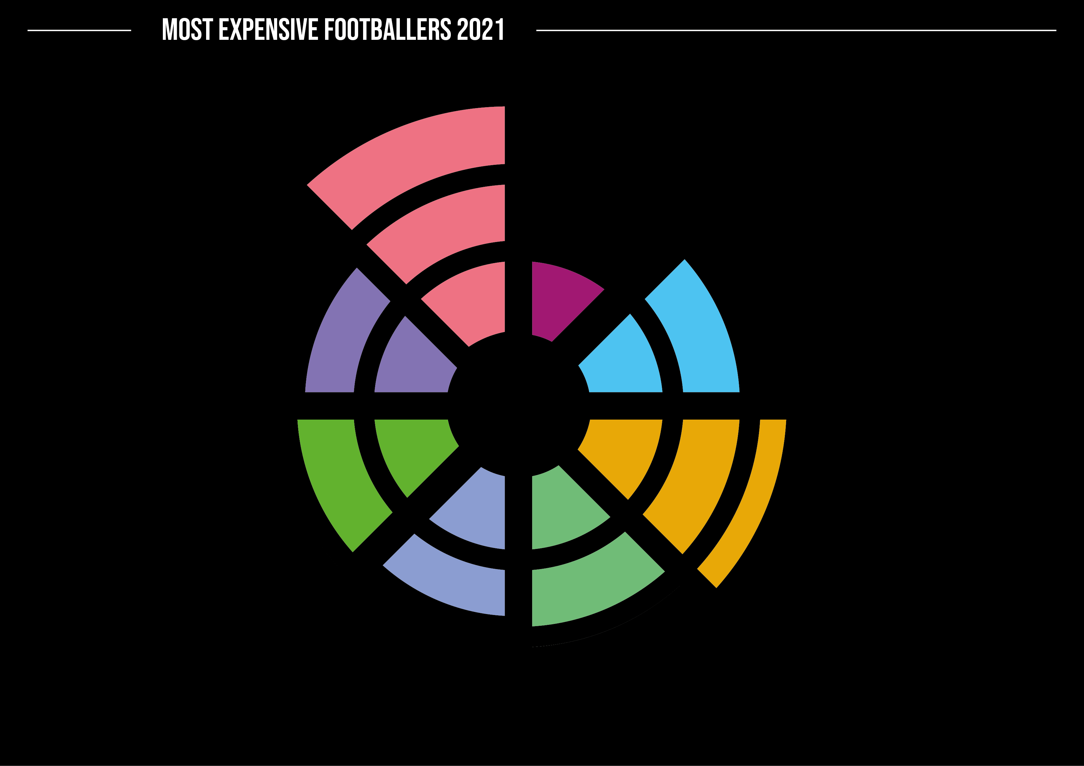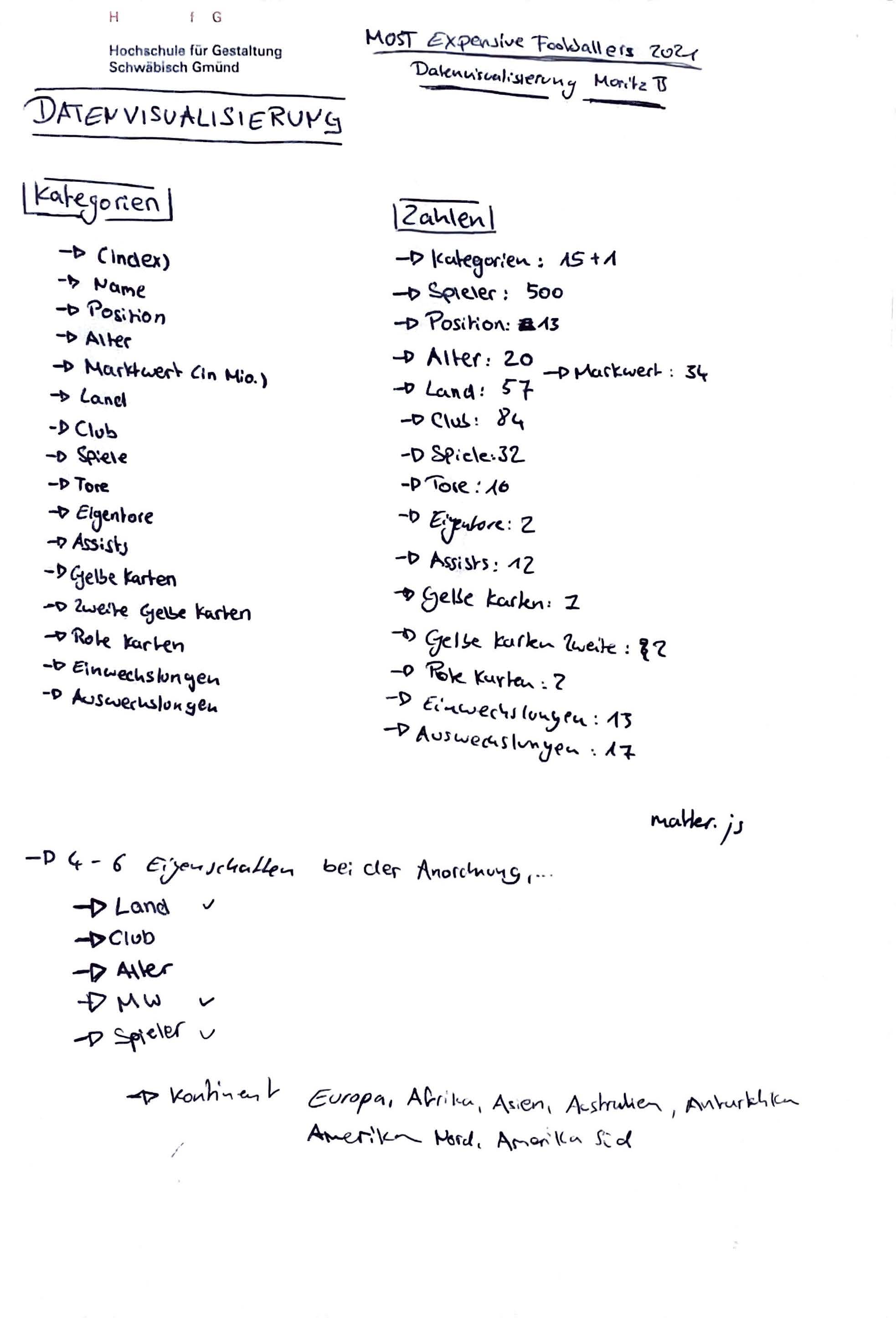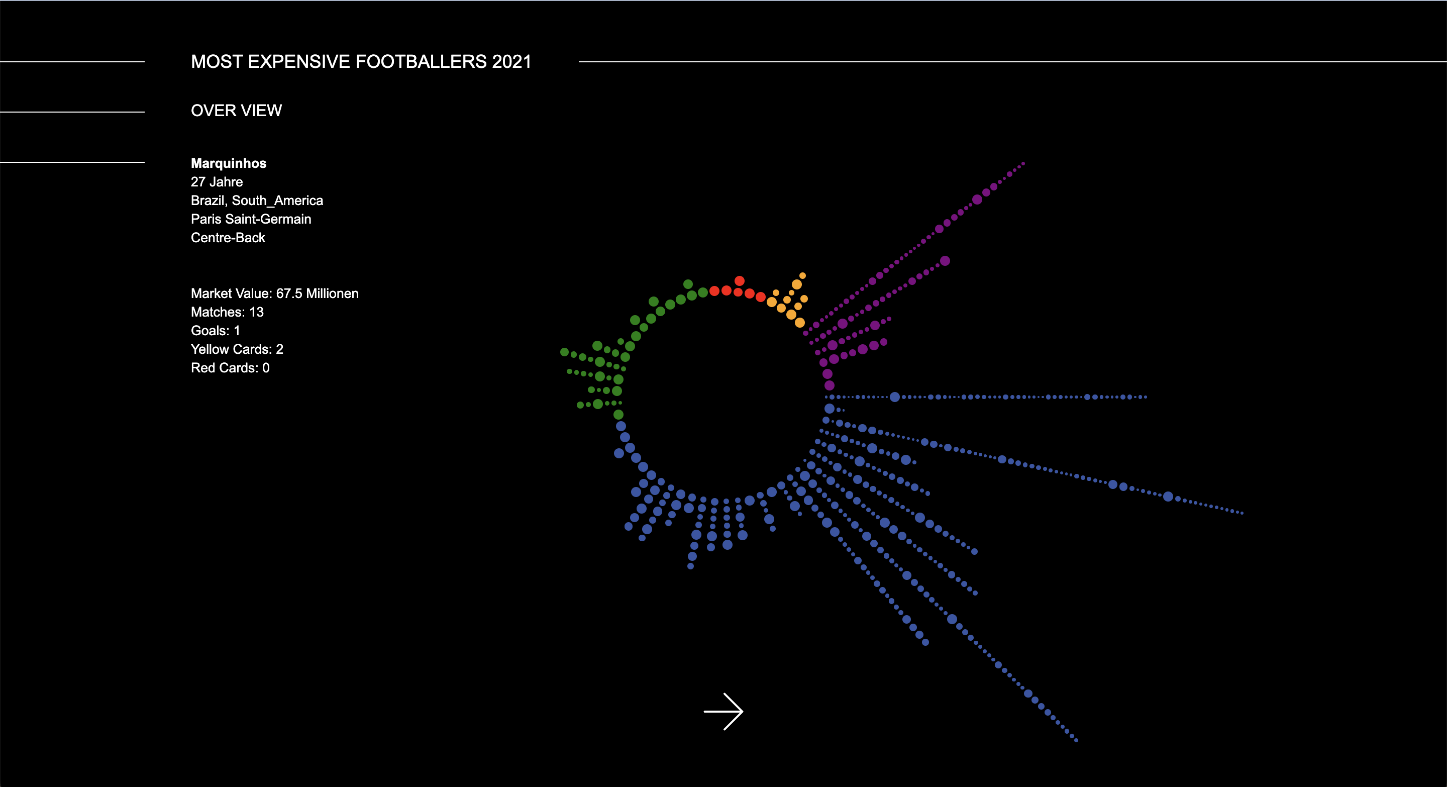 Die erste Idee war eine Übersicht über alle Spieler, die diese anhand von Blöcken zeigt. Die Höhe dieser Blöcke spiegelt den Marktwert wider, die Farbe zeigt den Kontinent an, und die einzelnen Stränge repräsentieren die jeweiligen Länder.