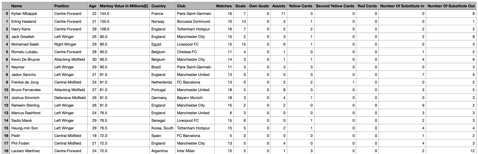 Der Datensatz, den ich ausgewählt habe, befasst sich mit den 500 teuersten Fußballspielern aus dem Jahr 2021. Er enthält 16 Spalten mit folgenden Kategorien: Index, Name, Position, Alter, Marktwert in Millionen, Herkunftsland, Verein, Anzahl der Spiele, Tore, Eigentore, Assists, gelbe Karten, zweite gelbe Karten, rote Karten, Anzahl der Einwechslungen sowie Auswechslungen.