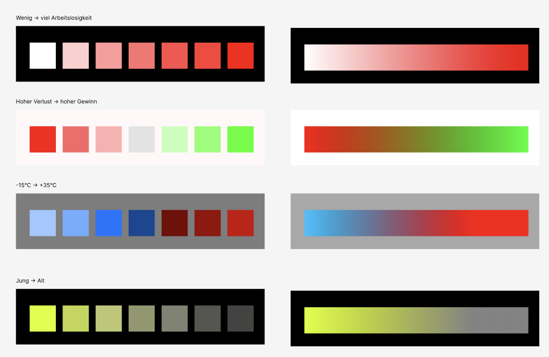 Eingangs habe ich mir überlegt, wie ich die Daten in einer passenden Visualisierung darstellen kann. Dabei haben mir Übungen geholfen, bei denen wir mittels Punkten verschiedene Themen inklusive ihrer Werte darstellen sollten. Anschließend haben wir eine ähnliche Übung durchgeführt, bei der wir Farben anstelle von Punkten verwendet haben, um ein Gefühl für aussagekräftige Farbverläufe zu bekommen.
