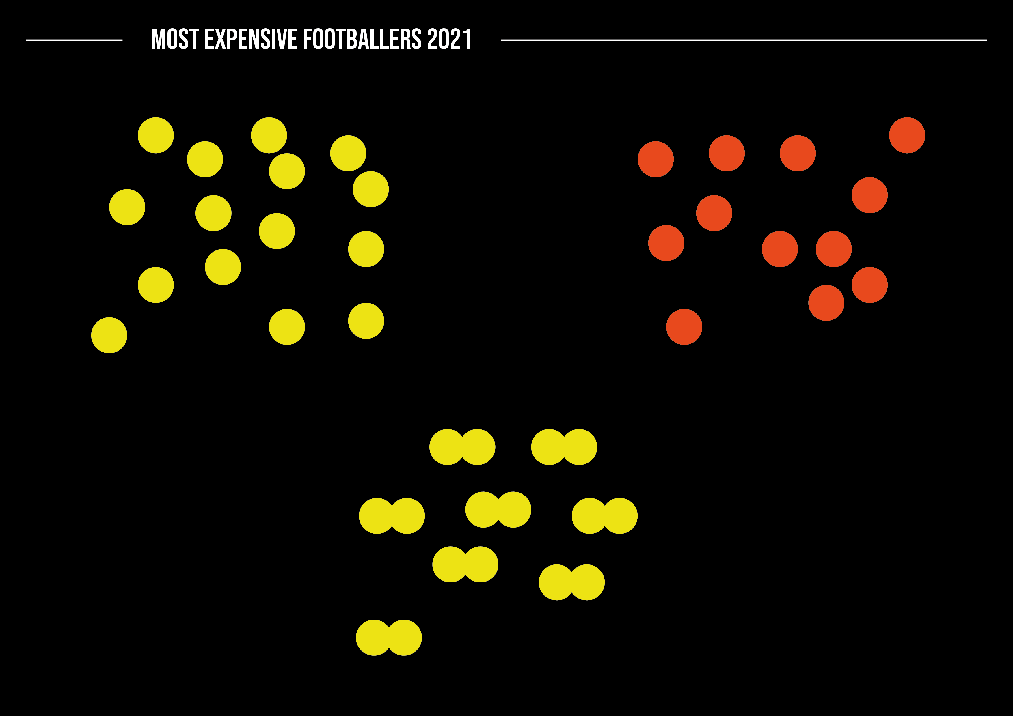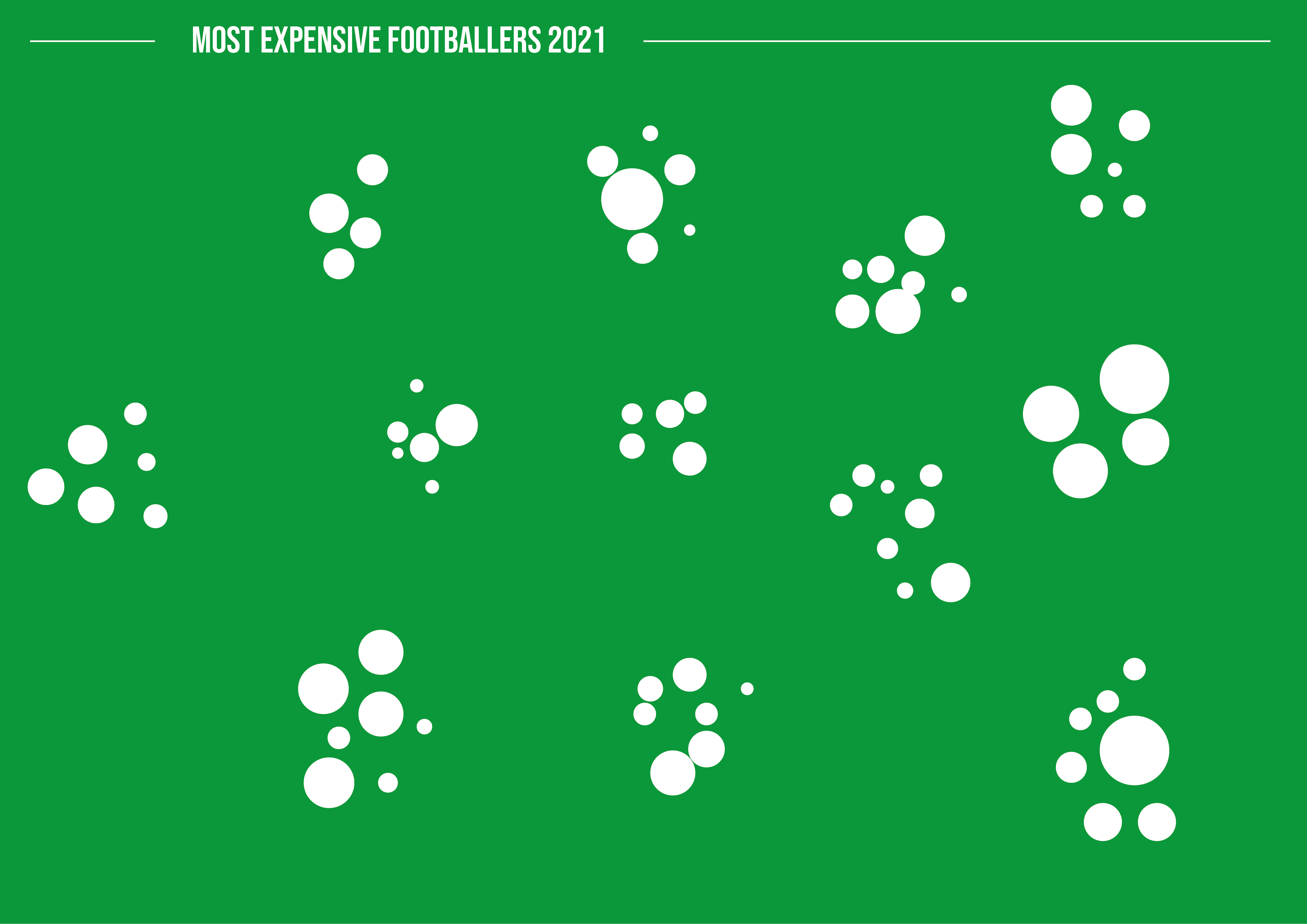 Die zweite Idee war, anhand der verschiedenen Positionen und deren Marktwerte der Spieler eine Perspektive zu schaffen. Dies ist interessant, da man hierbei einen guten Überblick darüber erhält, auf welchen Positionen die bestbezahlten Spieler spielen. Dabei wird jeder Spieler durch einen Kreis dargestellt, wobei der Marktwert durch die Größe der Kreise visualisiert wird.