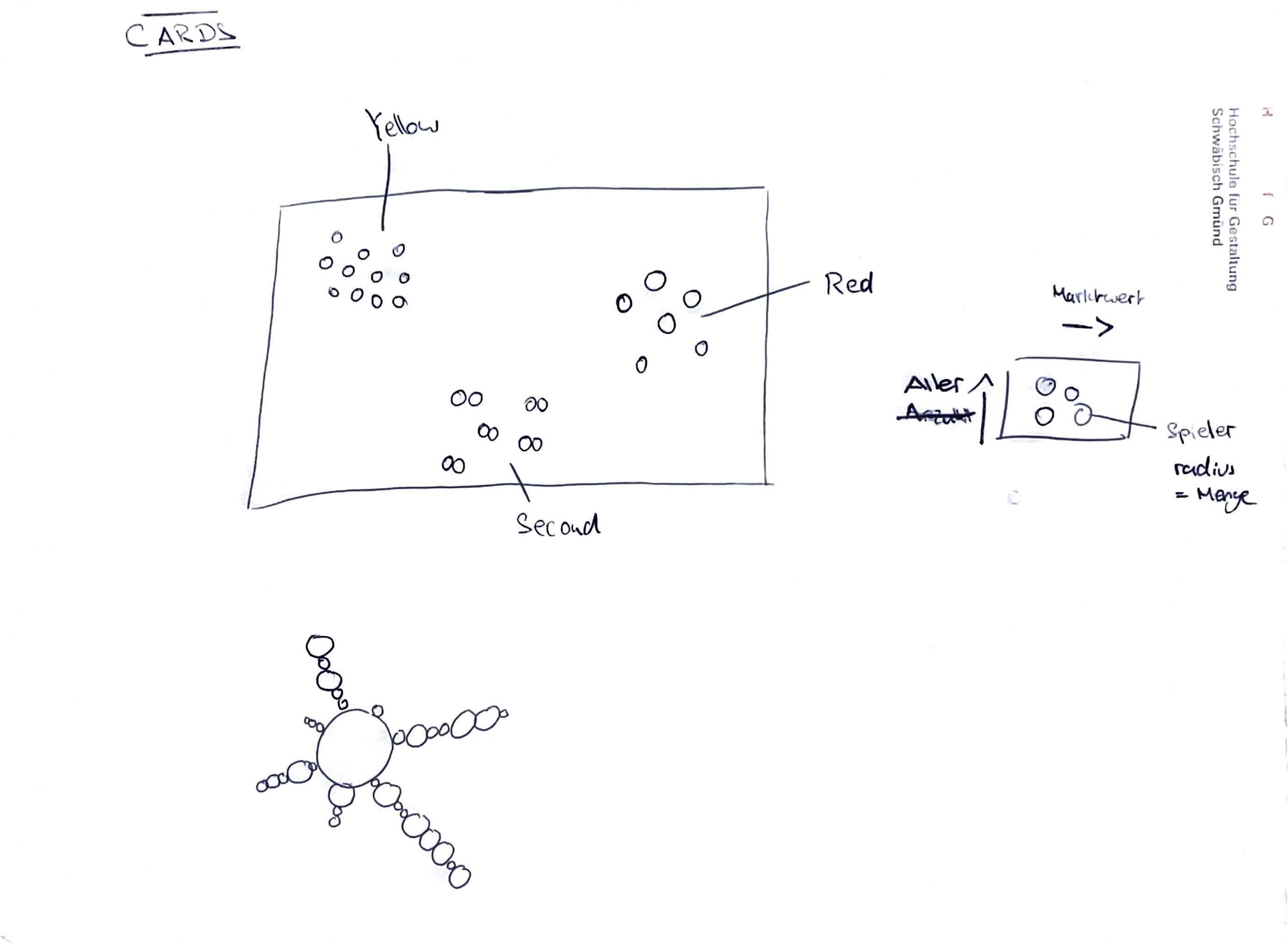 Meine letzte Idee war, eine Darstellung der gelben, zweiten gelben und roten Karten zu erstellen. Hierbei arbeite ich mit einem Koordinatensystem: Die Spieler werden durch Kreise symbolisiert, wobei die Höhe in y-Richtung das Alter und die Position in x-Richtung den Marktwert darstellt. Der Radius der Kreise spiegelt die Anzahl der Karten wider.