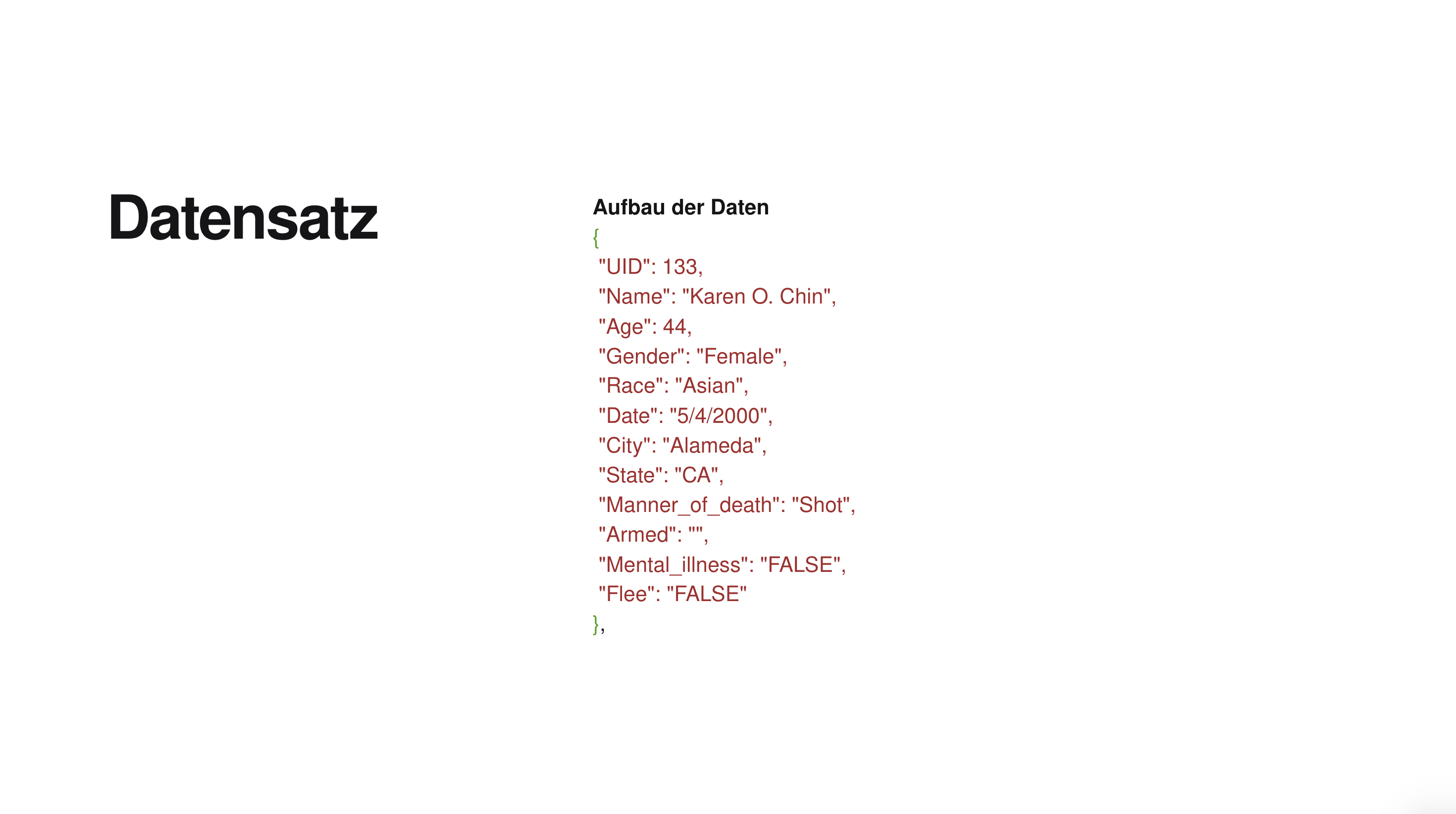Der Datensatz enthält Felder wie UID (eindeutige ID), Name, Alter, Geschlecht, ethnische Zugehörigkeit, Datum, Stadt und Bundesstaat für demografische und ortsbezogene Informationen. Weitere Felder sind Art des Todes, bewaffnet, psychische Erkrankung und Fluchtversuch, die Kontext und Umstände des Vorfalls beschreiben.
