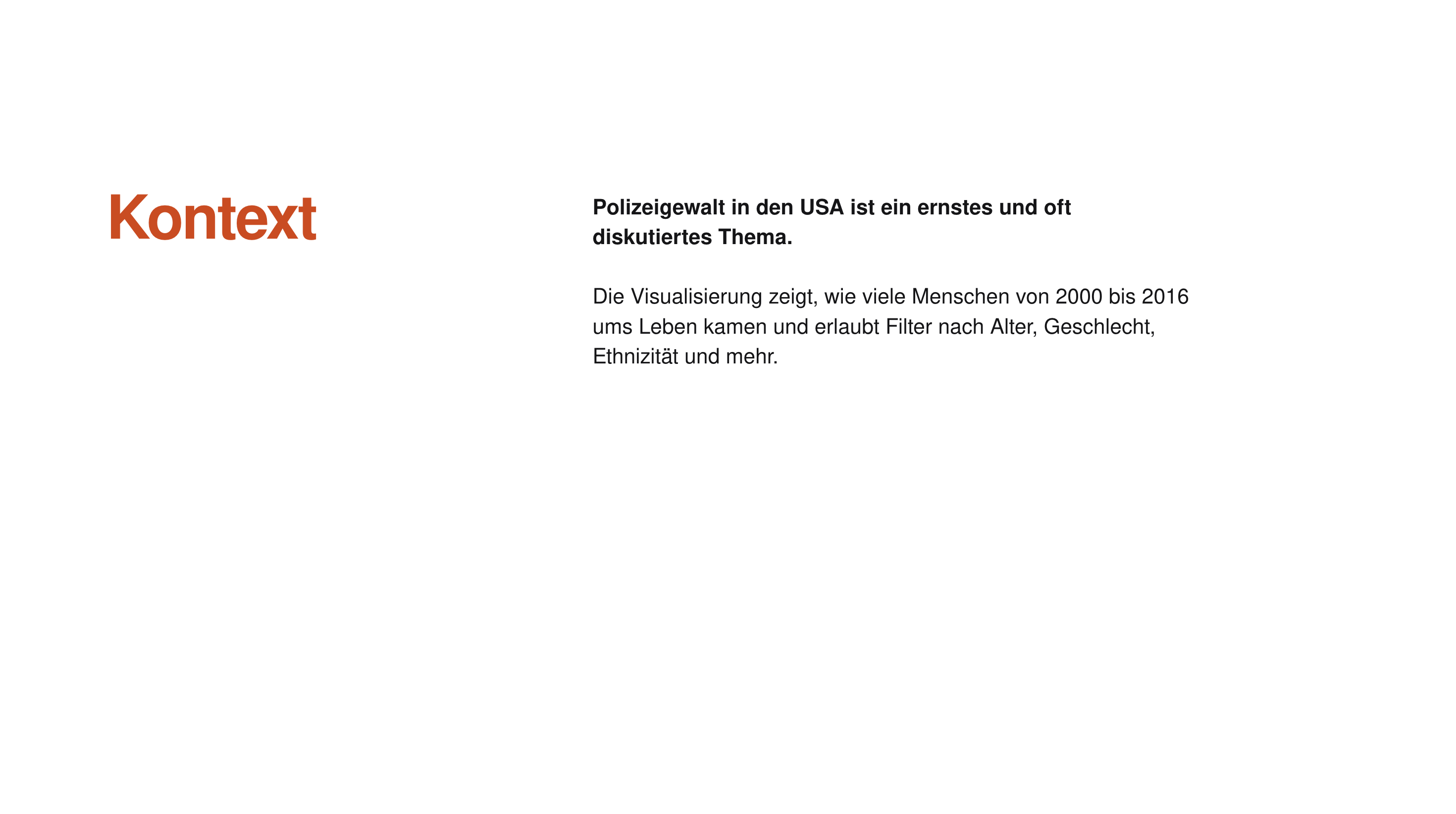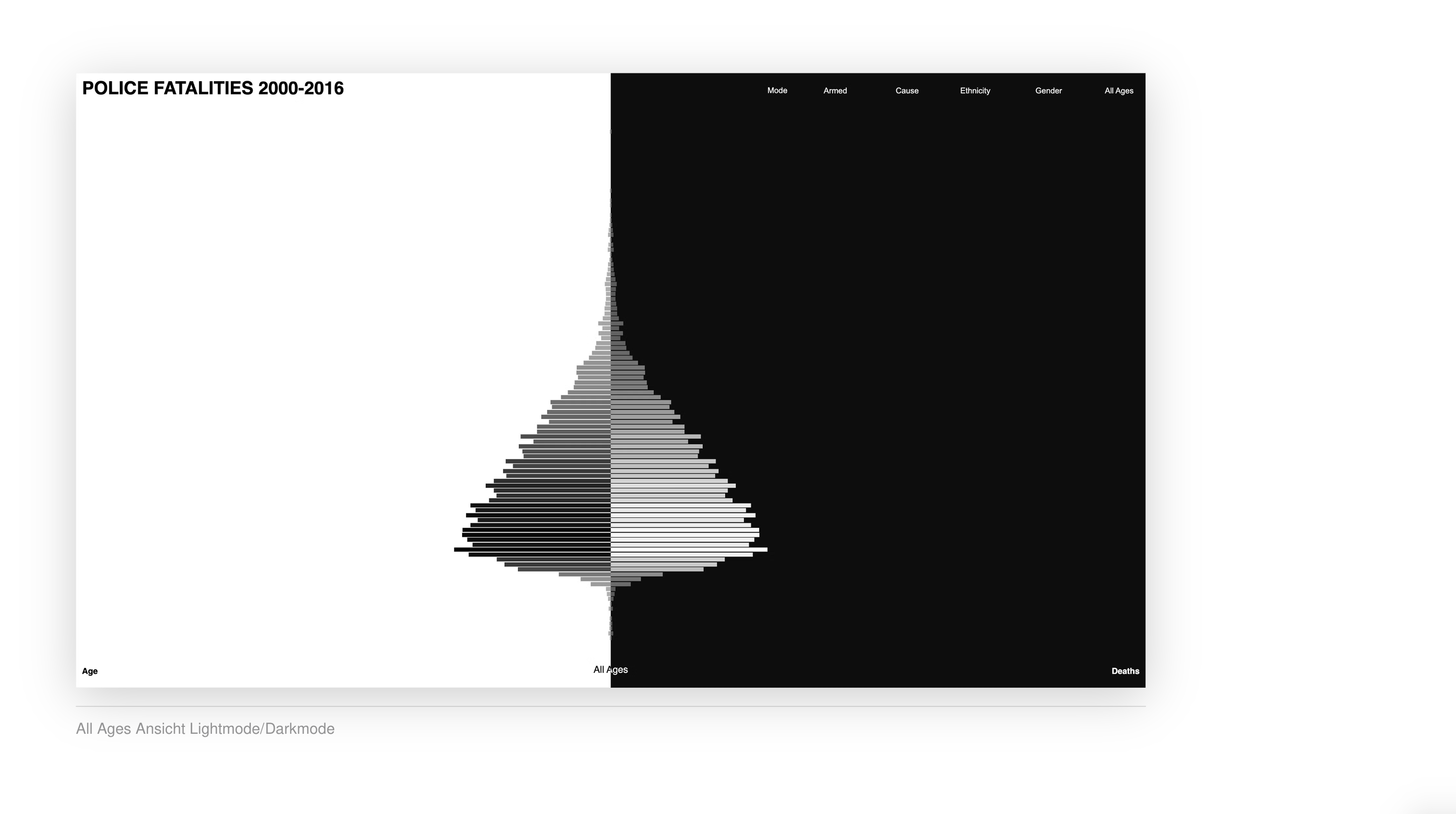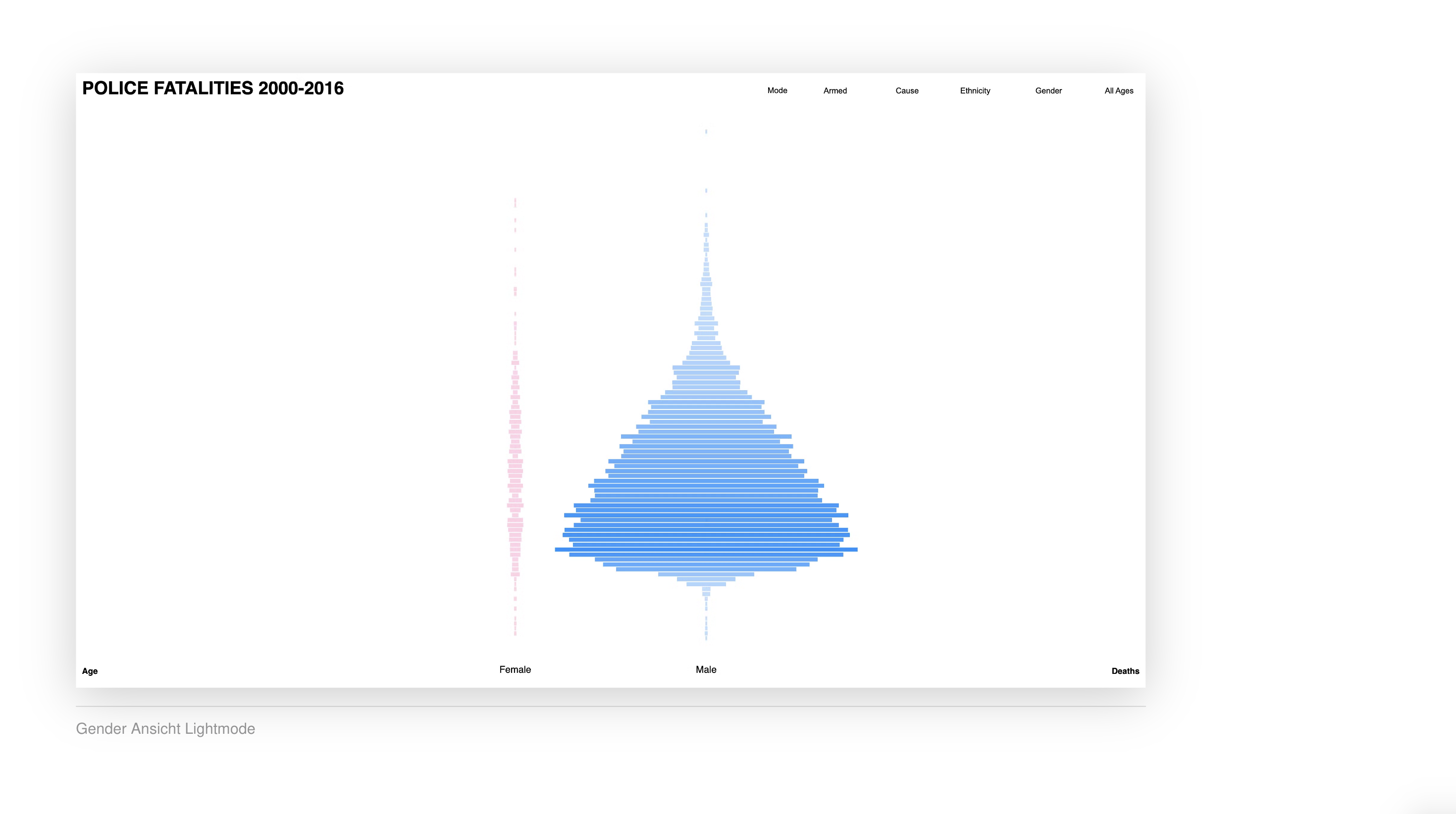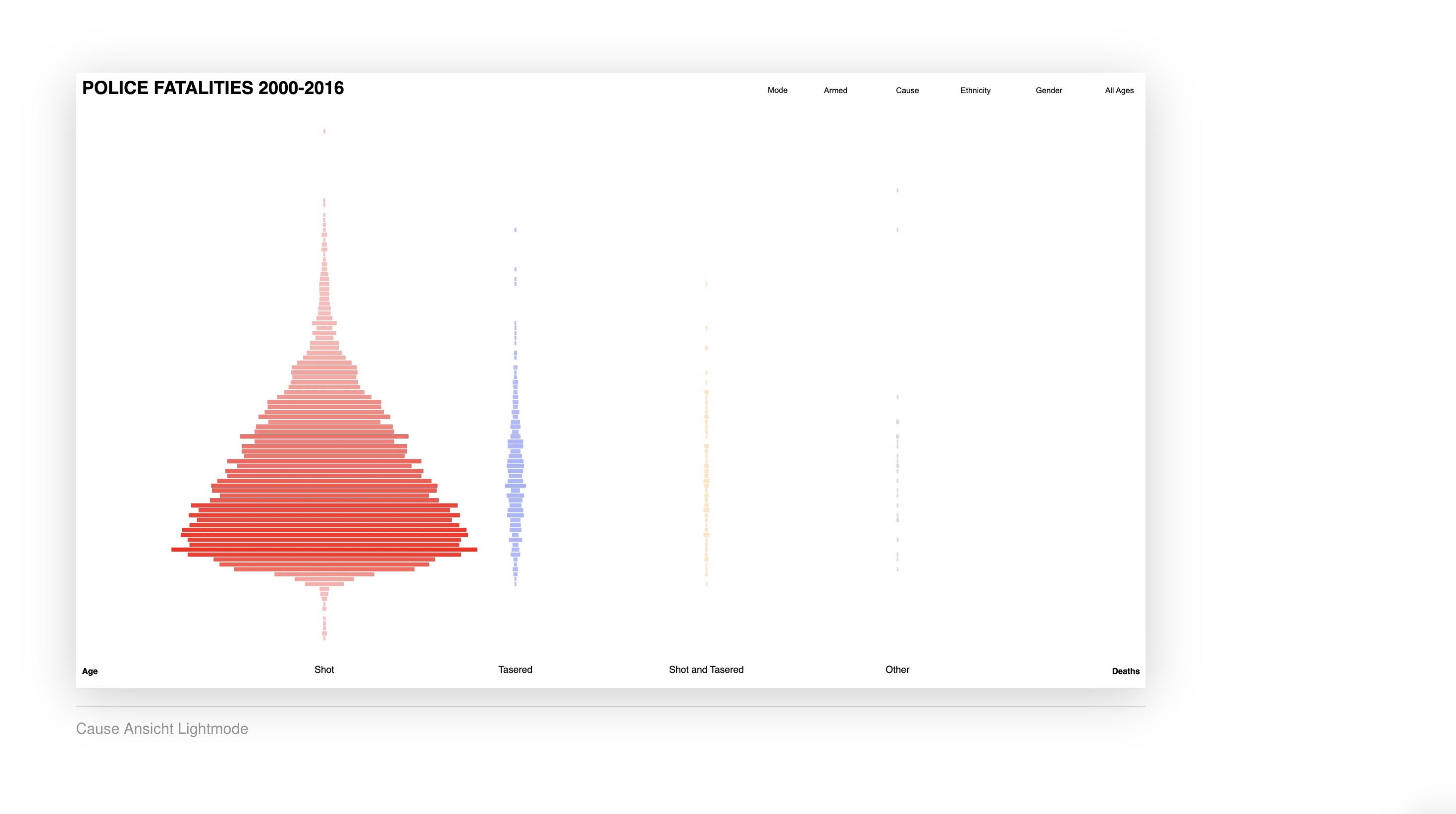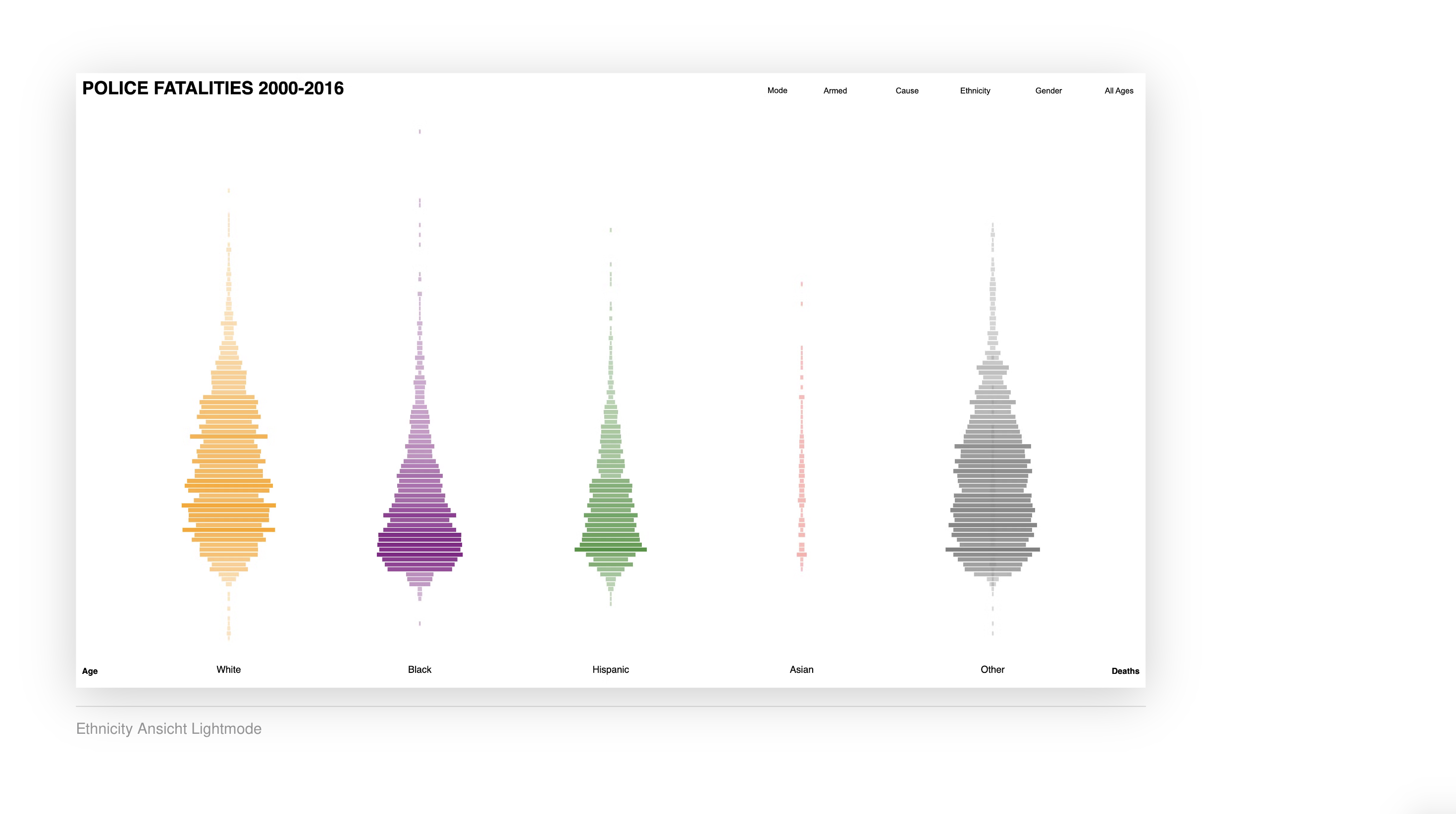 →Marlon MutluDie Visualisierung zeigt, wie viele Menschen von 2000 bis 2016 durch Polizeigewalt ums Leben gekommen sind und ermöglicht es, die Daten nach verschiedenen Kriterien zu filtern. Diese Kriterien umfassen Alter, Geschlecht und Ethnizität der Opfer sowie weitere relevante Merkmale. Durch diese Filtermöglichkeiten können spezifische Muster und Trends in den Daten erkannt werden, was eine tiefere Analyse der Problematik ermöglicht.