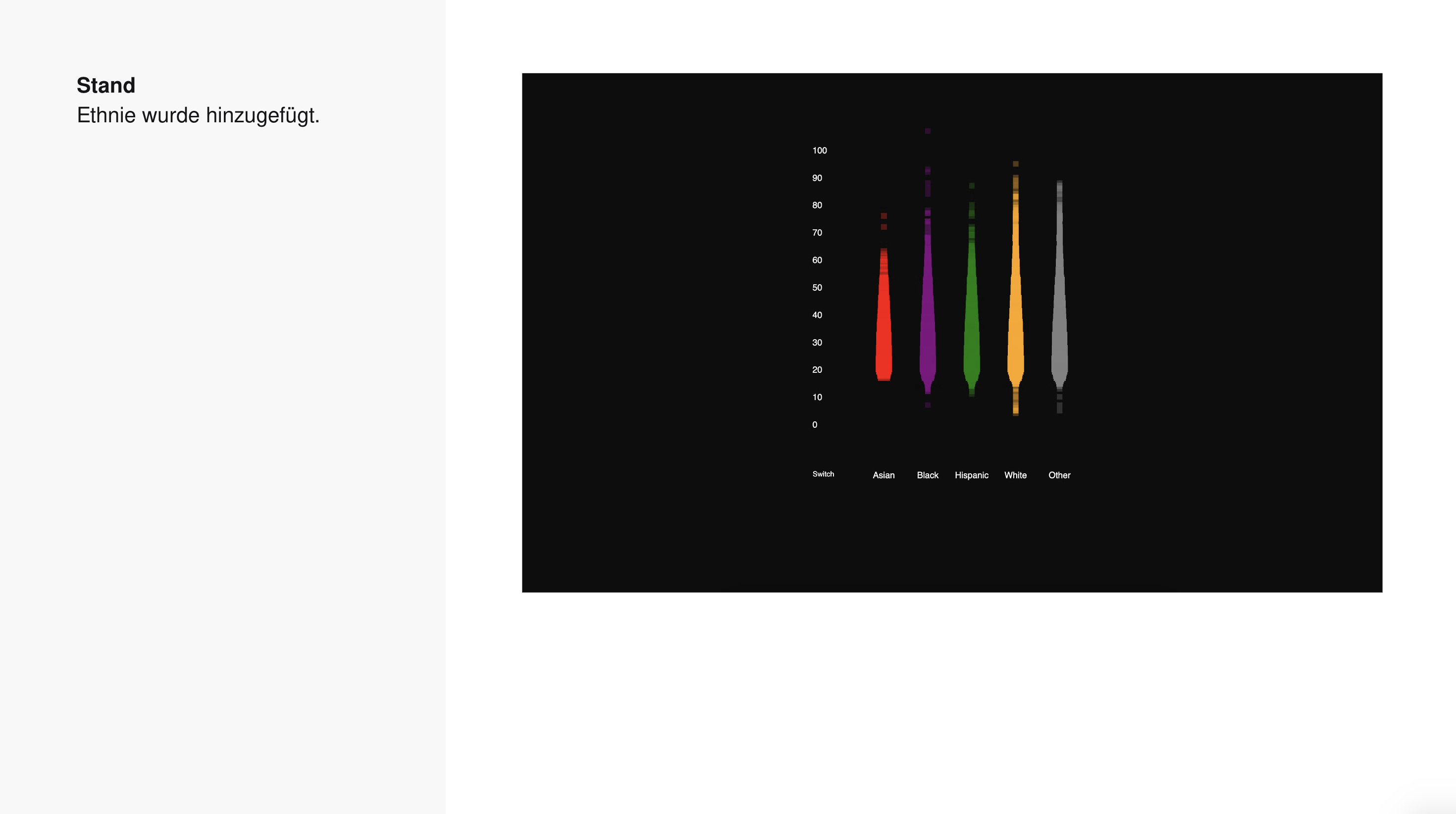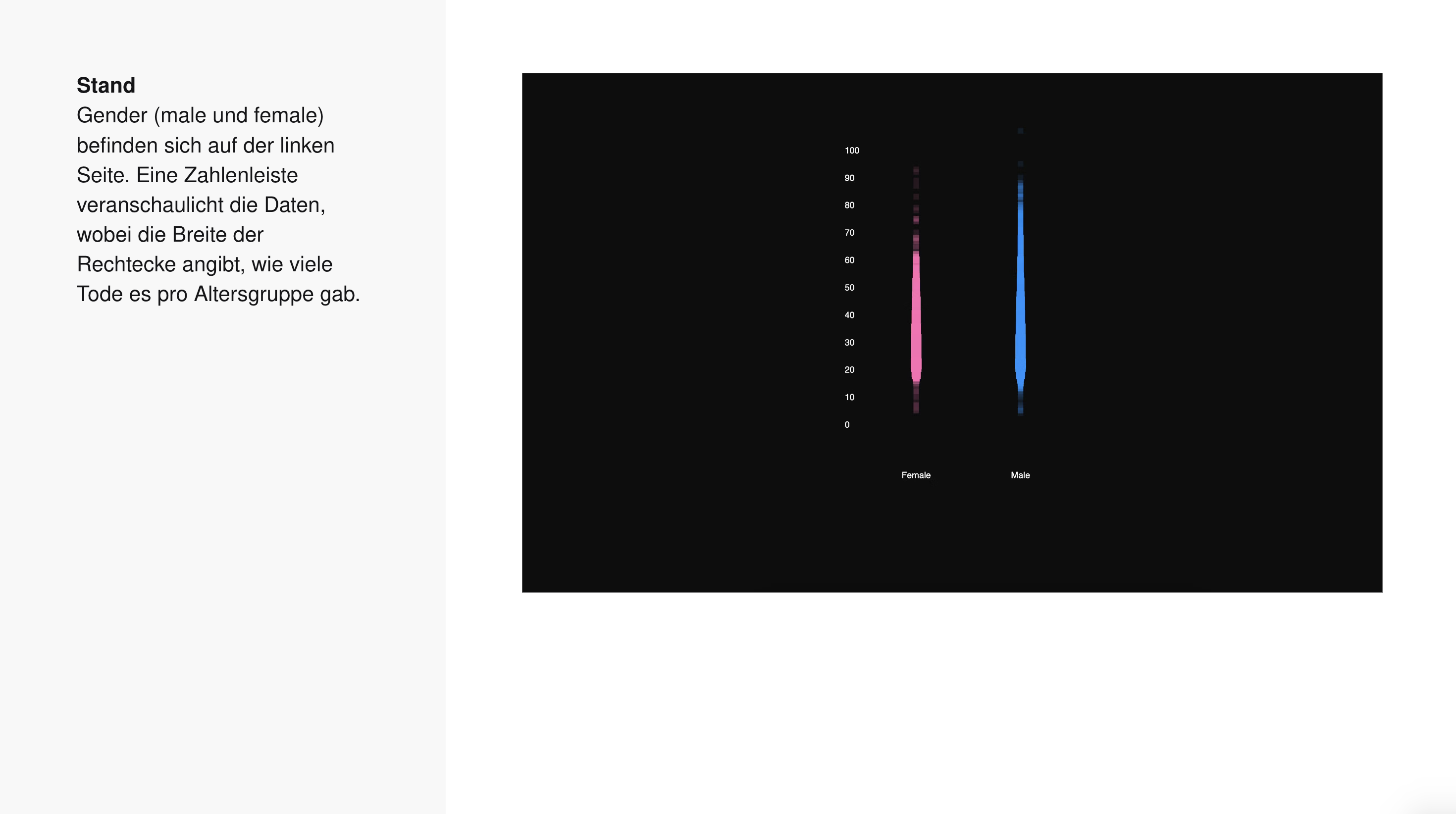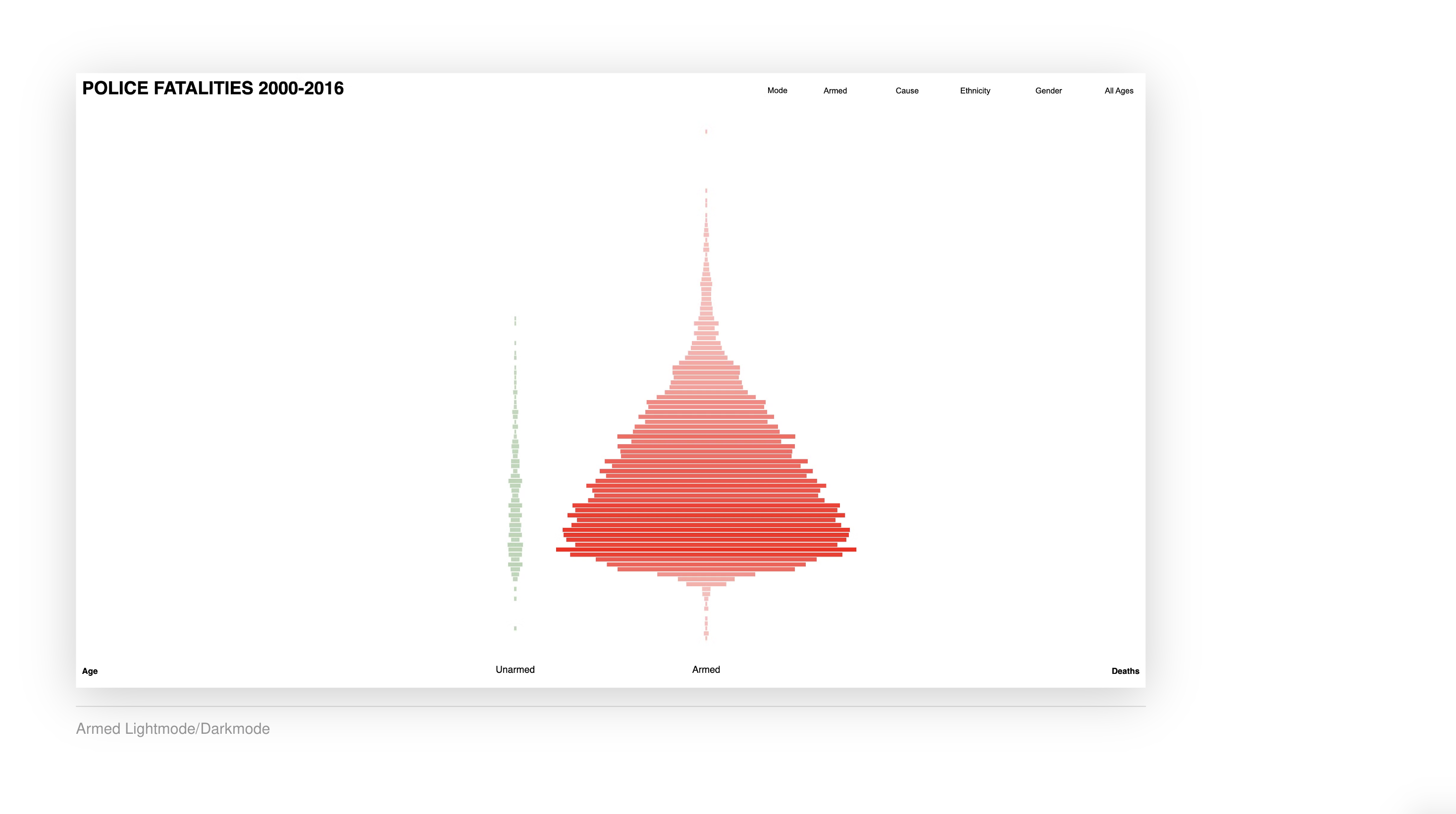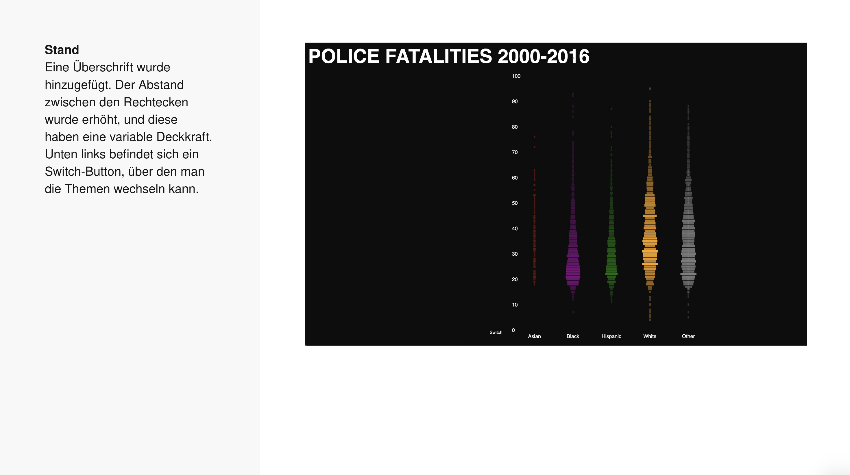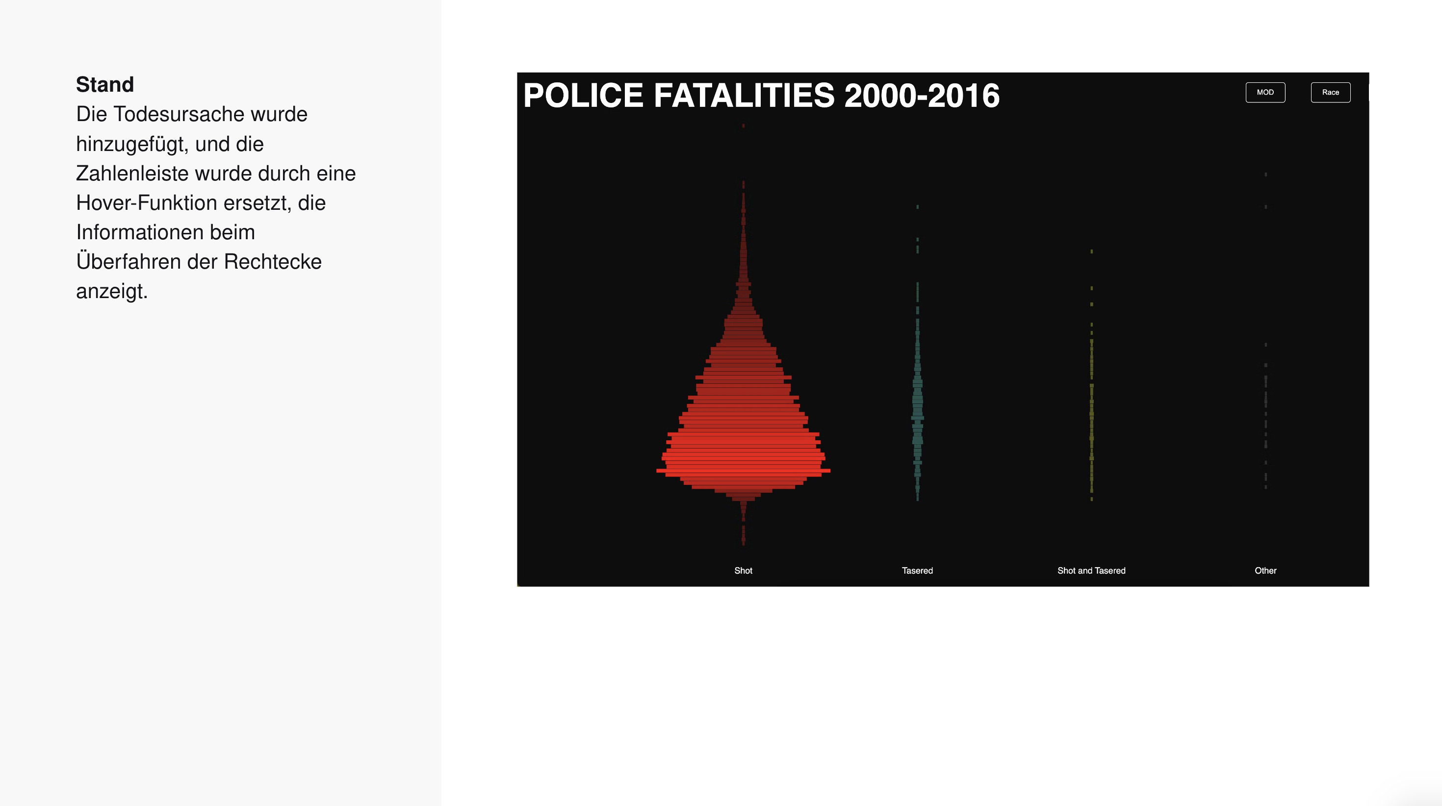 →Marlon MutluDie Visualisierung zeigt, wie viele Menschen von 2000 bis 2016 durch Polizeigewalt ums Leben gekommen sind und ermöglicht es, die Daten nach verschiedenen Kriterien zu filtern. Diese Kriterien umfassen Alter, Geschlecht und Ethnizität der Opfer sowie weitere relevante Merkmale. Durch diese Filtermöglichkeiten können spezifische Muster und Trends in den Daten erkannt werden, was eine tiefere Analyse der Problematik ermöglicht.