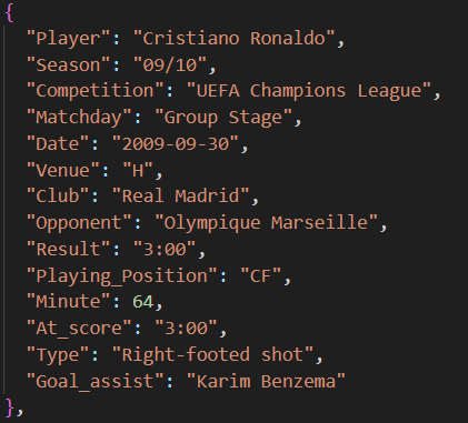 Der Datensatz besteht aus 1413 Einträgen, jeder Eintrag ist ein Tor, es sind alle Tore, die Messi und Ronaldo auf Vereinsebene bis März 2023 geschossen haben, der Datensatz ist von Kaggle und hat 14 Spalten, von denen ich die folgenden verwendet habe: “Player” “Matchday” “Venue” “Result” “Minute” “Type”