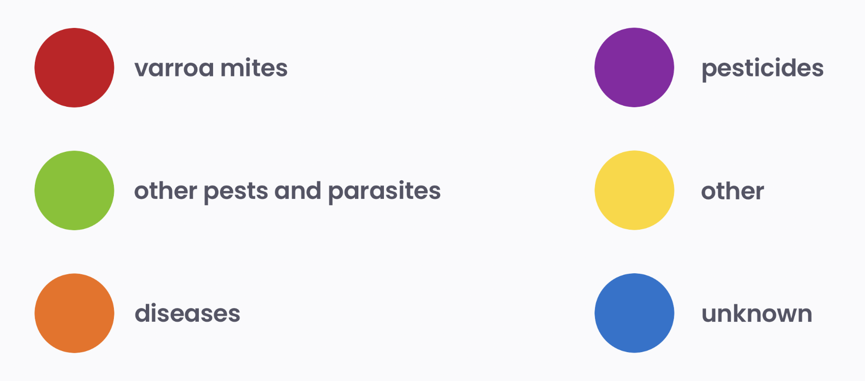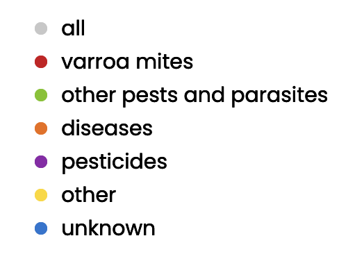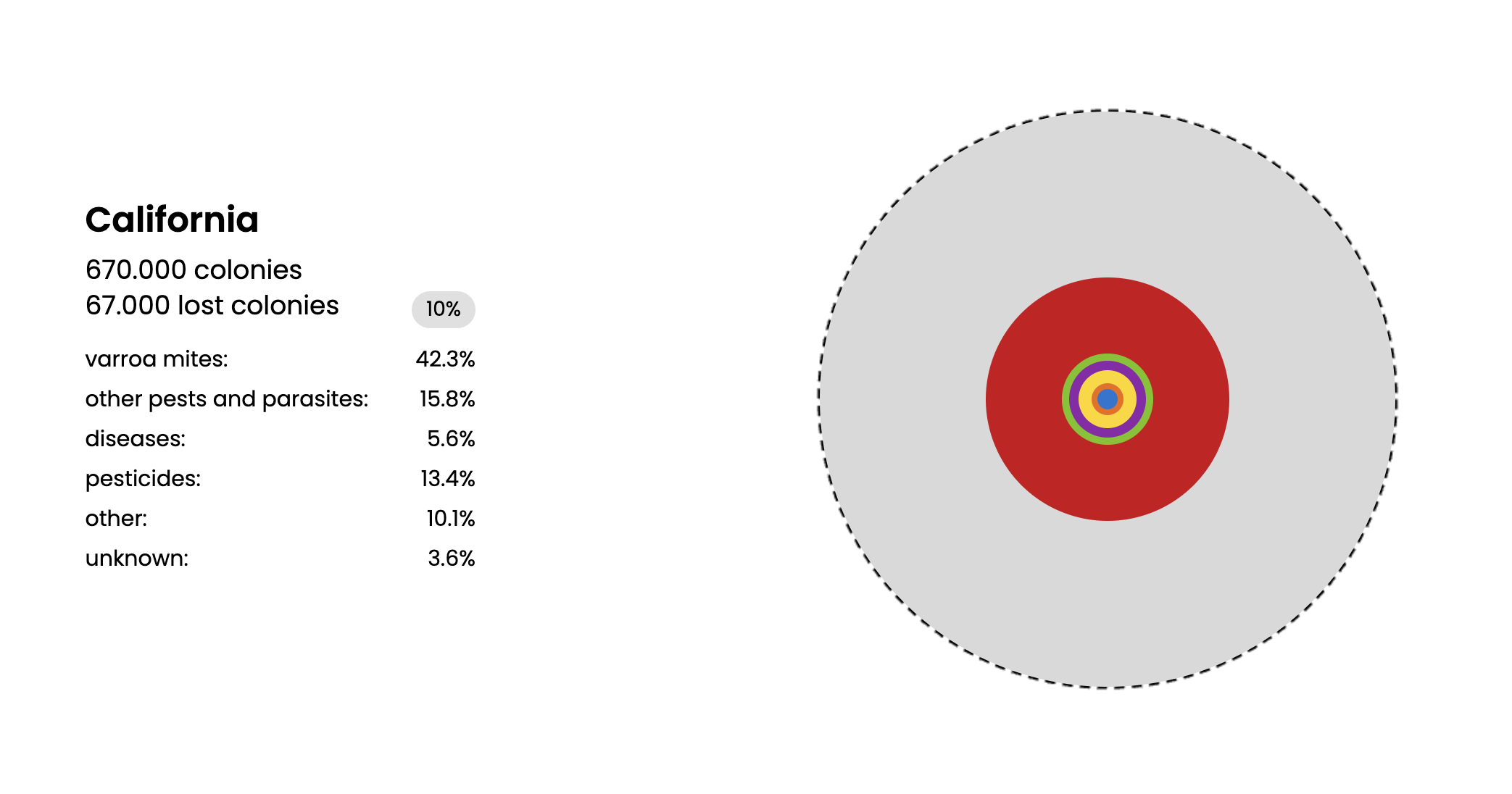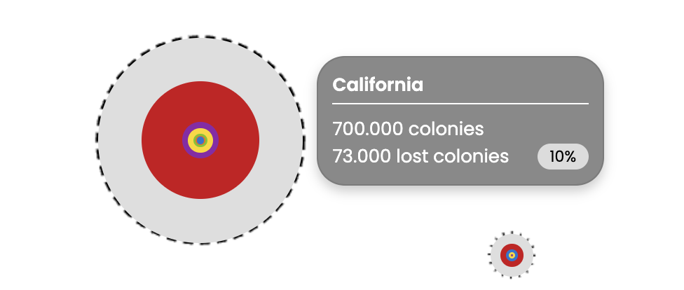 Beim Hovern über einen Punkt bekommt der User in einem Label Informationen über den Staat, die Anzahl der Kolonien, sowie über die Zahl und Prozentzahl der gestorbenen Bienenkolonien.