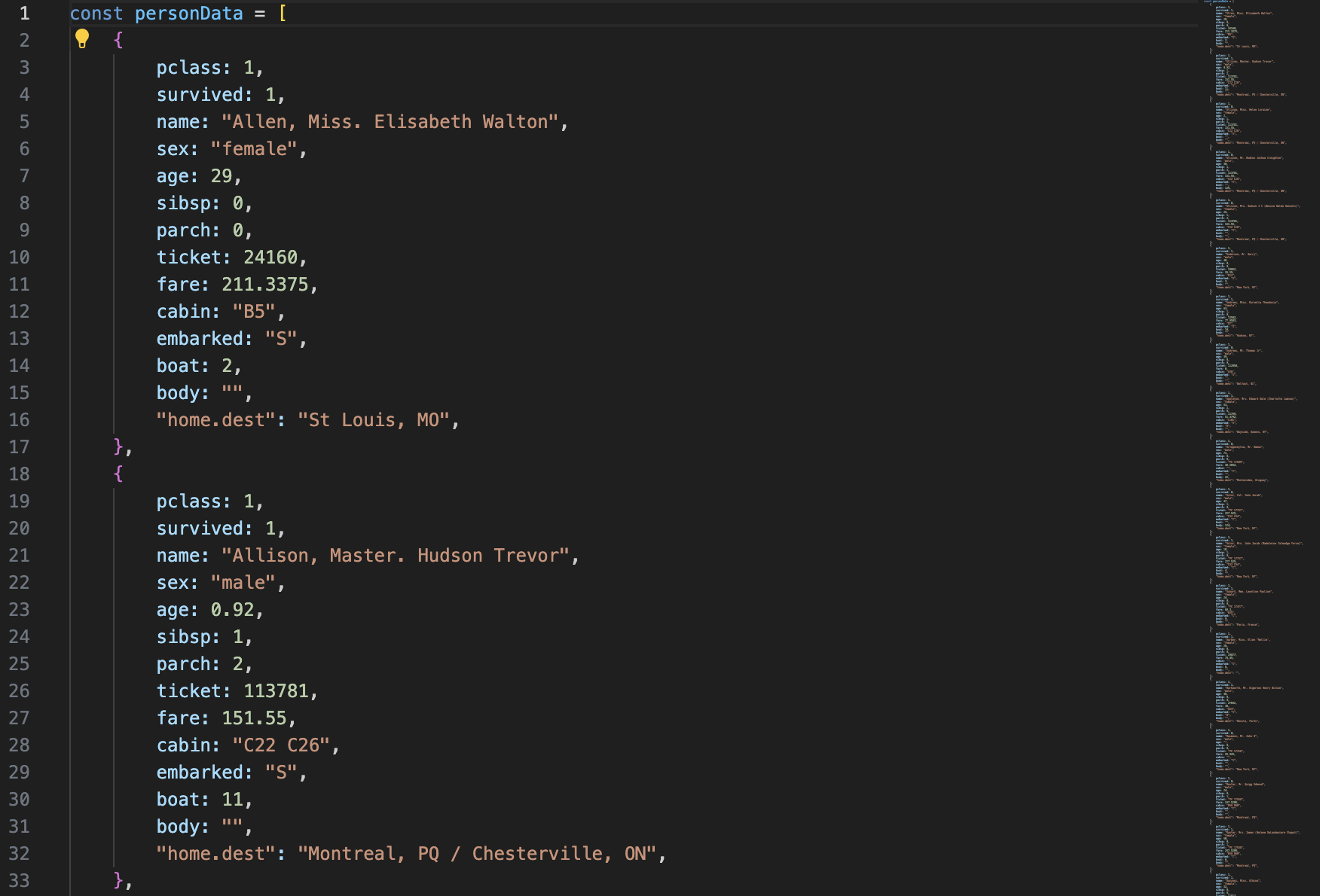 Nicht für alle Passagiere, die im Datensatz aufgeführt sind, sind alle Werte vorhanden und können ausgelesen werden. Daher habe ich mich dazu entschieden, die Werte für die Datenvisualisierung zu nutzen, die am vollständigsten sind. Diese Werte beziehen sich auf das Alter, die Namen, den Überlebensstatus, das Geschlecht und die Bordklasse der Passagiere. Durch die Reduzierung habe ich letztendlich versucht, die Eigenschaften von 1046 Passagieren zu visualisieren.