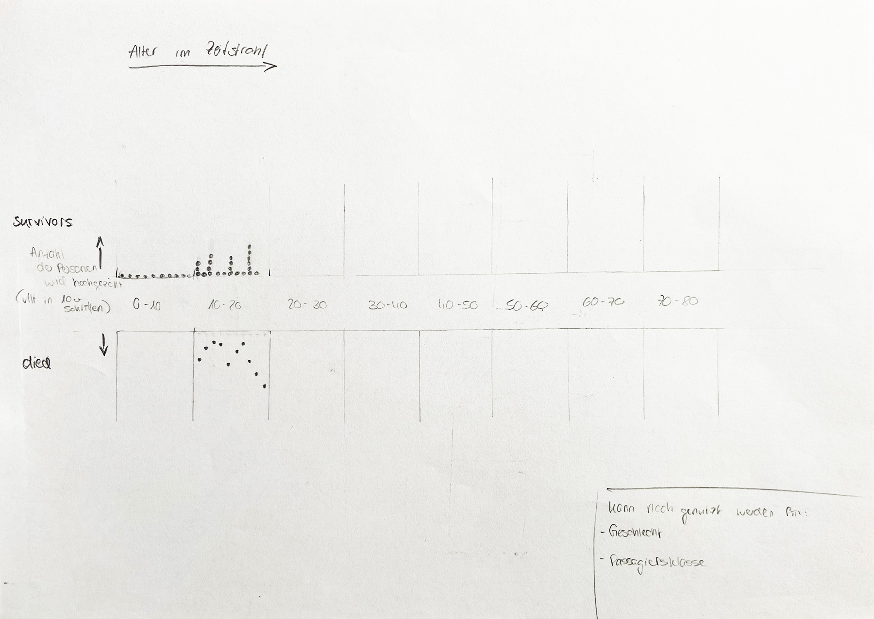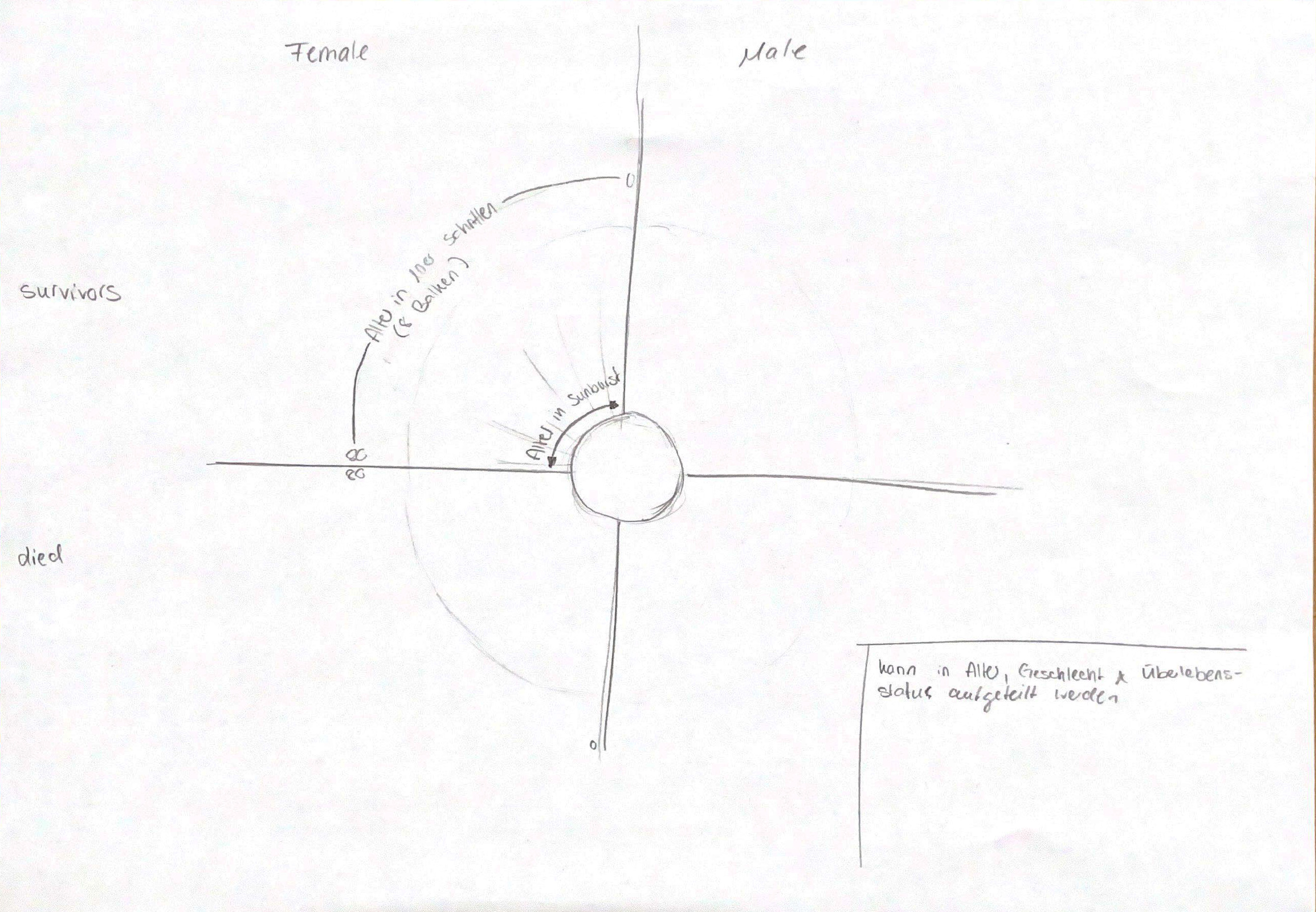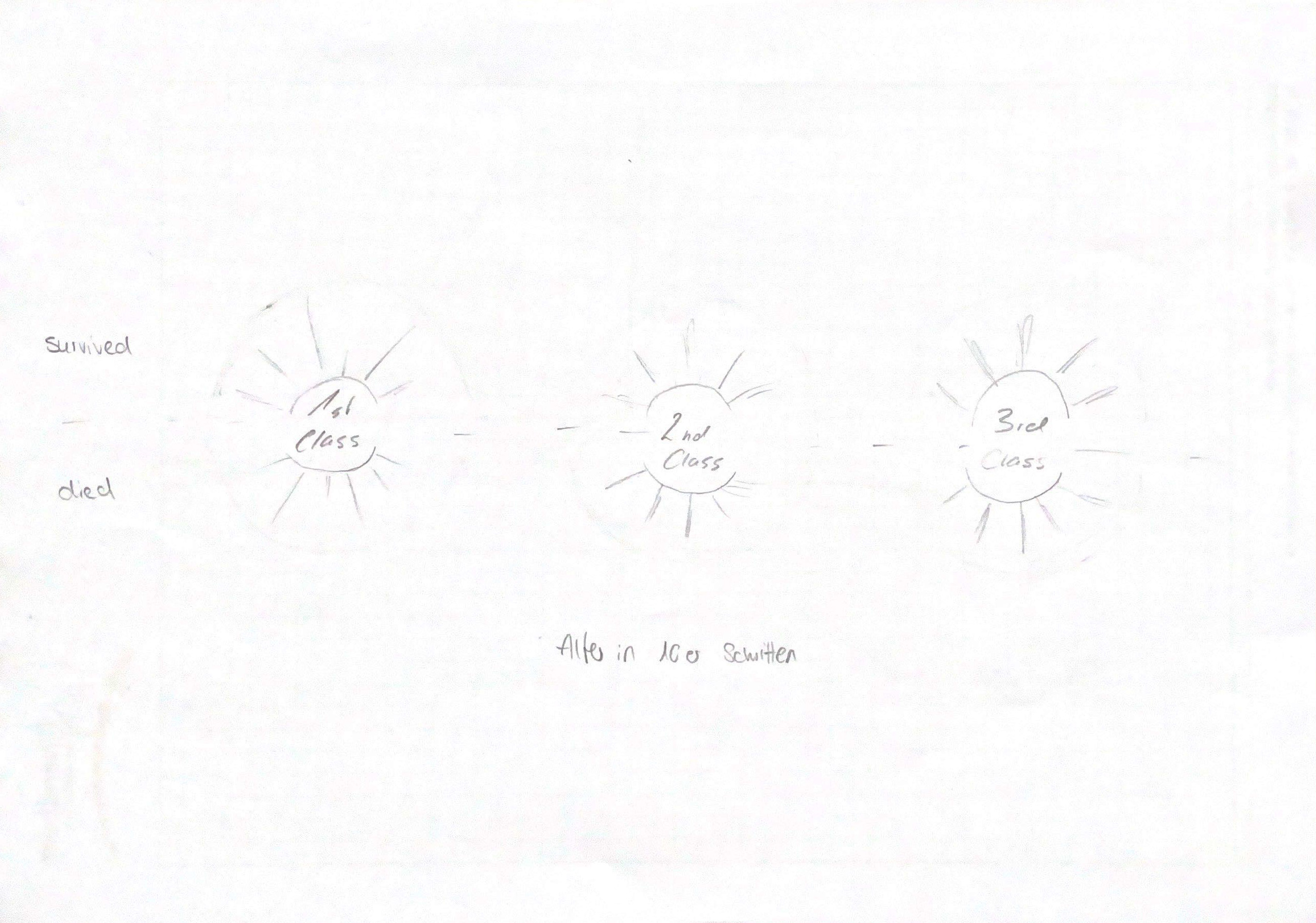 Meine erste Idee war es, die Passagiere in ihren drei Klassen kreisförmig darzustellen. In der jeweiligen oberen Hälfte sollten die Überlebenden dargestellt werden, in der unteren die Verstorbenen. Zudem sollten von jedem dieser drei Diagramme Balken nach außen hin gezeichnet werden, die die Passagiere in Altersgruppen in 10er-Schritten unterteilen.
