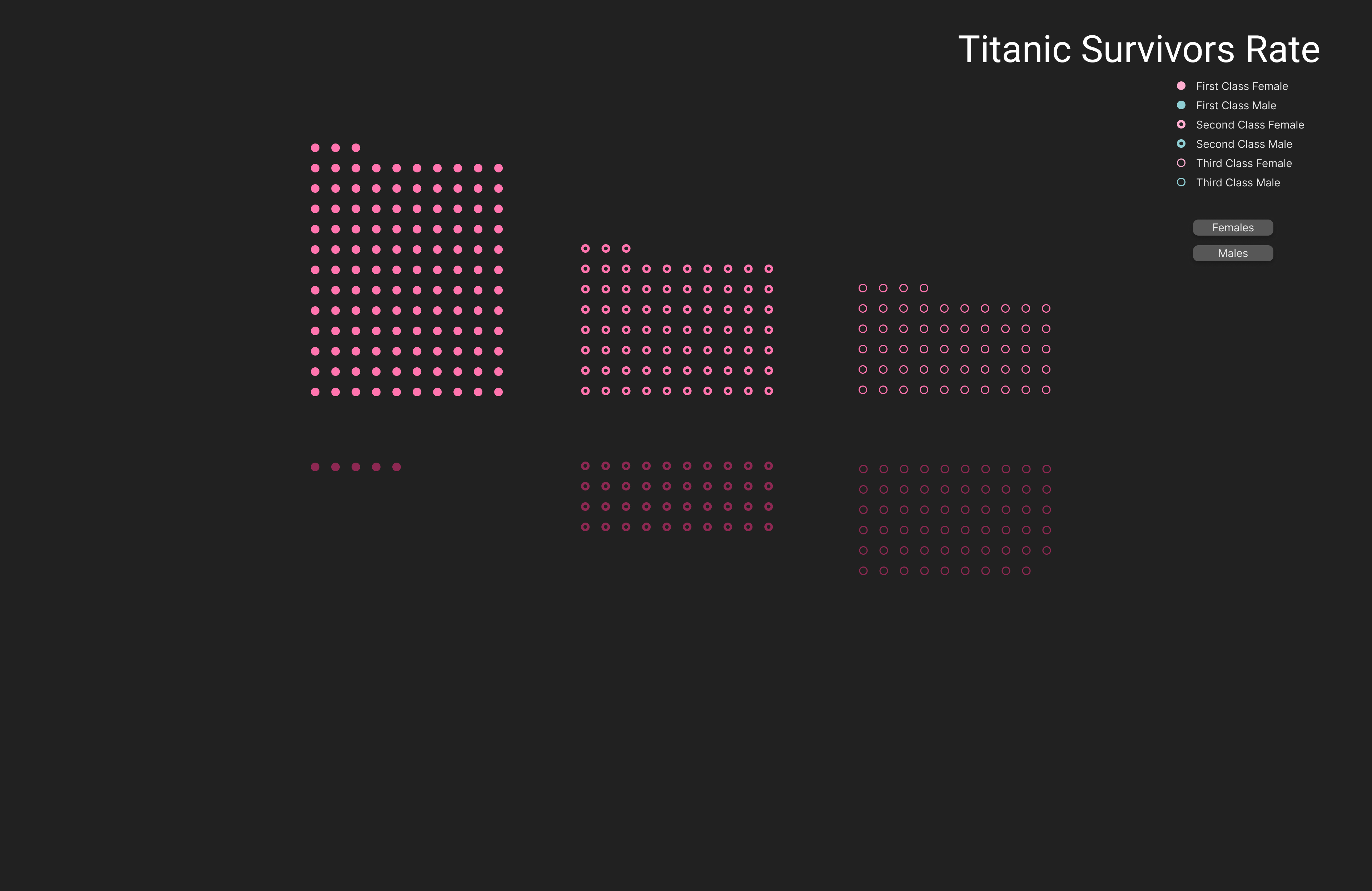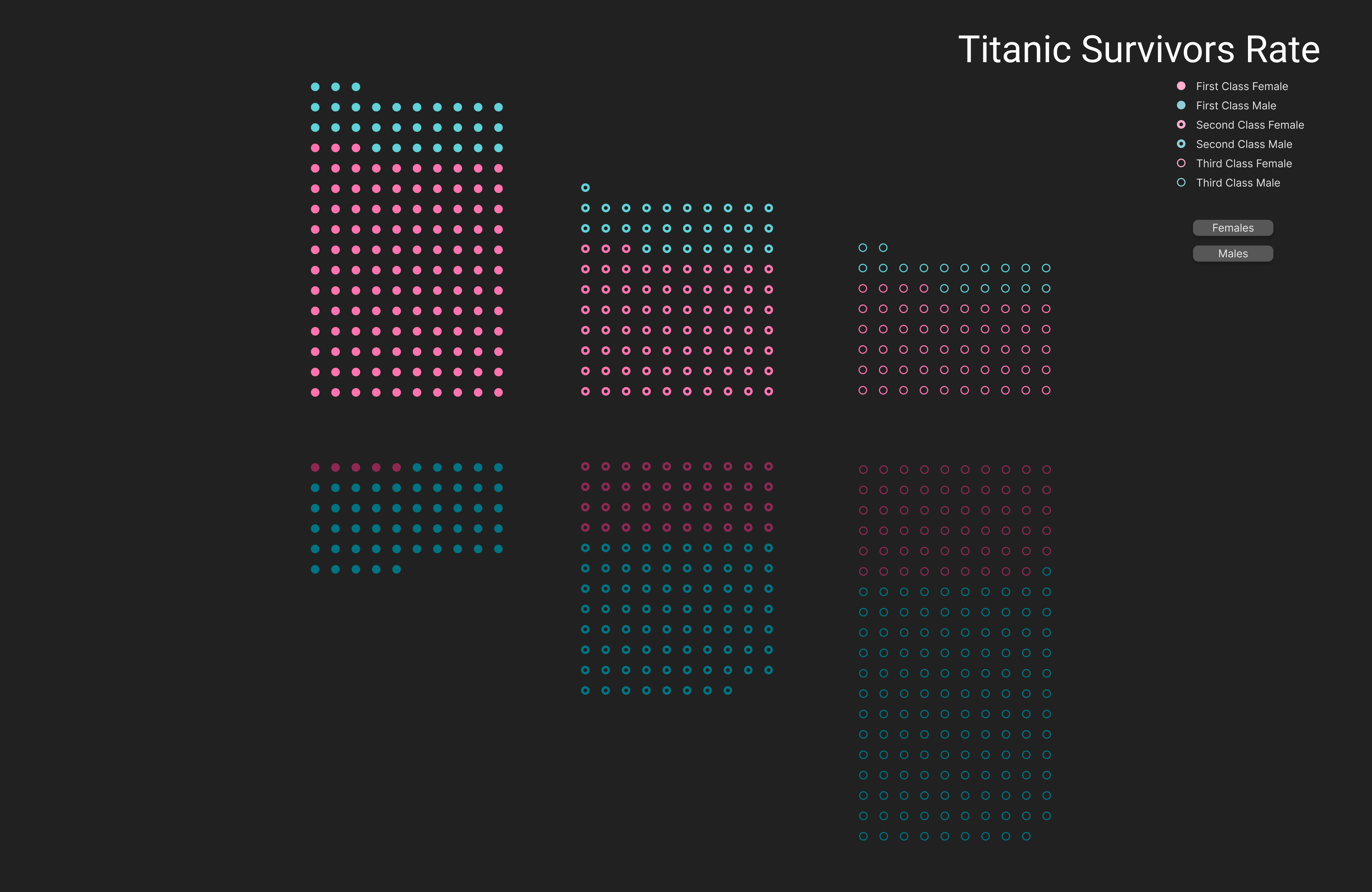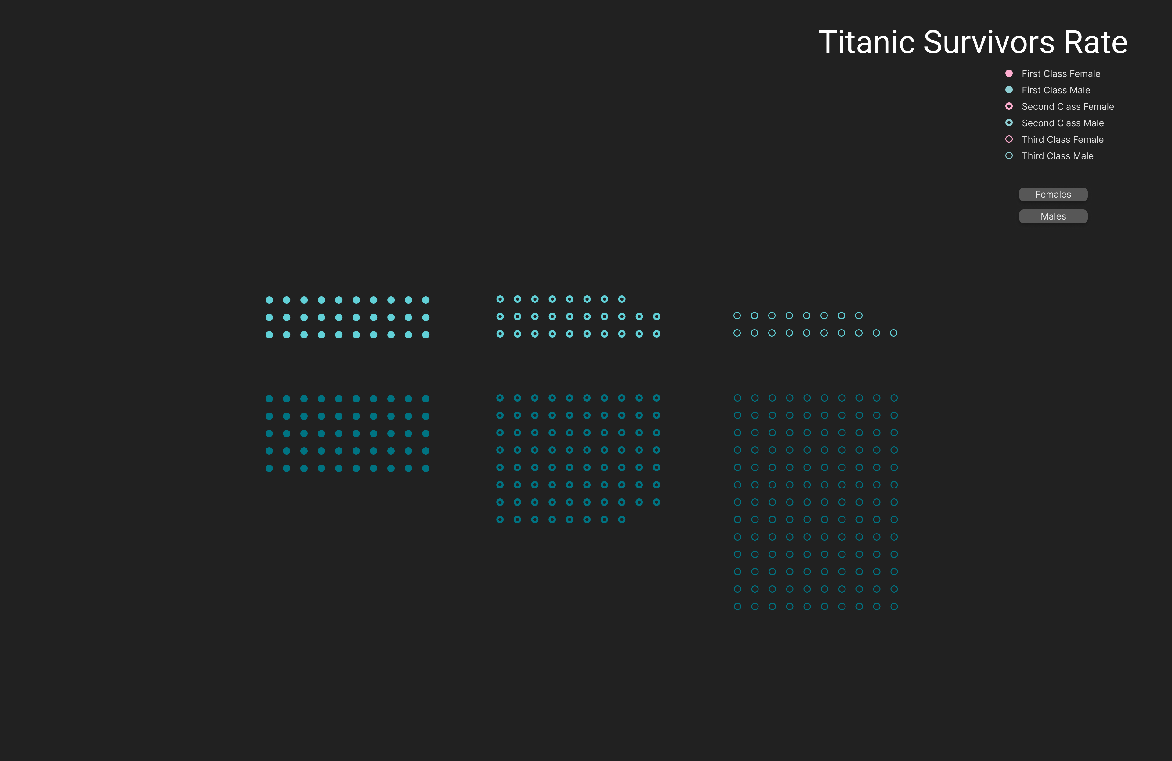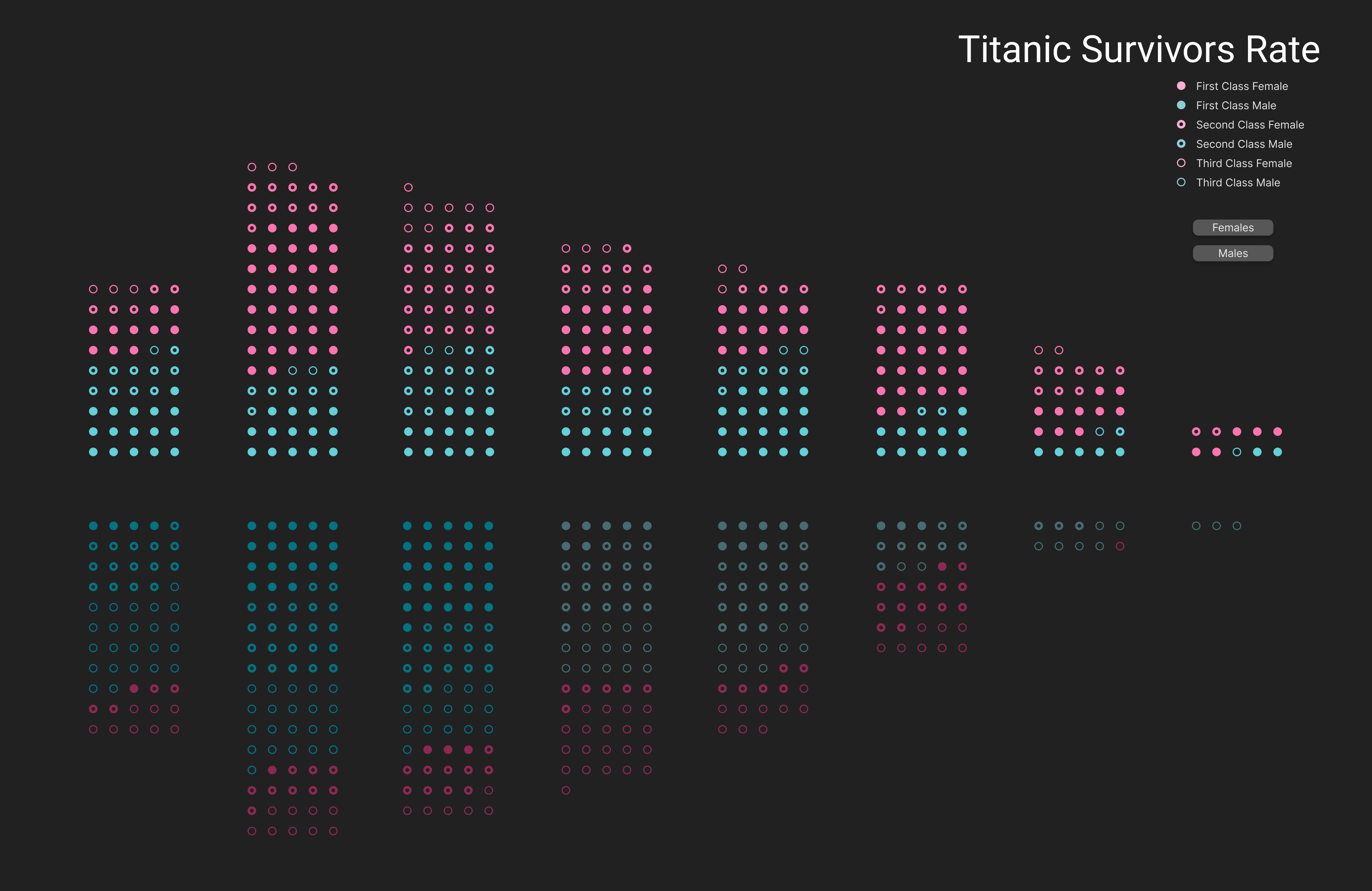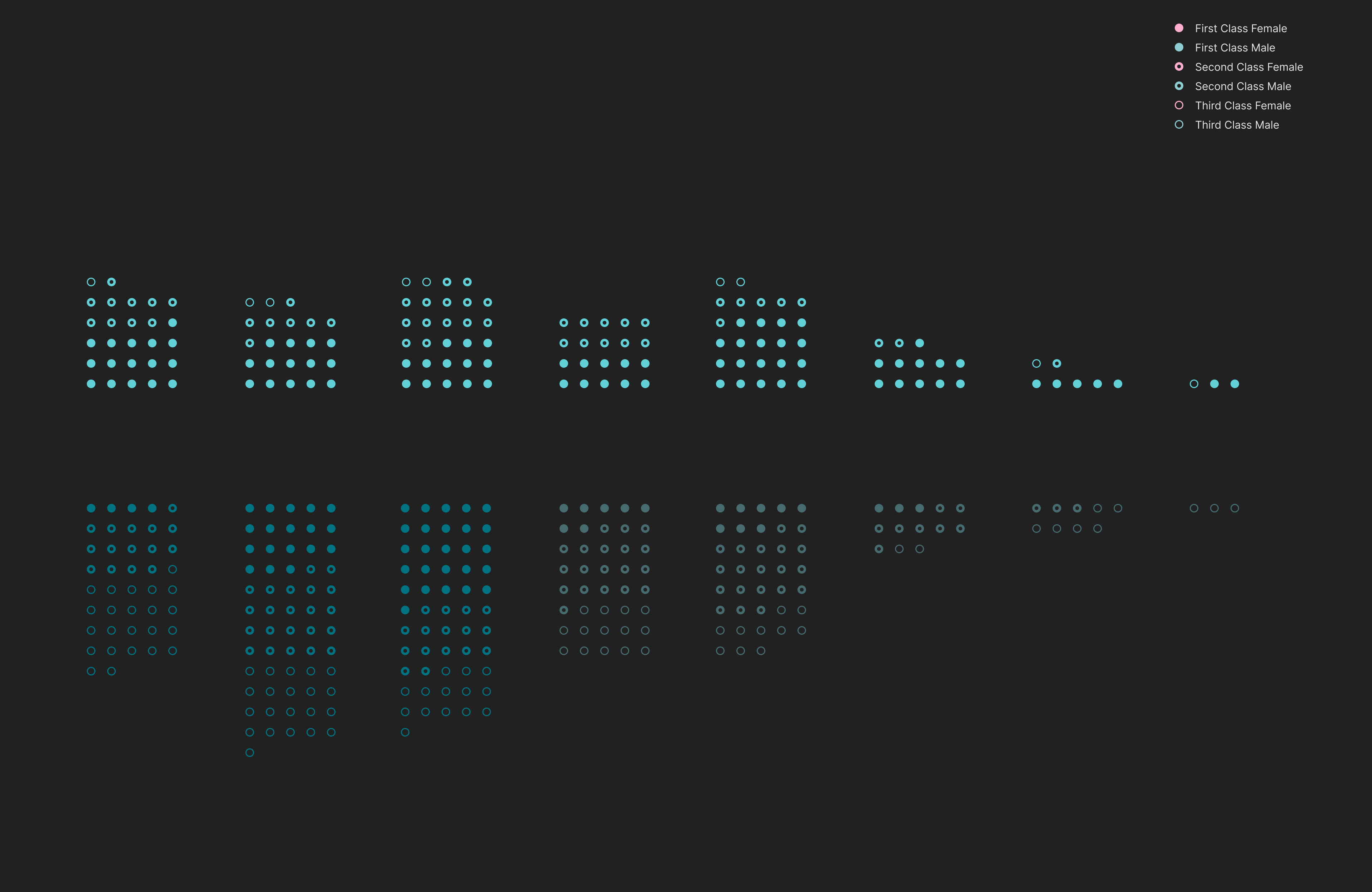 Mithilfe der Anordnung soll sowohl das Alter als auch der Überlebensstatus der Passagiere aufgezeigt werden. Wie bereits beschrieben, sind die Punkte bzw. Passagiere hier in Altersgruppen unterteilt. Zwischen den oberen und unteren Balken ist eine Trennung zu erkennen. Diese soll den Meeresspiegel darstellen und damit auch anzeigen, ob die Passagiere überlebt haben oder nicht. Punkte, die oberhalb des “Trennstrichs” gezeichnet sind, bedeuten, dass die Passagiere überlebt haben. Punkte, die unterhalb gezeichnet werden, zeigen das Gegenteil.
